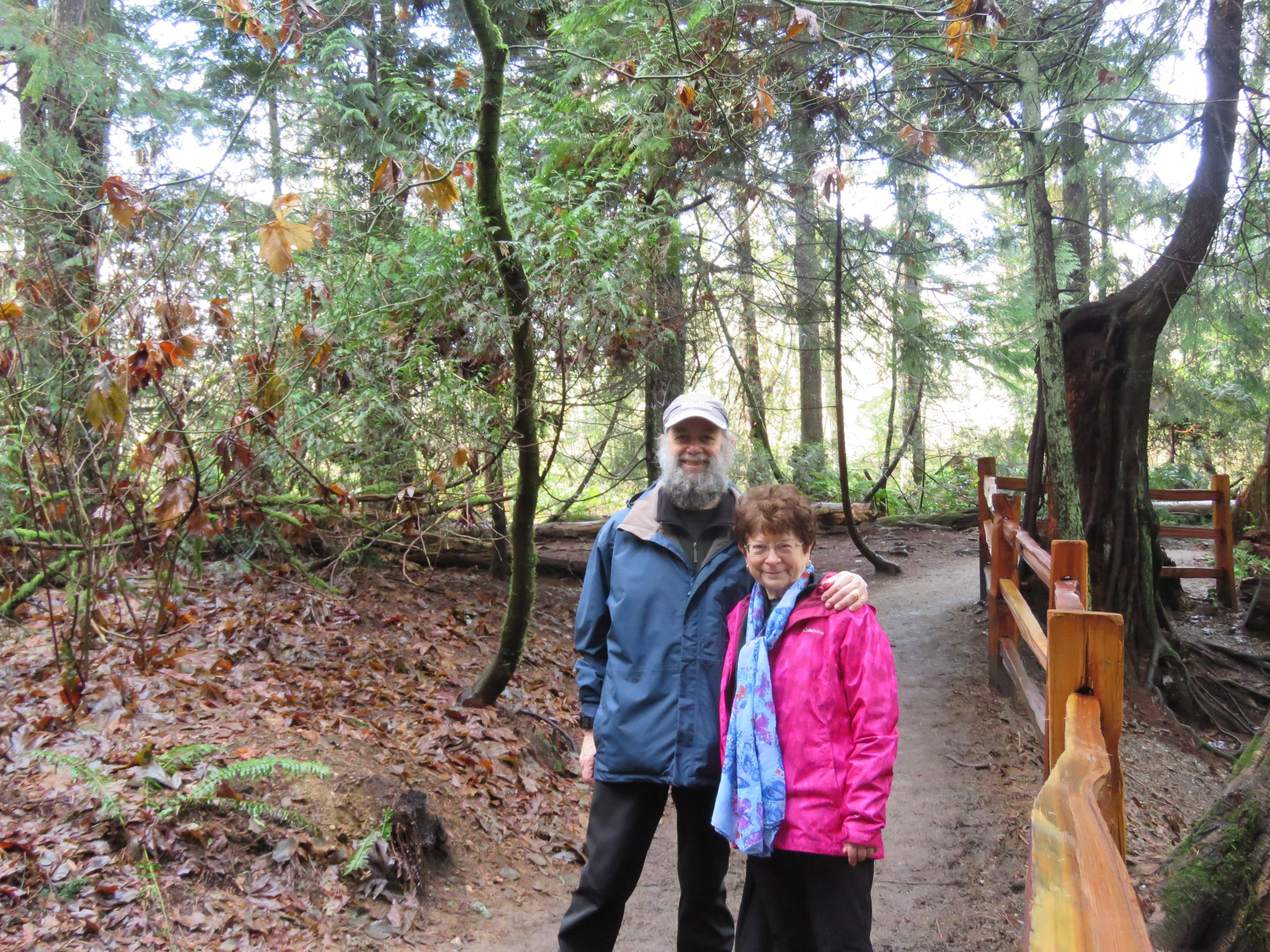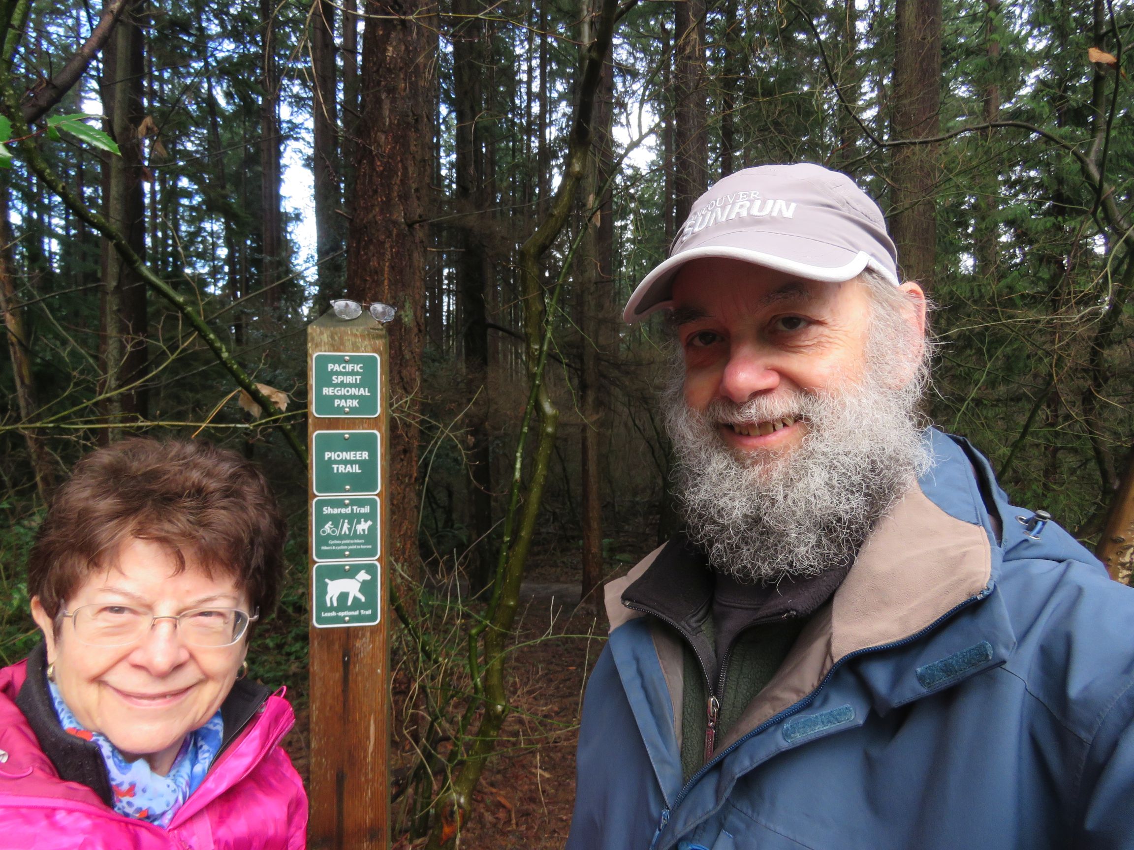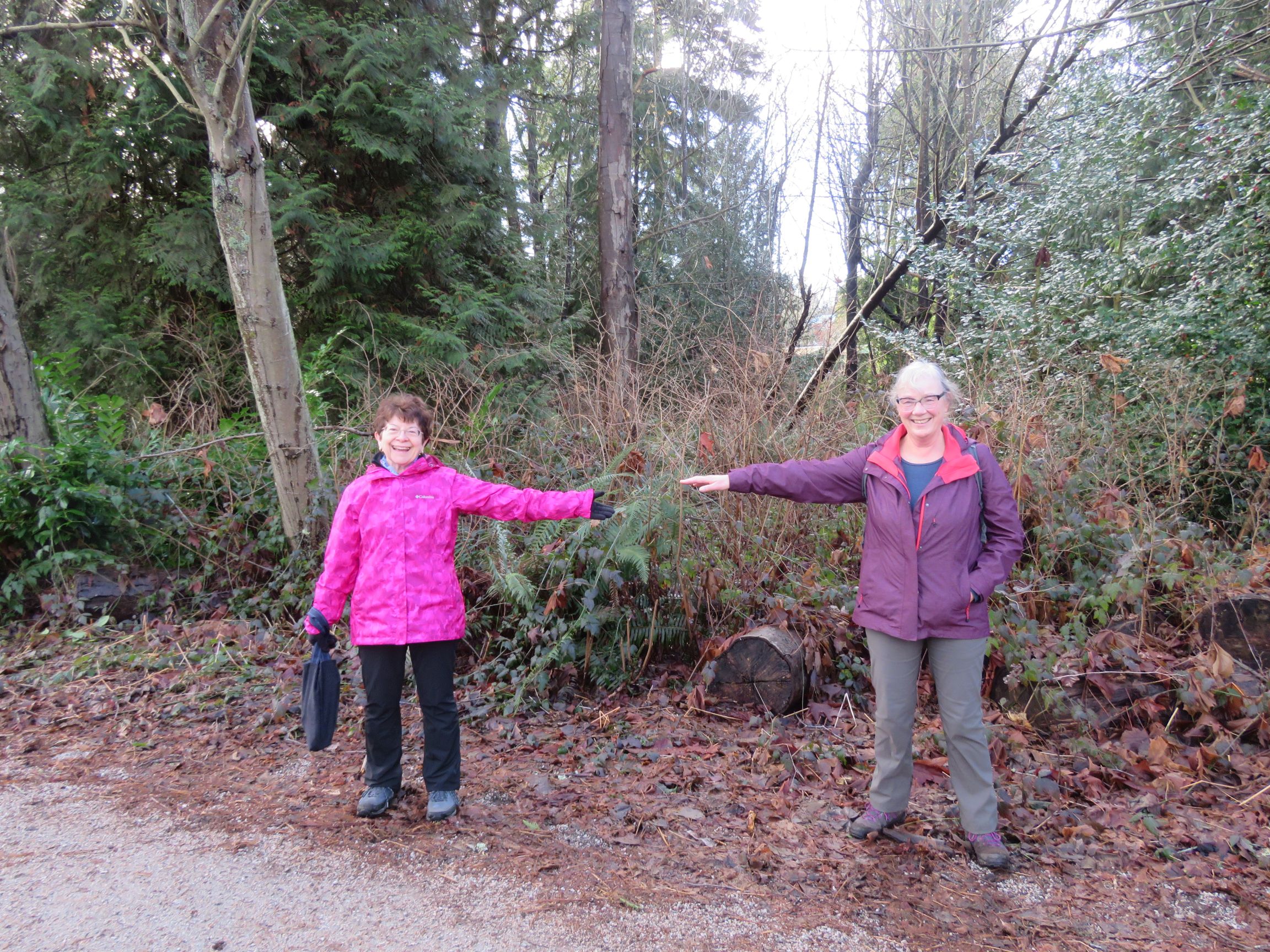 We did the Loopers Fraserview Trails walk. We chose the route partly to escape the anticipated North Shore rain and partly to allow Angela to experience the route, as she was out of town for the group walk last February. There were lots of trees, but it wasn’t dense forest: more of a mix of trails (with lots of muddy puddles, as mentioned by others), urban streets, and the path along the river.