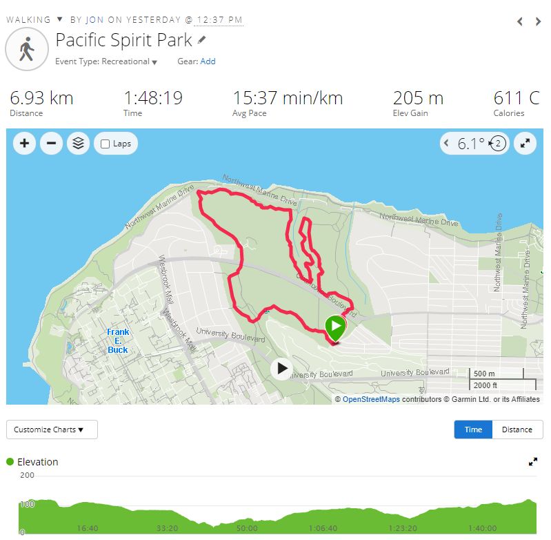 I walked from home to Pacific Spirit Park. I went along the Admiralty Trail in the north of the park, and then headed south. I had been wondering if I would bump into any of my Kits neighbours, and indeed I did see Liz and Jon on the trail, a very nice surprise. I meandered through the park to Camosun Bog, and then headed home.