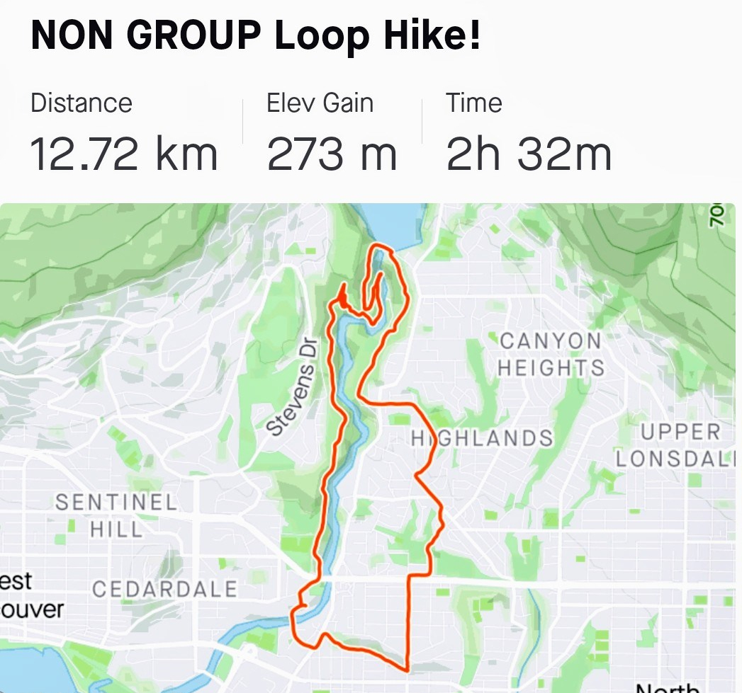 Across the highway on the orange bridge overpass, a walk through Pemberton Heights neighbourhood, then down a staircase onto Bowser trail going west, eventually across Capilano Rd., and home… Still DRY!!