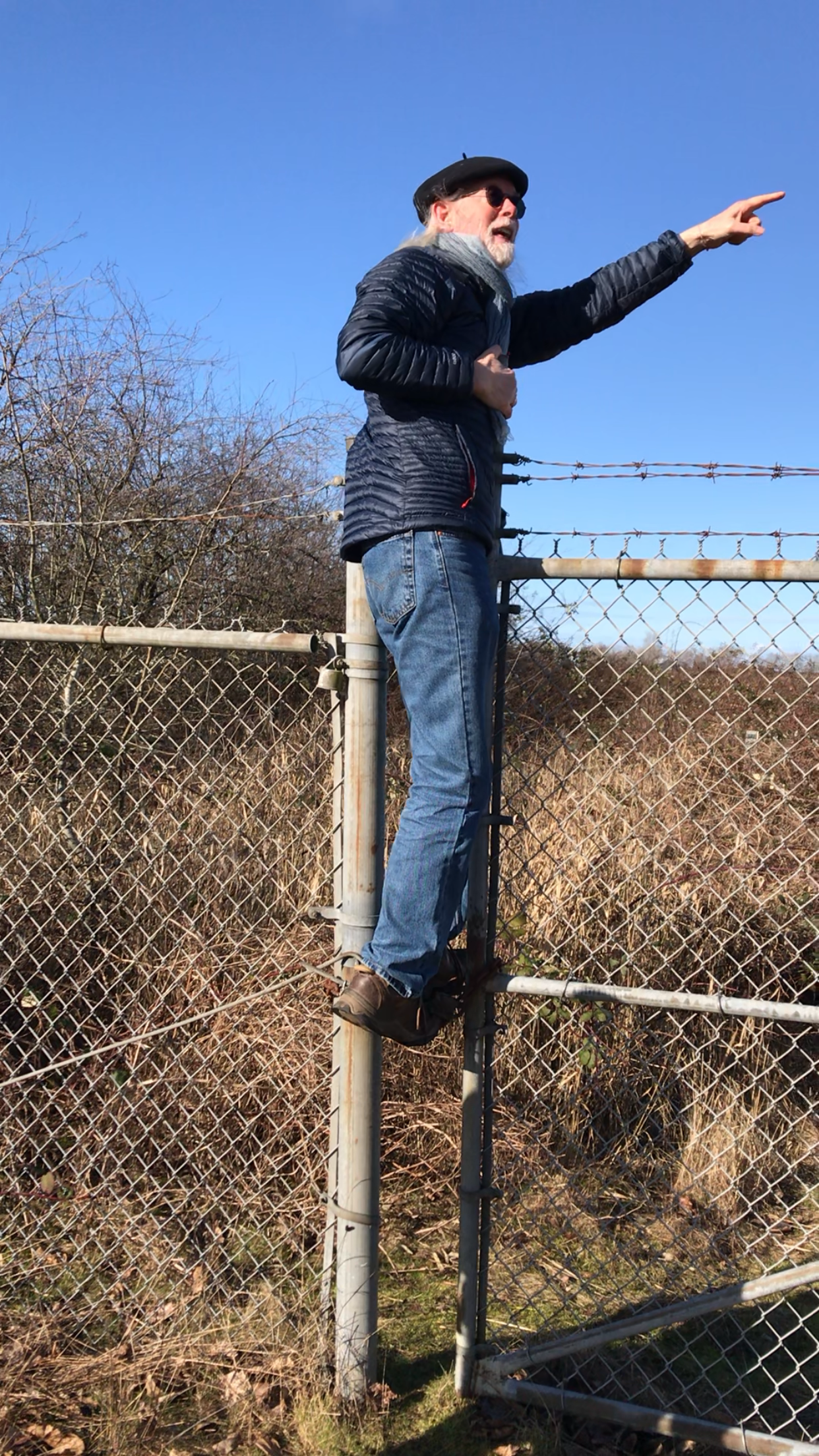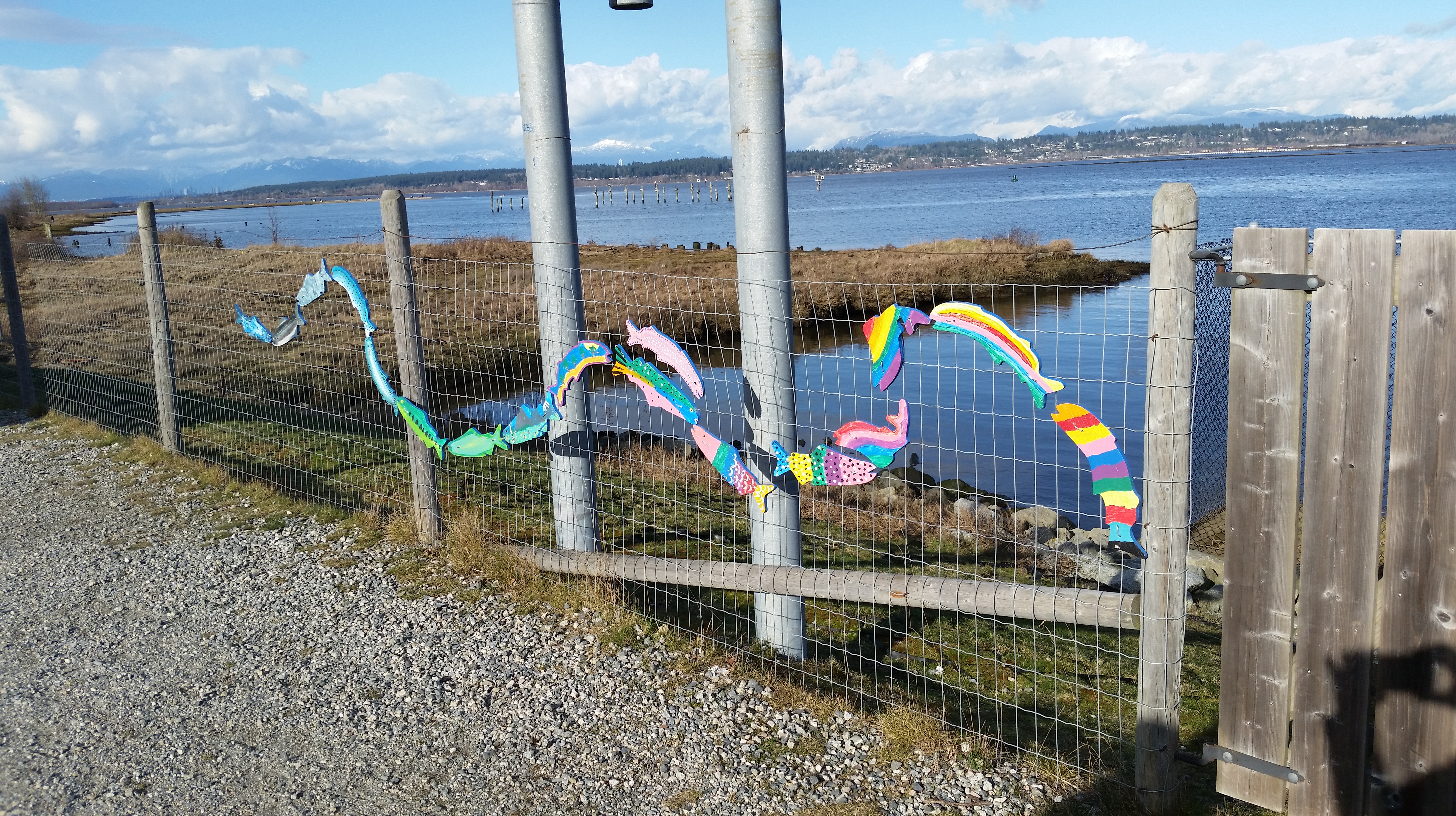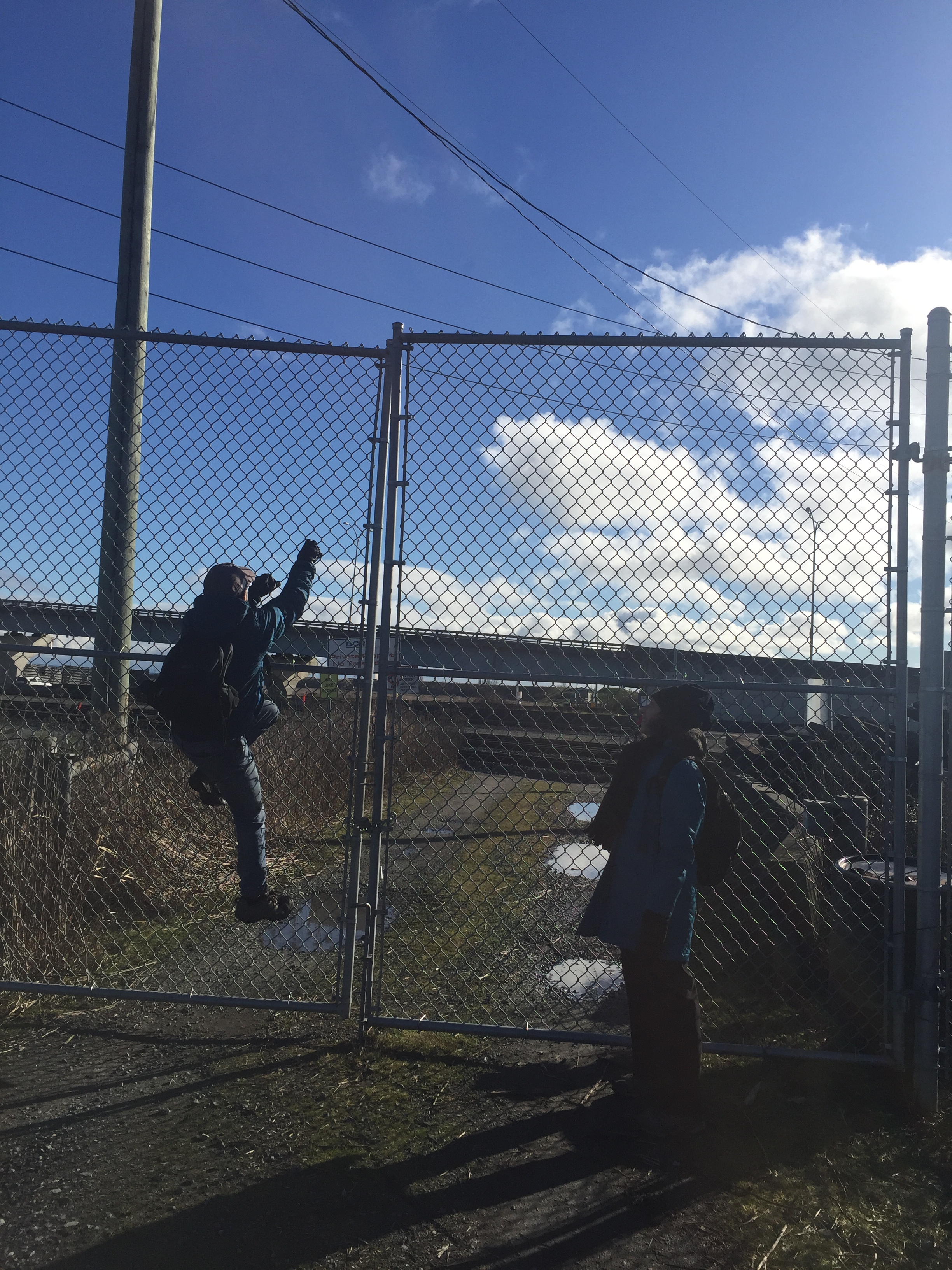 The walk was an “out and back”, with our turnaround point being a chain-link fence, and locked gate, which blocked the path just north of the railway tracks that serve freight trains heading to and from the Roberts Bank Superport. Both Fred and Michael made valiant, but ultimately fruitless, attempts to overcome the barriers (we did, however, spot an intrepid cyclist carrying his bike across the tracks in the general direction of Tsawwassen, so in theory there is a way through). If the Loopers ever were to consider a repeat of the “Horseshoe Bay to to the USA” series of walks, we’d need to solve this puzzle.