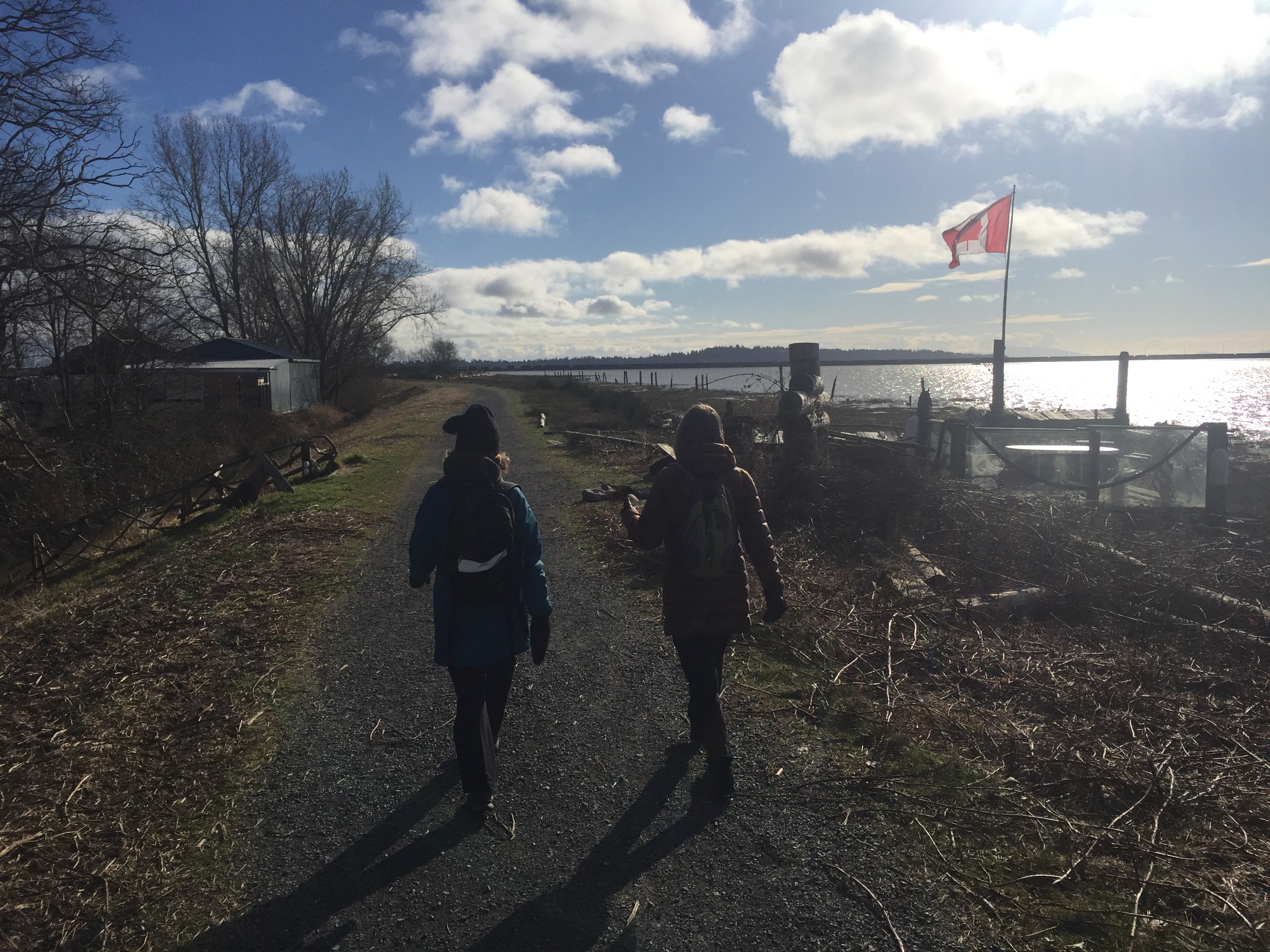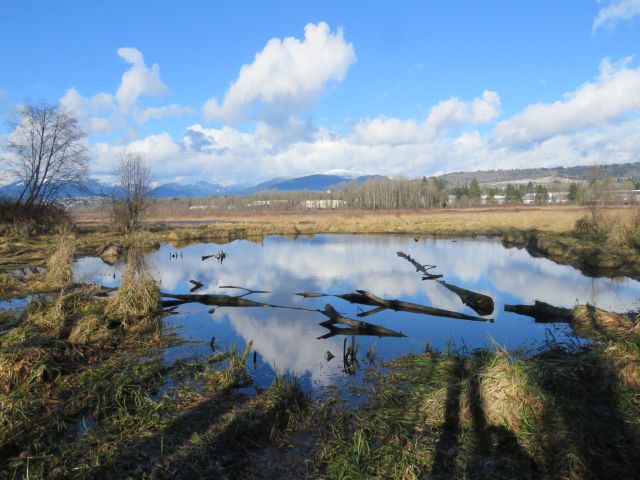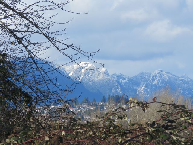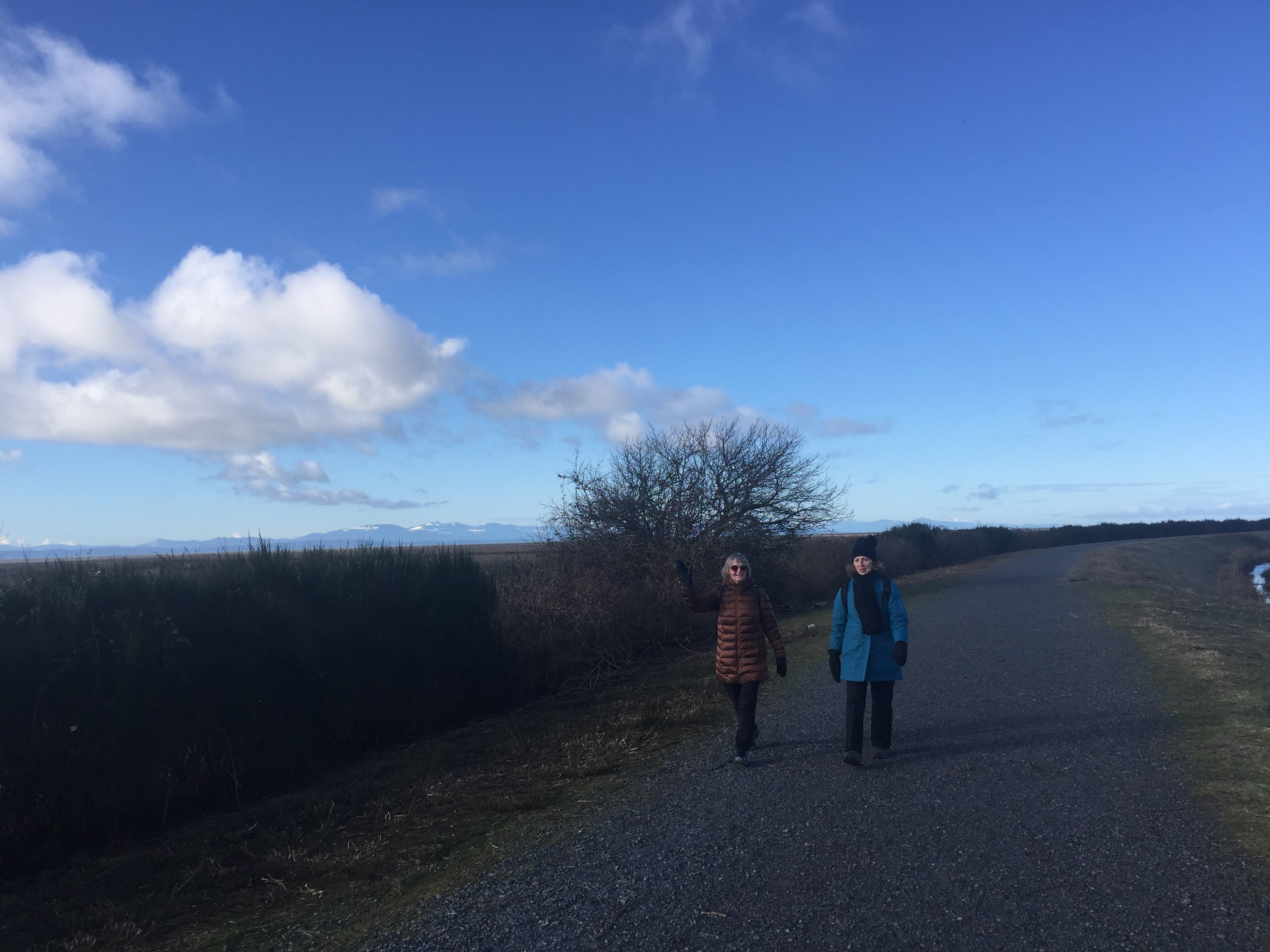 This month, we decided to try Terra Nova in Richmond. We parked at the last parking lot on River Road, and when we stepped out of the car we were greeted with cold, blustery winds. The white caps were dancing on the waters. We walked along the West Dyke Road, past Westminster Highway, until we saw the turn-off for the Terra Nova Natural Area and crossed over the bridge. This is owl territory, however no luck today! We walked in a loop around the Natural Area – the vegetation was there in all its wintry glory – reds, browns and muted beiges. Parts of the trail were very muddy — will my boots ever be the same! We crossed Westminster Highway and then walked around the Terra Nova Rural Park — very busy with children playing in the adventure playground. We climbed the hill and took in the magnificent views of the snow-covered mountains and waters. We then headed back to the beginning, down the hill to the parking lot, with everyone vying for our coveted parking space. Total distance 5 km
