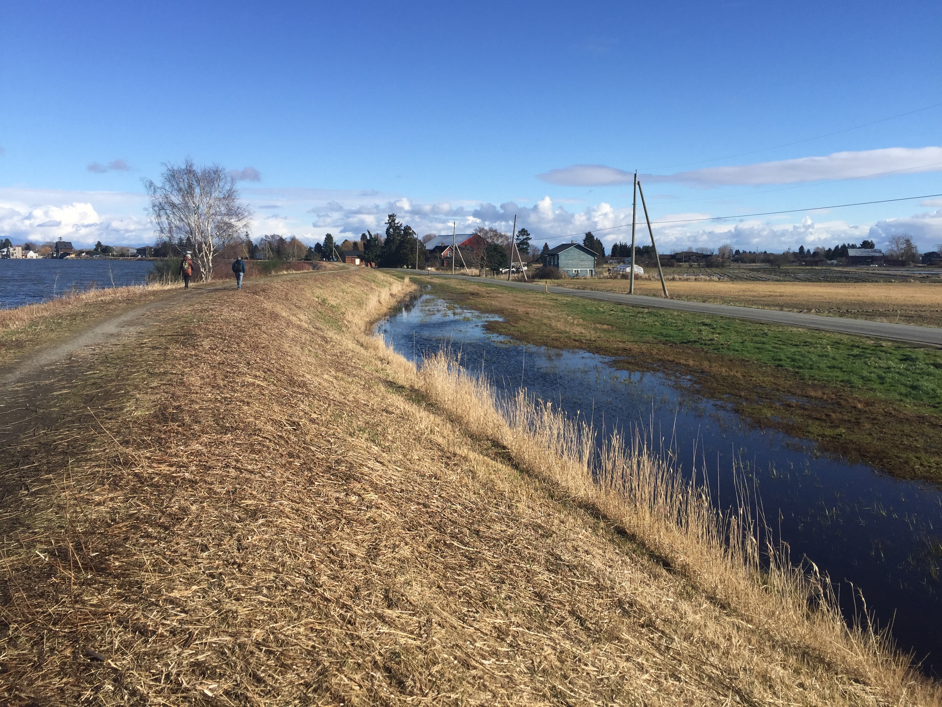 Our destination this time was a Fred suggestion: the Brunswick Point Trail in Ladner, a trail that starts just west of Ladner village, and continues towards Tsawwassen along the dikes. Vintage Loopers may recall that we walked along this stretch of trail as part of our “Horseshoe Bay to the USA” series of walks, in August of 2015; accounts of our earlier walks along that section can be found here and here.