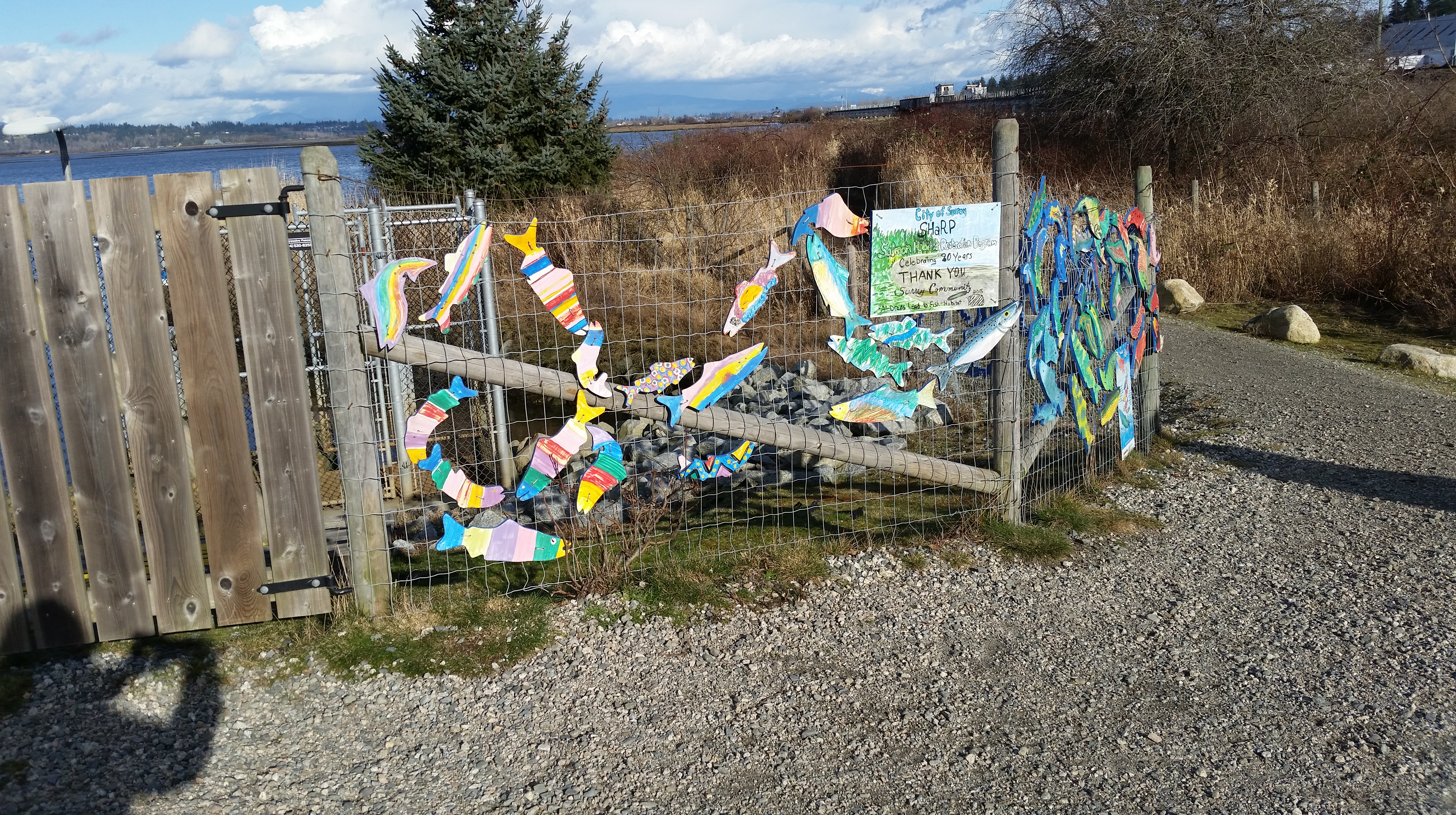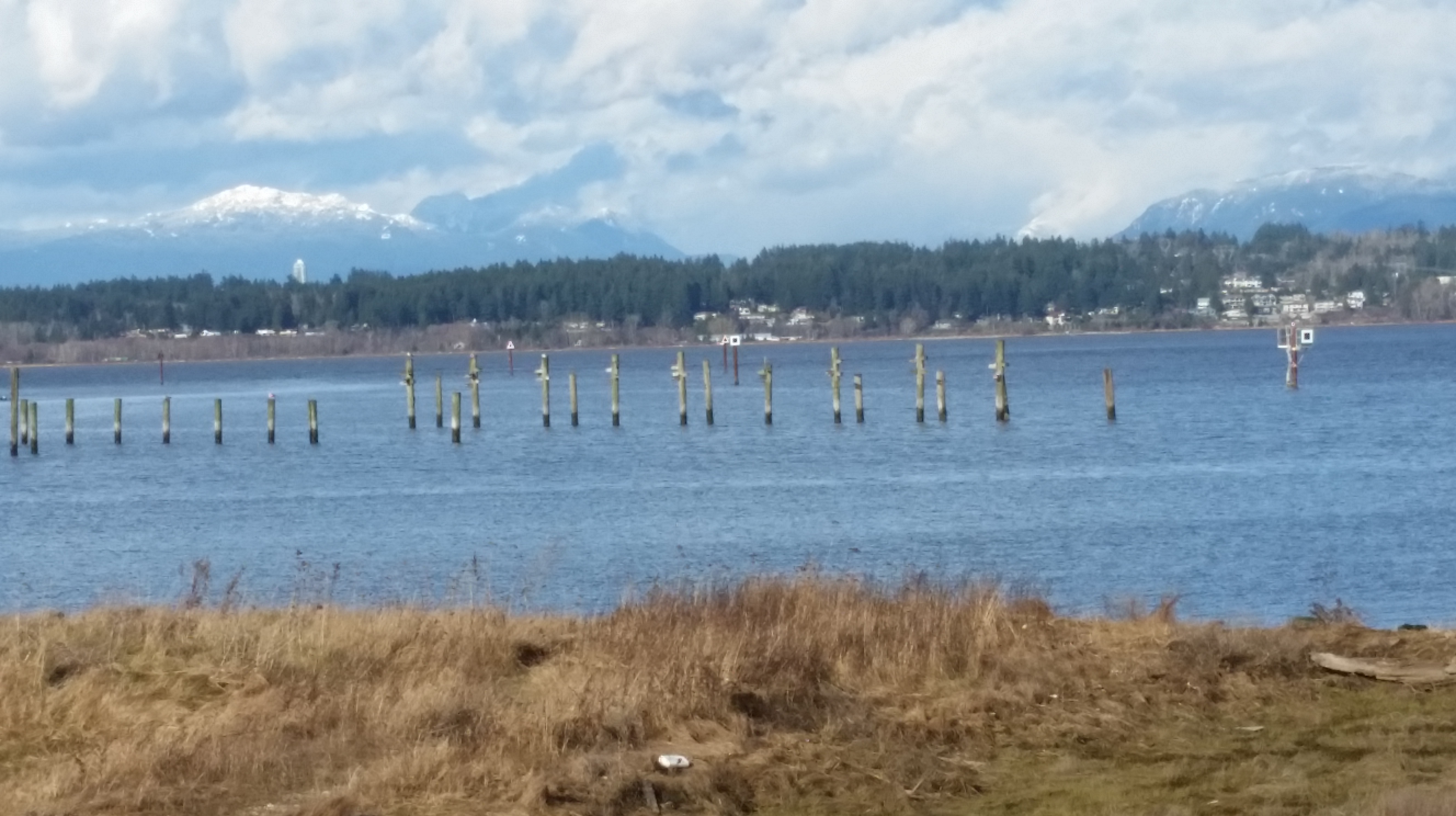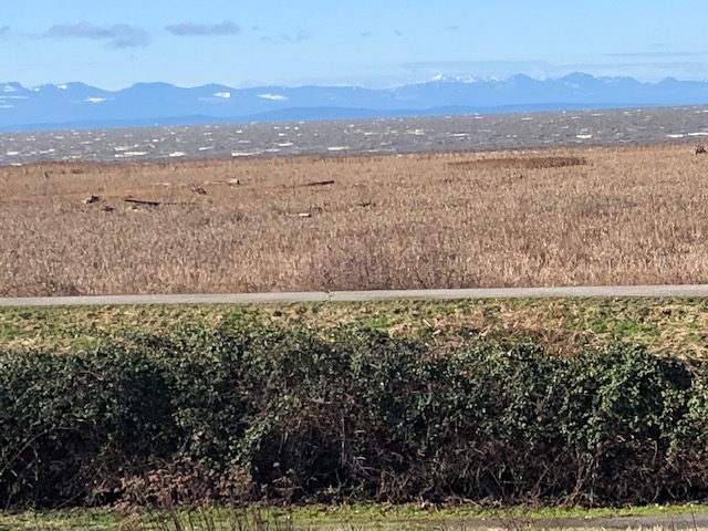 Parking at our meeting point was limited (two short stretches along one side of a dead-end road), which may explain the fact that the trail was relatively uncrowded, on a beautiful sunny and blue-sky day. Another plus: brisk winds blowing in from the Strait of Georgia guaranteed a steady supply of unsullied air. There was also a steady supply of eagles, soaring above or perched in trees along the dike, as well as flocks of other, unidentifiable birds just offshore.