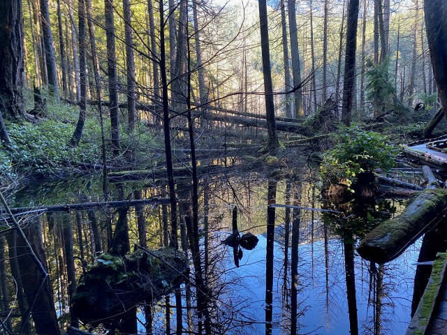 The North Creek wooded trail led out from Beaver Lake to the causeway, and over the bridge on the east side, and back to the North Shore. Yes, MORE wind, but at least NO COYOTE NIPPING incidents in Stanley Park! A nice walk!