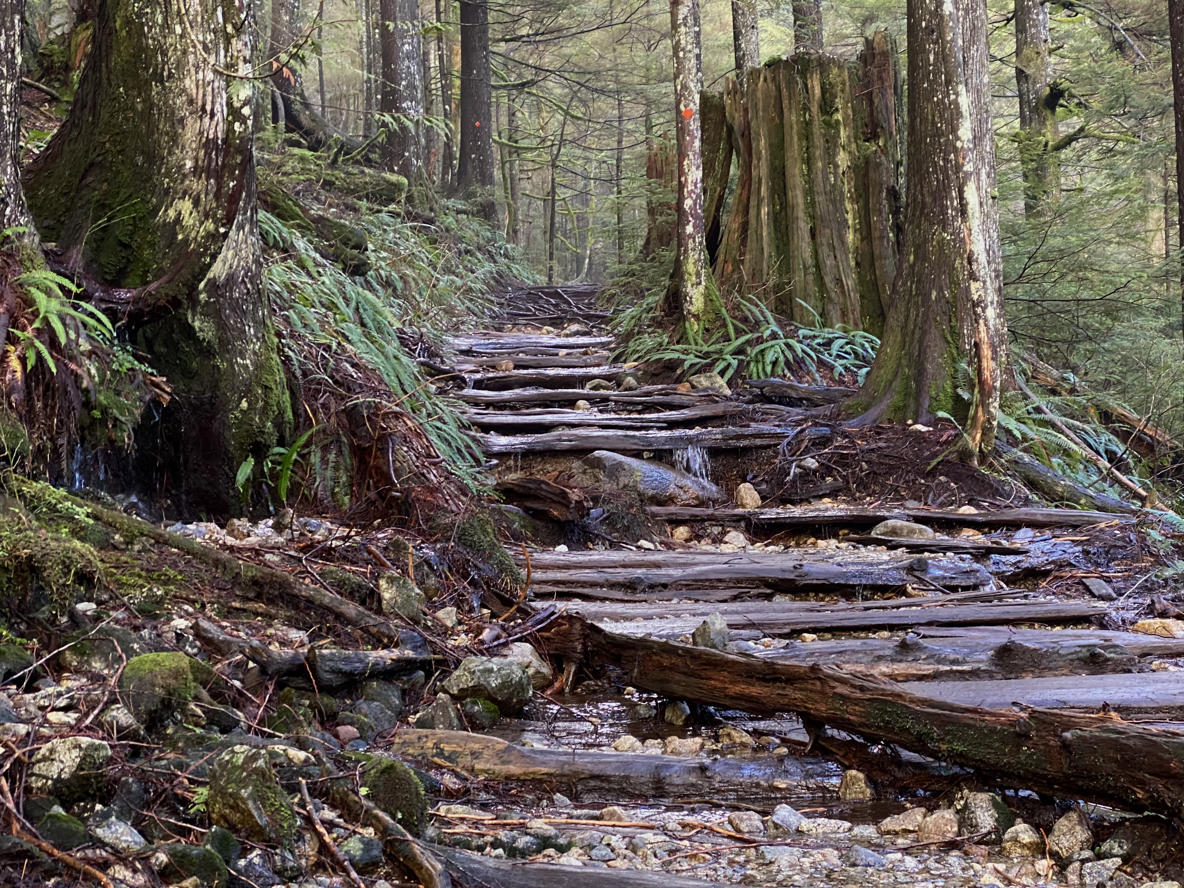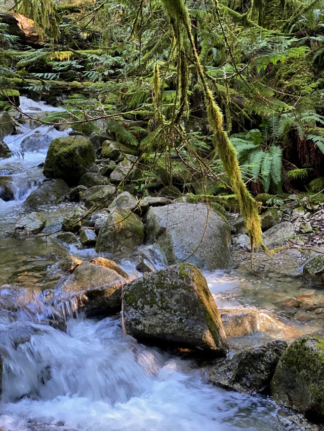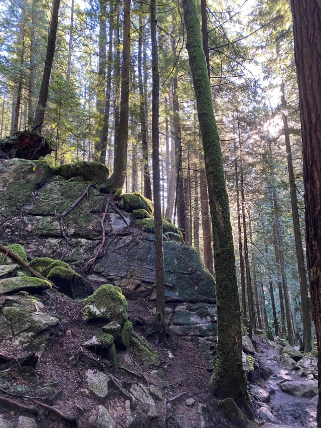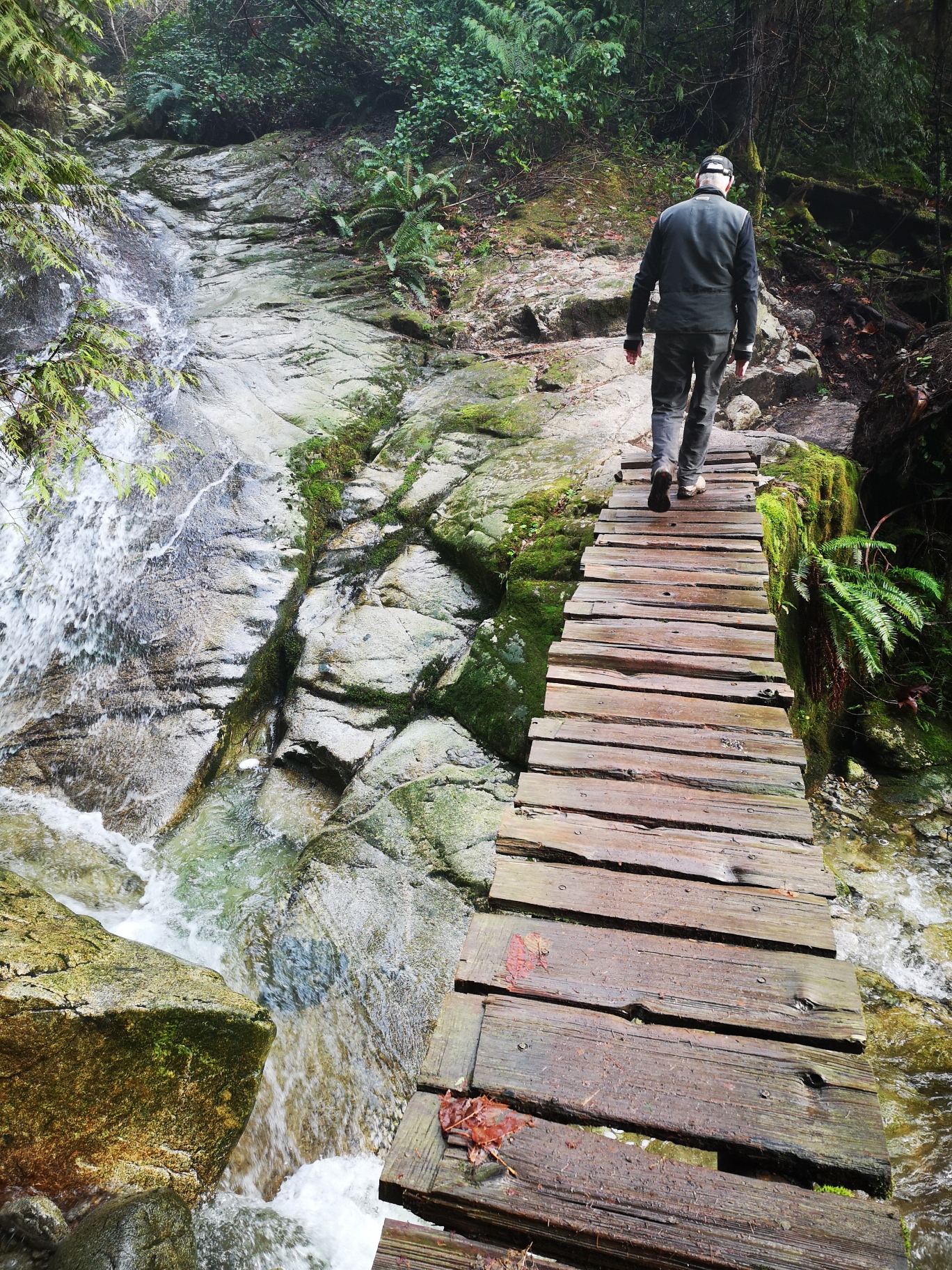 Derek Frampton and I walked from my house at 8:00 a.m on a trail behind Dave and Angela’s toward Quarry Rock to catch the Baden Powell Trail heading uphill crossing Indian River road and then Mt. Seymour road. Down Old Buck to Parkgate for coffee and a snack before walking home. Three hours to the coffee shop. Not busy until about ten then it seems everybody was parking on Mt. Seymour Road and heading down to Quarry Rock since the Deep Cove route is closed. One nice scene was a man with a little girl about four picnicking along a creek. She was on a bamboo mat playing with her little dog curled up beside her. He was cooking on a gas stove for them. I didn’t take a picture as it it just seemed a private spot yet for all to see. Nice day for it but sore today.