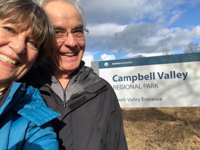 We thought we’d like to get out into the countryside and as both of us had far off memories of going to Campbell Valley Regional Park for short walks and picnics, we decided on driving out to 8th Avenue in sunny Surrey. We arrived to almost full parking lots at the South Entrance and began our 11 km walk around the outer edges on the Shaggy Mane Trail. And sure enough, pairs of horses and riders passed us, jovially calling out “hi” the whole way round. In fact, everyone including kids and dogs called out “hi”. Very friendly place, and, though busy, most people wore masks. The trail is wide to accommodate horses passing, but interior trails are narrower. There is another parking lot at the North Entrance on 16th Avenue and a little bit east of that is the old Scout Camp Alan remembers going to in his youth. The east and south side butt onto two horse centres, a beautiful rolling horse jump-training course and a riding academy. Shaggy Main Trail was a trifle muddy and full of twice processed horse feed, but nicely aromatic. The valley is bisected by the Little Campbell River which is marshy and wide in some parts and narrow creek-like in others. Protection of local and native species prevails. We finished back at the South Entrance by wandering through the historic Rowlatt Farmstead. An invigorating, interesting walk!