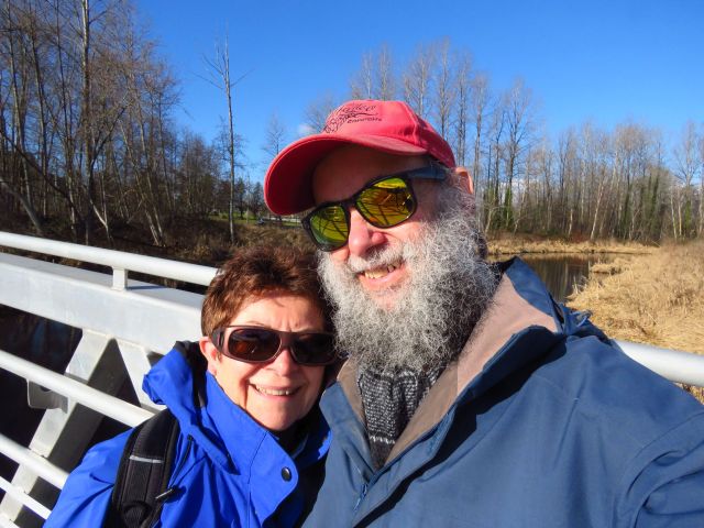 Liz and I decided to do the walk around Burnaby Lake today. We were amused on our drive over when we had to stop near QE Park to allow a flock of Canada geese to saunter across the road. We parked at the sport complex to the west of the lake and then headed north and east, pausing at the bridge over Still Creek for our starting selfie. They are doing a lot of work on the railway line just north of the park so it is much more open on that side than I remember from previous visits. Once we reached Piper Spit we stopped to see if we could spot the Harlequin duck that was rumoured to be around there. Many other duck varieties were on display, including a Mandarin duck, but no Harlequin.
