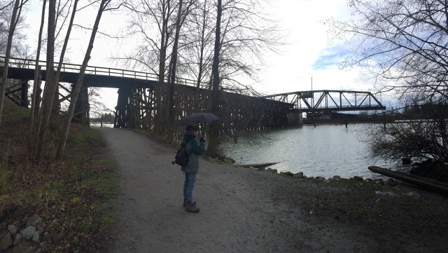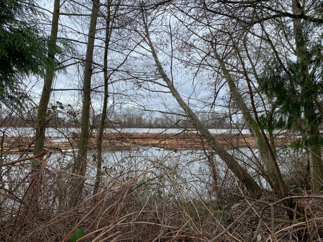 We started out at the usual time of 10:30 and headed east from the foot of Boundary Road on the north arm of the Fraser River. The weather was mixed with a few showers at the start and then it settled down with even a little sunshine on the return leg. This is an urban walk that nevertheless moves through wooded areas and provides some very pleasant vistas across the Fraser River, including long log booms moving downriver at a leisurely pace, a scene that could have been viewed in virtually the same way two centuries ago.