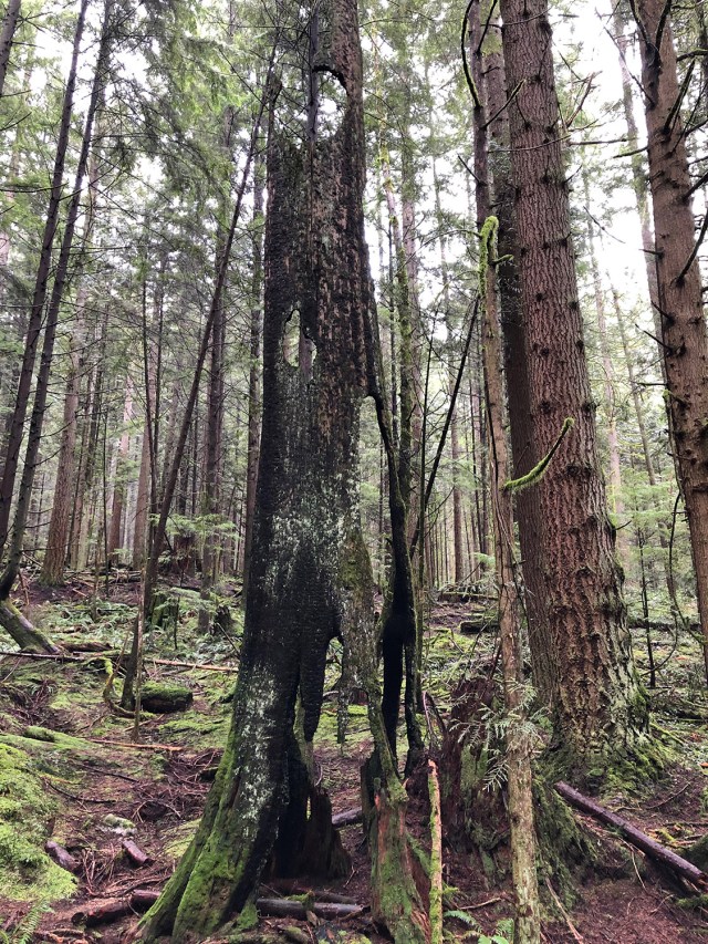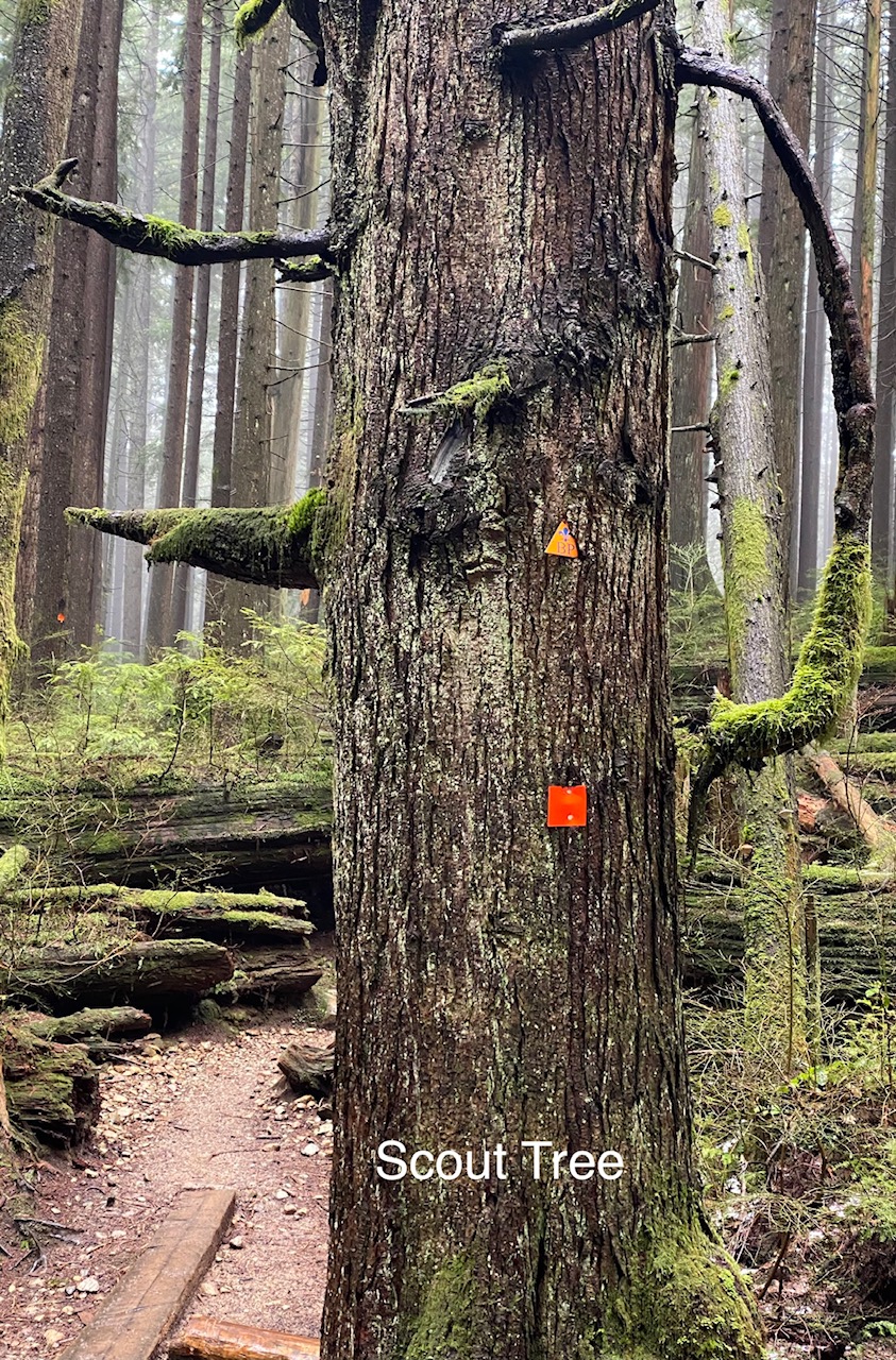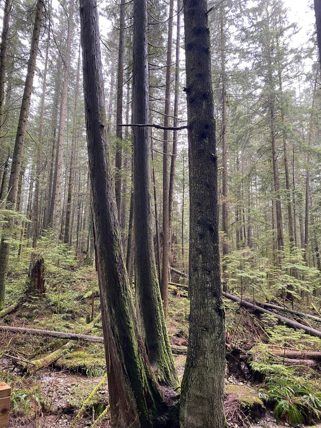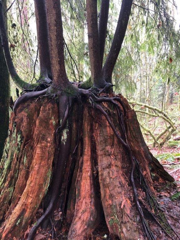 (few of which are left since early loggers cleared the biggest and mightiest of them, the giant stumps of which are seen all along the trails).