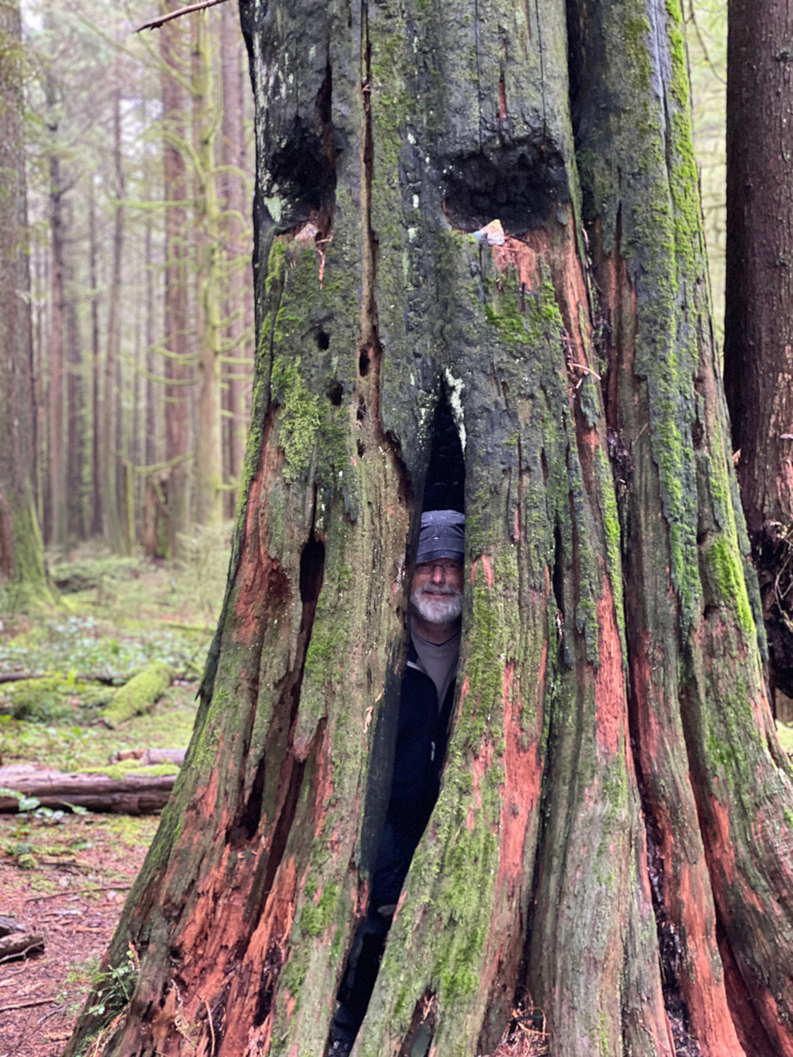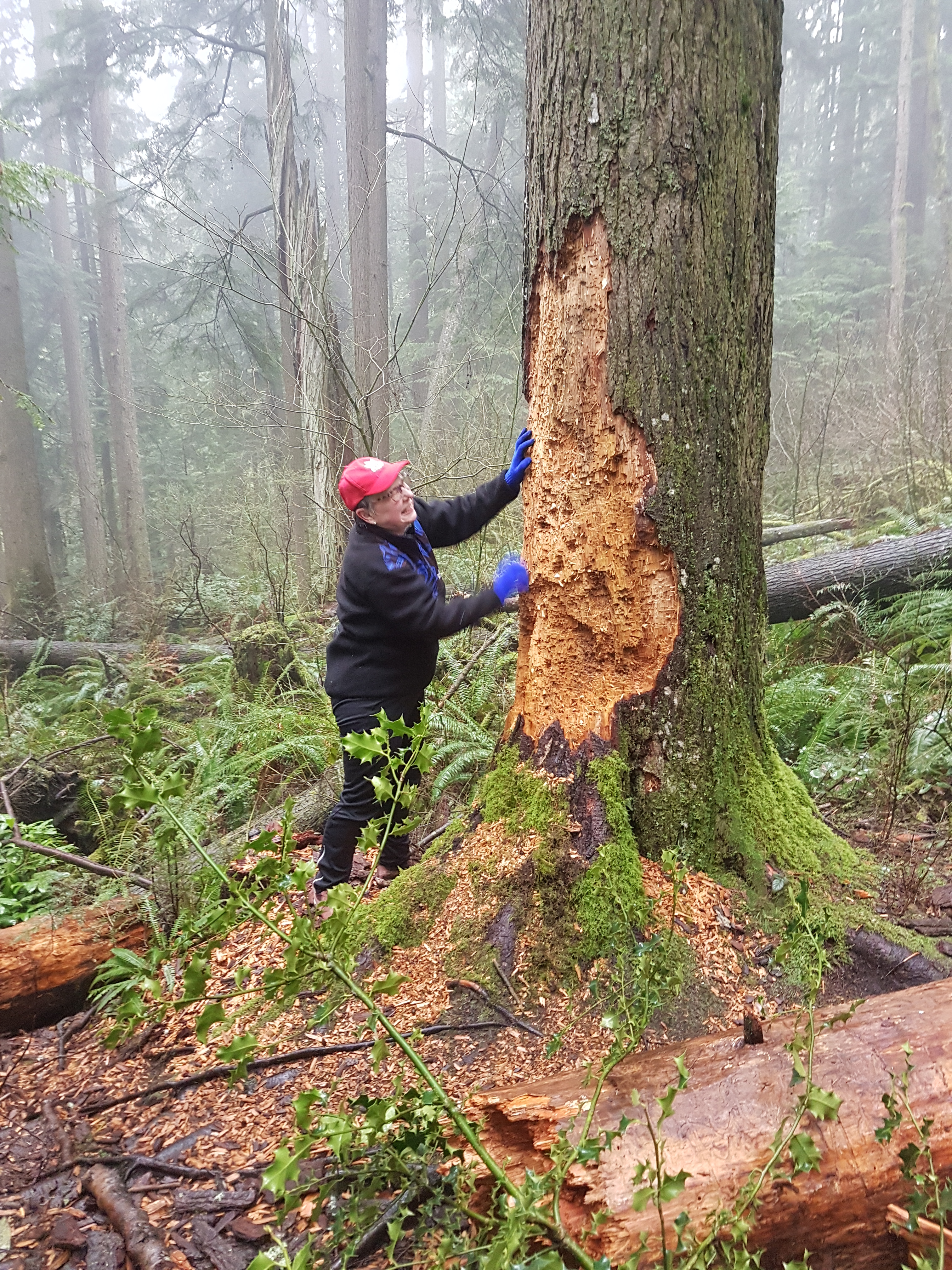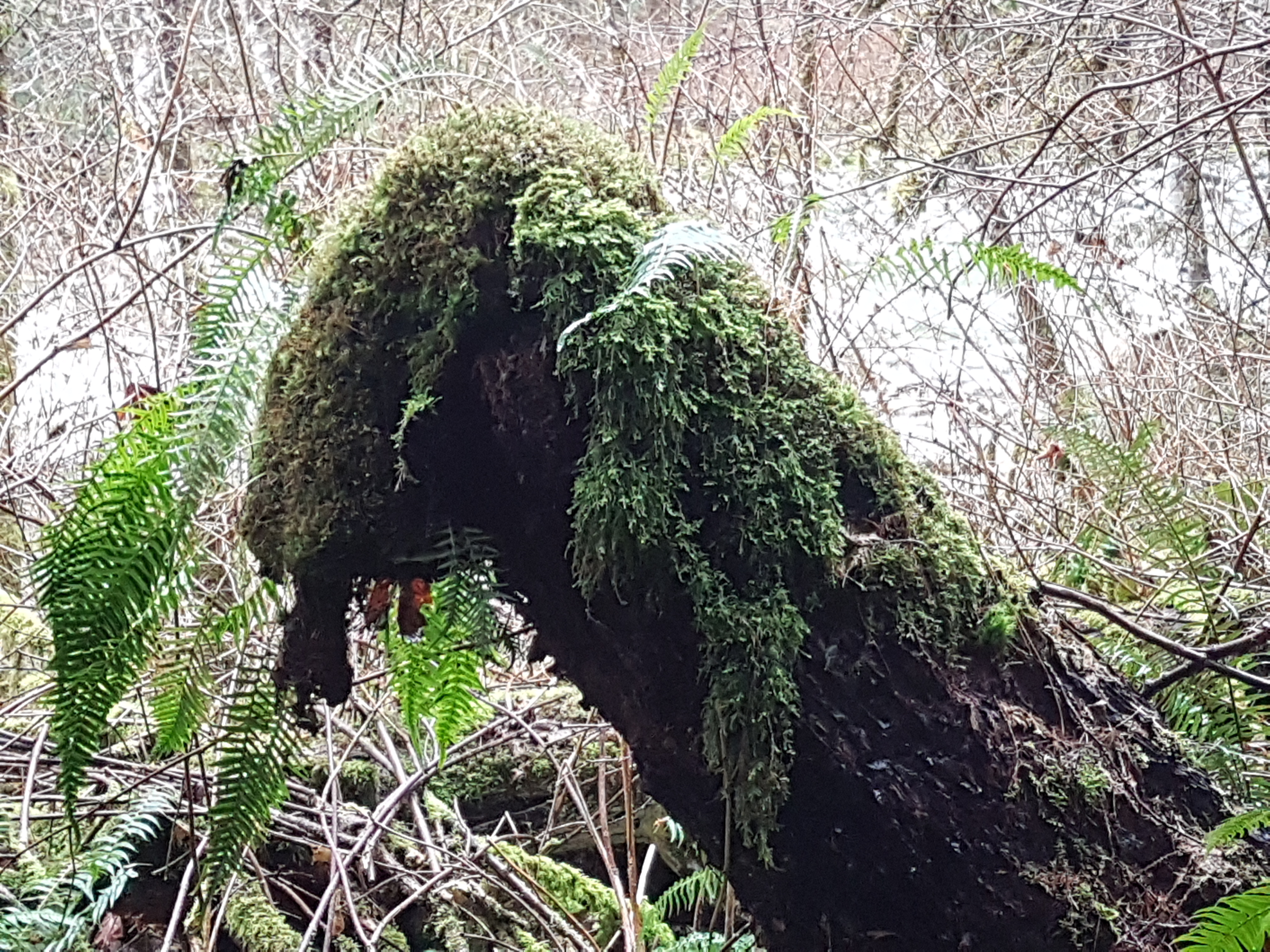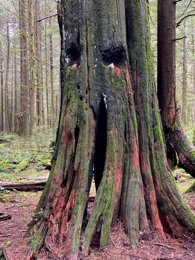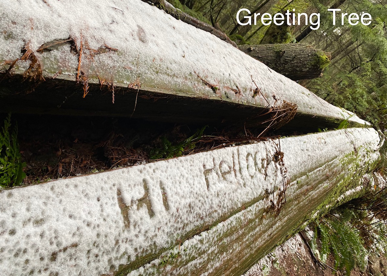During our explorations, the afternoon light was soon obscured by the passing clouds which blew in dark and ominous (perhaps by some signal from the mysterious ‘tree’ spirits) and sent us scuttling for shelter under the last majestic cedars, to escape from the sudden storm of falling sleet. We huddled under the towering mother trees…….