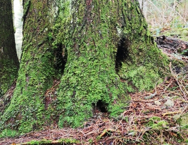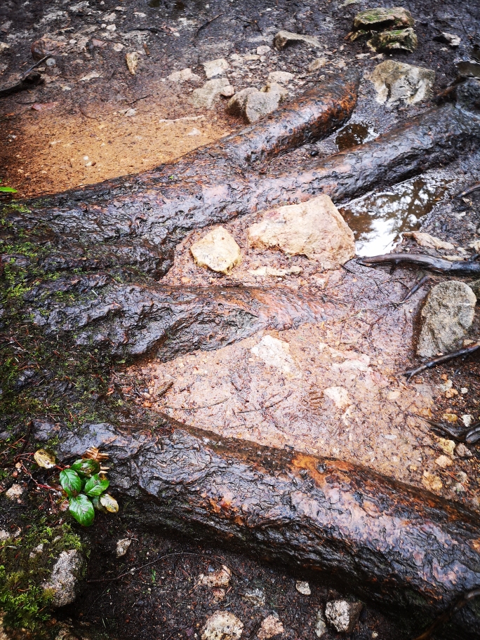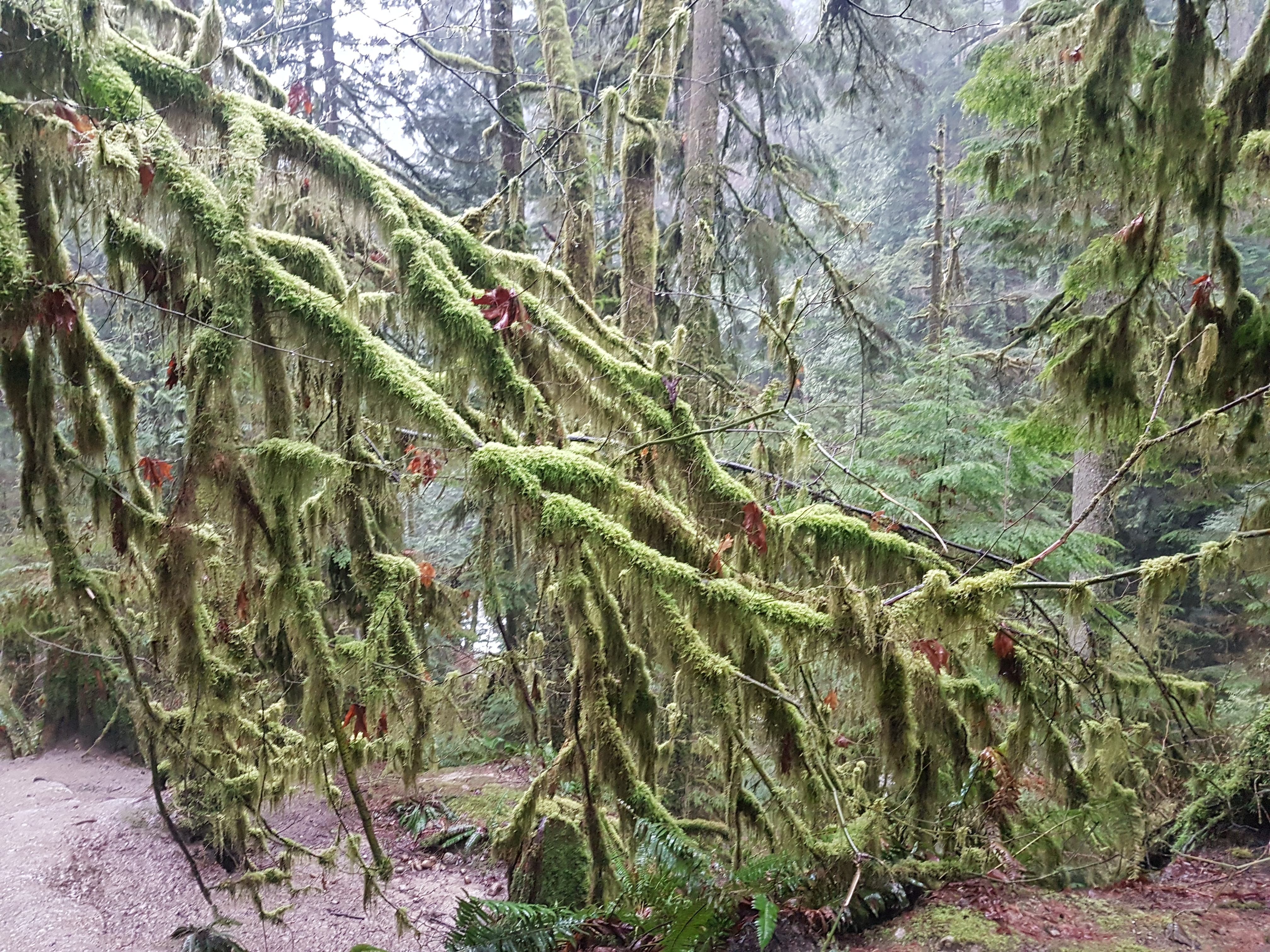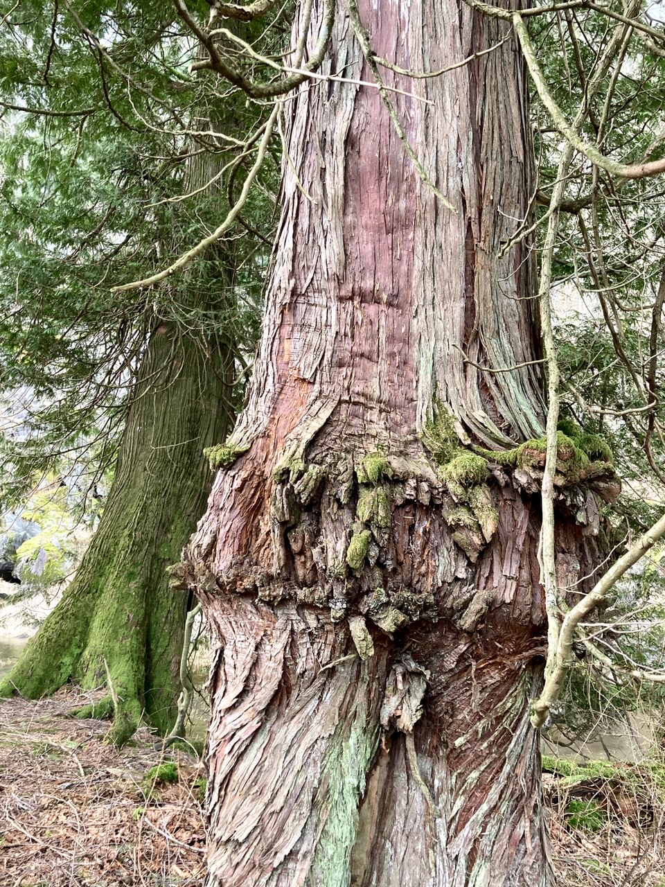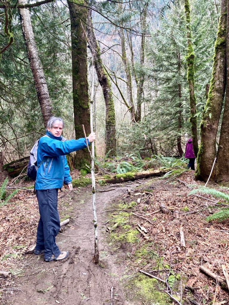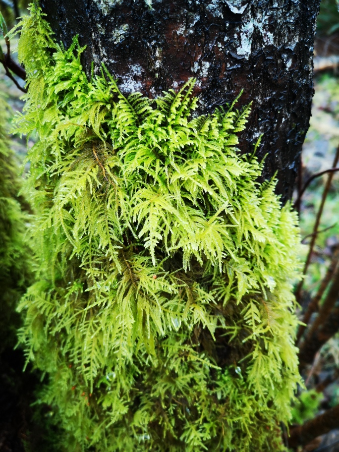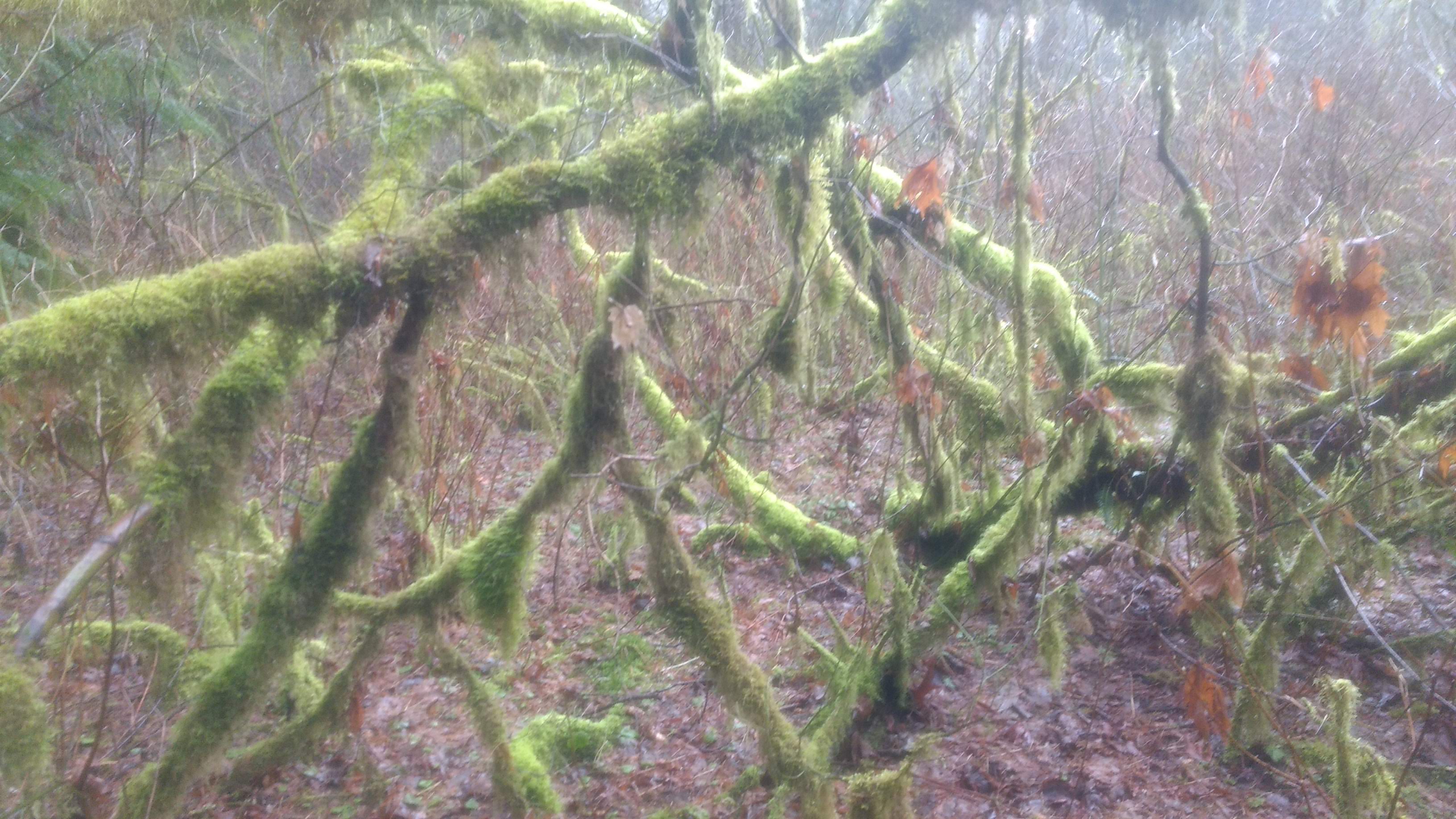 During our explorations, the afternoon light was soon obscured by the passing clouds which blew in dark and ominous (perhaps by some signal from the mysterious ‘tree’ spirits) and sent us scuttling for shelter under the last majestic cedars, to escape from the sudden storm of falling sleet. We huddled under the towering mother trees…….