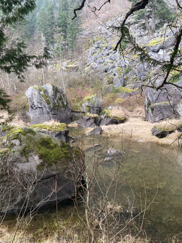 This gave us pause to take in the grandness of the giant moss covered boulders of the rockslide.