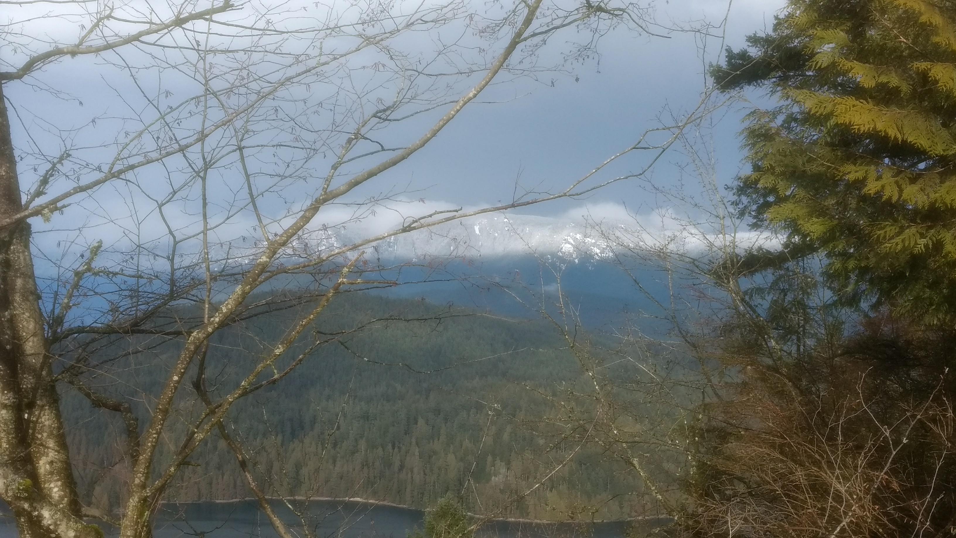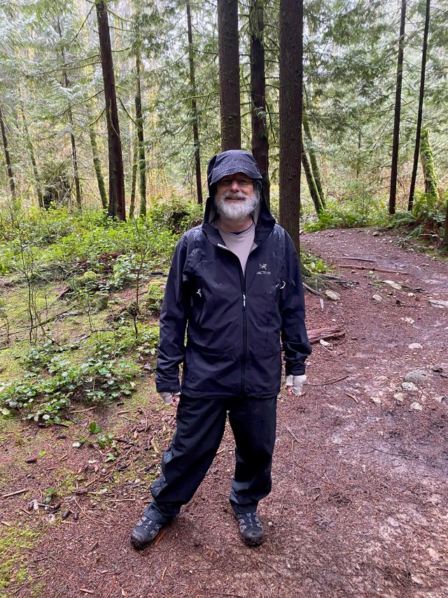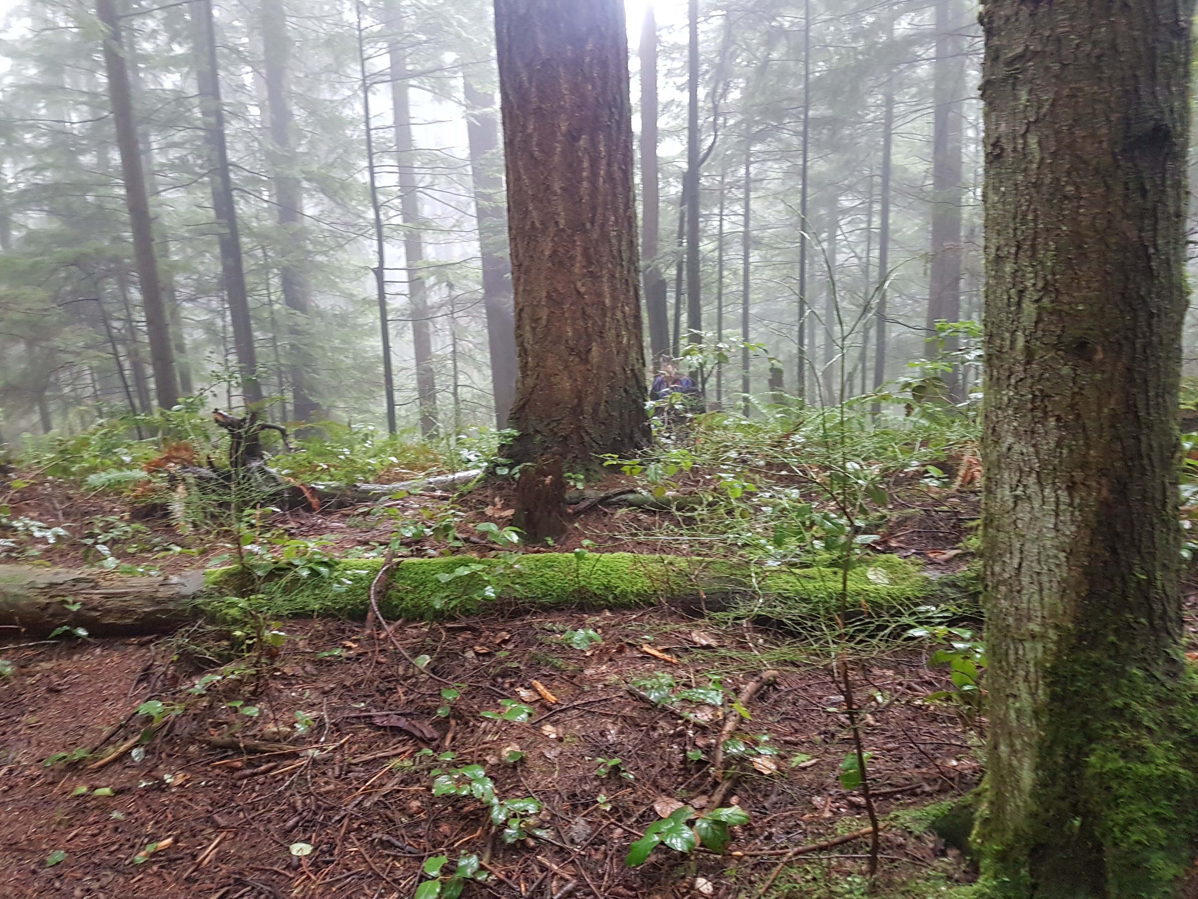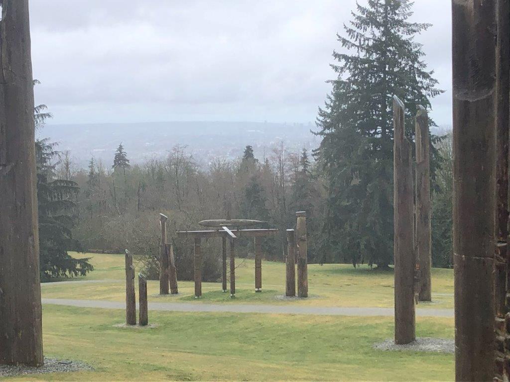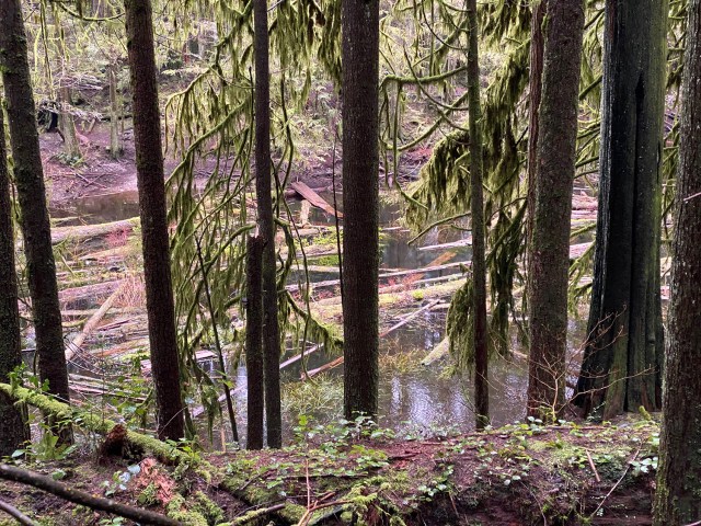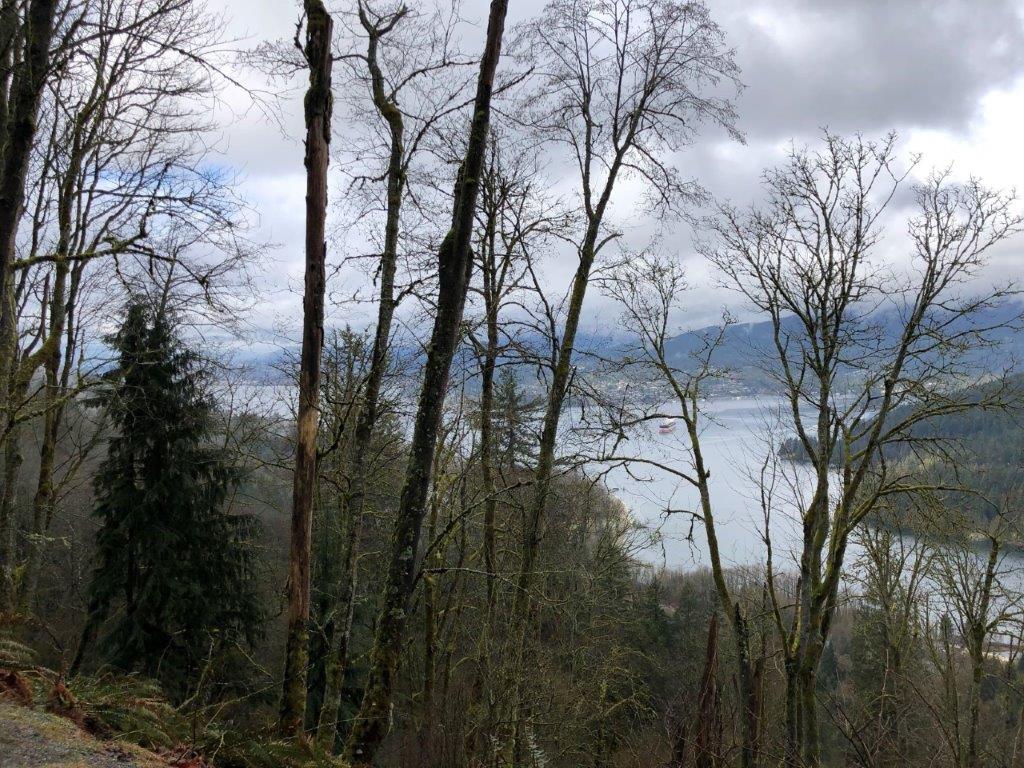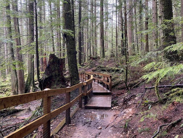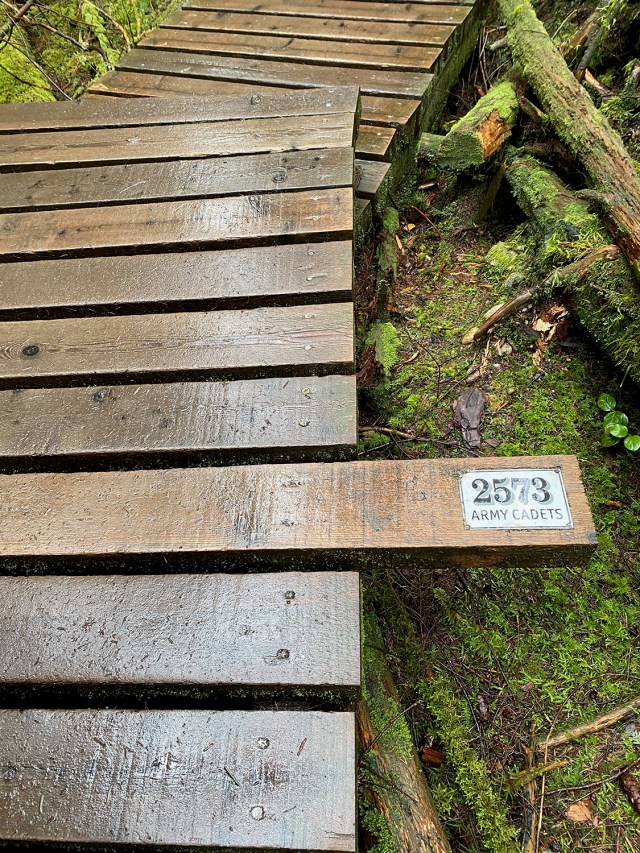 Our original plan was to do a loop up and around SFU – basically the long circuit walk 61 from “109 Walks”, with maybe a little extra walking around SFU. But Sunday morning Julie was feeling a bit under the weather and decided something shorter would suit her better. So we walked apart-together-apart. Julie dropped me off at Dalla-Tina Avenue at the base of the mountain, then drove up Centennial Way to the Centennial Pavilion parking lot. She walked around the park for a while, while I hiked up the TCT, taking the nature trail route. It was a bit wet and muddy but very foresty – and deserted.
