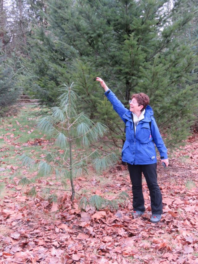 At the start of our walk we were met by a welcoming tree, silhouetted against a clearing sky. It was so cold that we really had to bundle up. Luckily, Sandy had an extra pair of gloves for Carol, who was grateful to borrow them. After a nice walk along the shore, we spotted an unusual evergreen tree with deciduous-looking leaves – already forgotten the name, and no photo. (But kudos to Joette for helping to identify it later.)