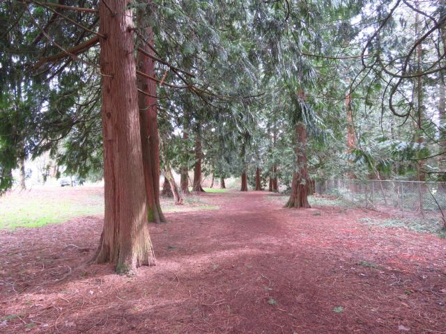 We did a two loop walk today. We drove to Everett Crowley Park and began our walk with a clockwise loop on the perimeter trail around Fraserview golf course. Although it was drizzling as we left home, by the time we started walking the skies started to clear and the sun poked through a few times. The southern part of the Fraserview trail is quite wooded, and the trail had fresh cedar mulch on it for part of the way. The northern part of the trail is more open to the surrounding streets.