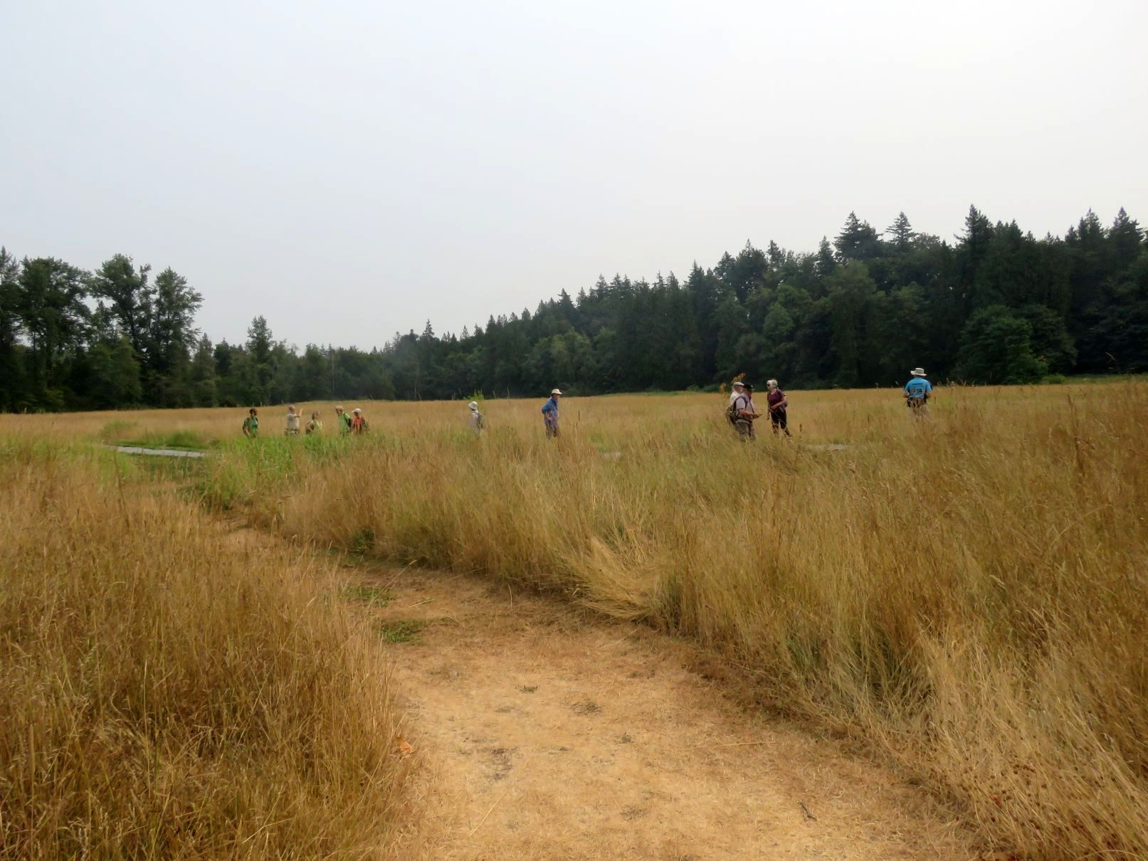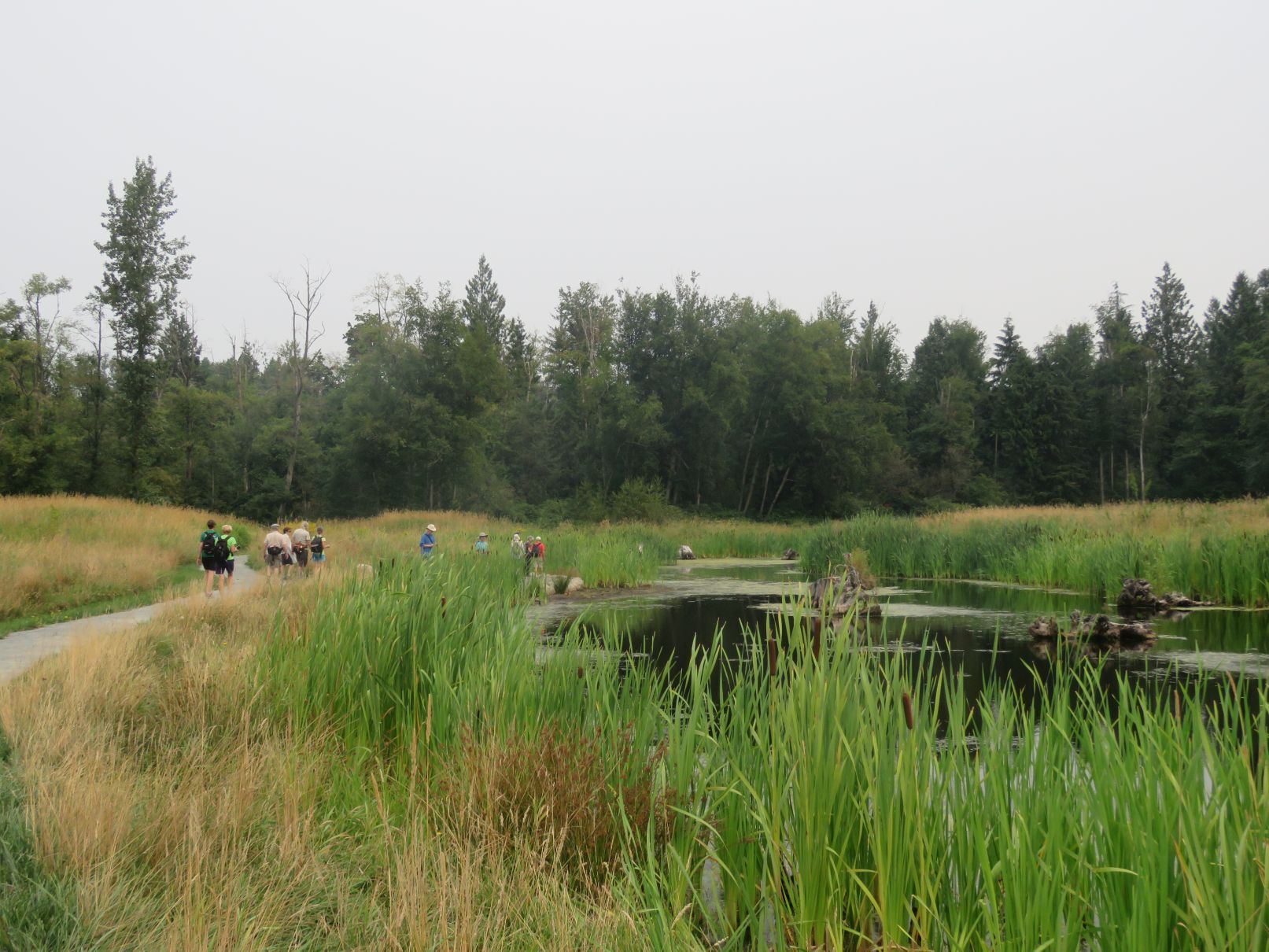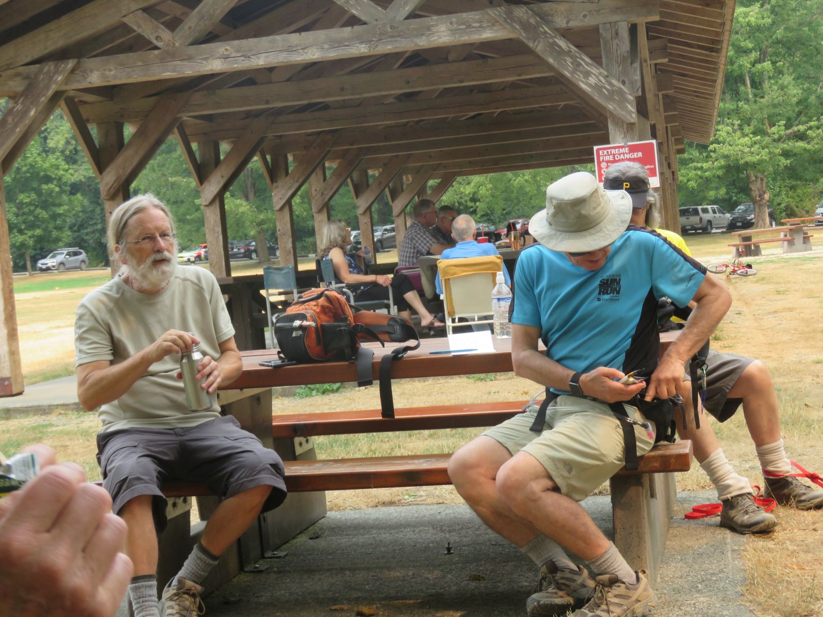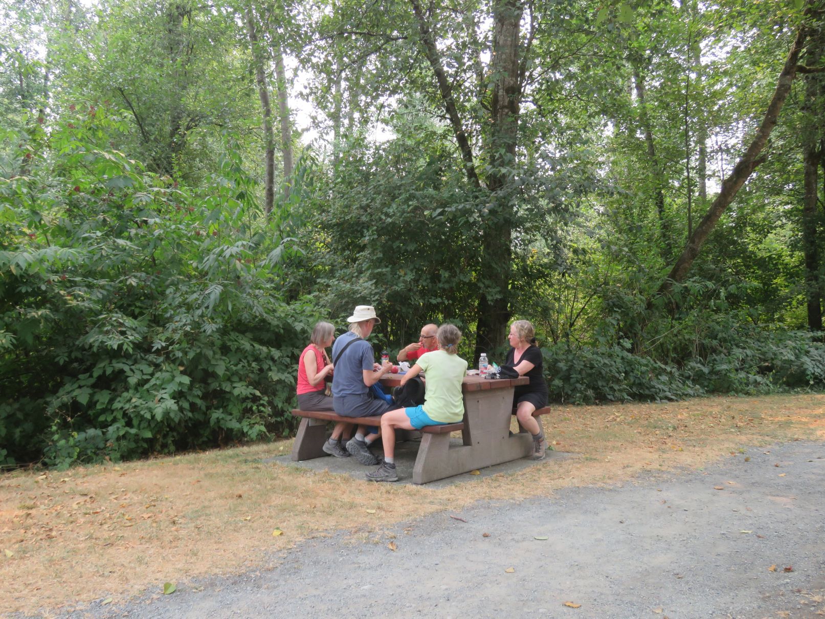 ‘Twas a hot and dusty Sunday afternoon when fifteen (15) Loopers plus a dog (Ms Maisie) gathered for their August walk, at the Aldergrove Regional Park. Loopers came from all directions (correction: exclusively from the west) to participate. It is worth noting — and celebrating! — the fact that this was only the second time in many, many months that we’d been able to Loop together, in one large group. Several of our regular walkers were unable to make this month’s walk; you know who you are! We missed their company, and their conversation.