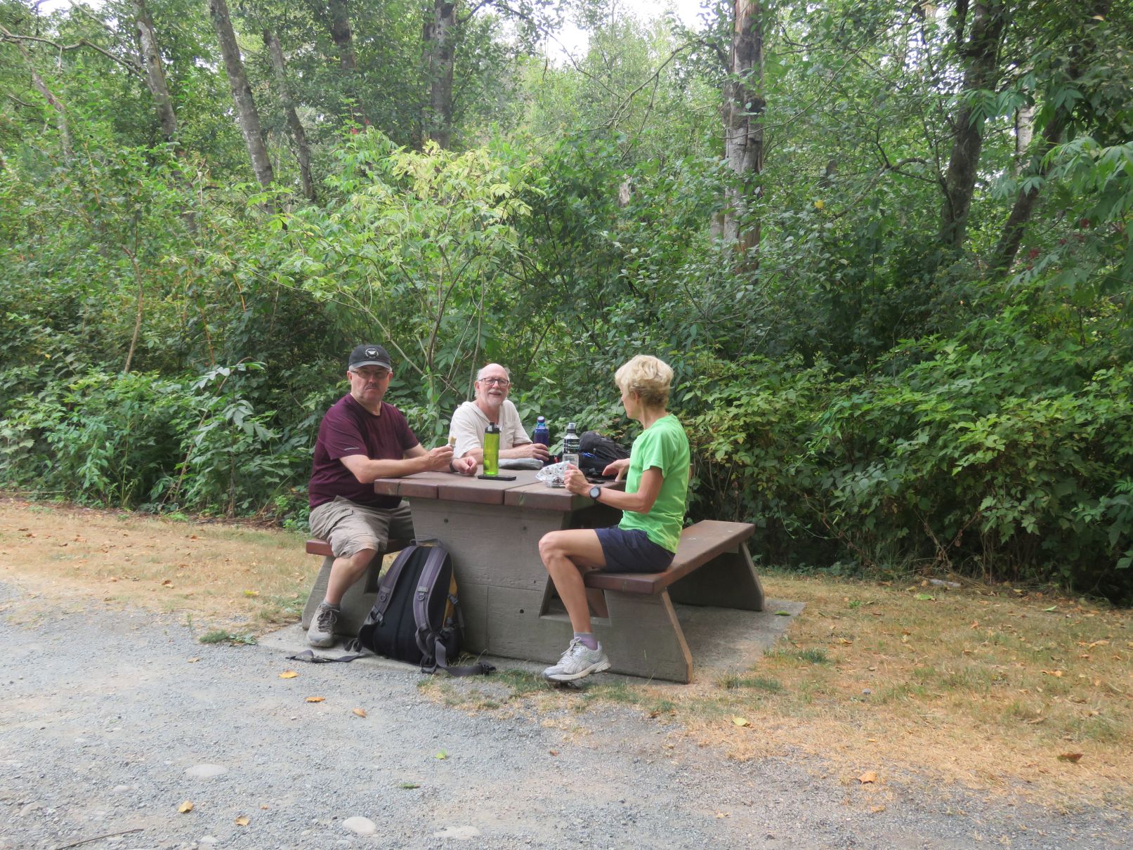 Aldergrove Regional Park contains several scenic highlights, which were dutifully photographed by our brigade of trained photographers. Notable among them were: a peaceful stream known as Pepin Creek, crossed by a scenic bridge or two; a rolling grassland (which Maisie was prohibited from exploring), containing a scenic pond, fringed by scenic bulrushes; and a scenic viewpoint overlooking Aldergrove Bowl (apparently a former gravel pit, now attractively landscaped to soften its industrial heritage). After completing our first, and largest, Loop, we took a short lunch break on the tables at the Blacktail Picnic Shelter.