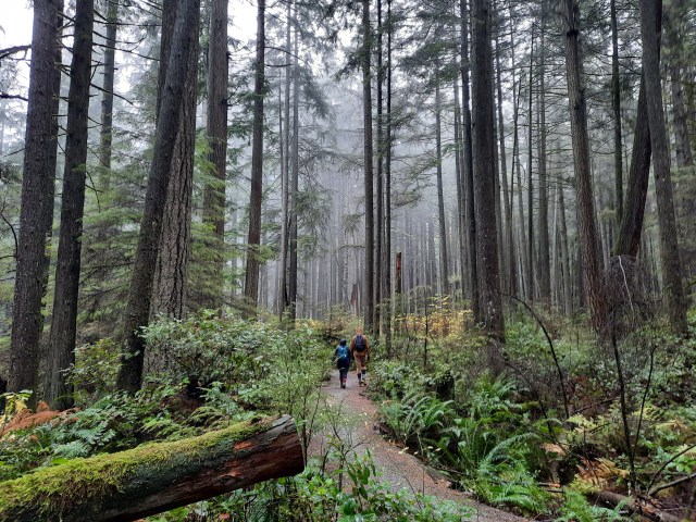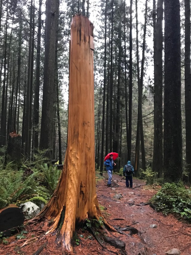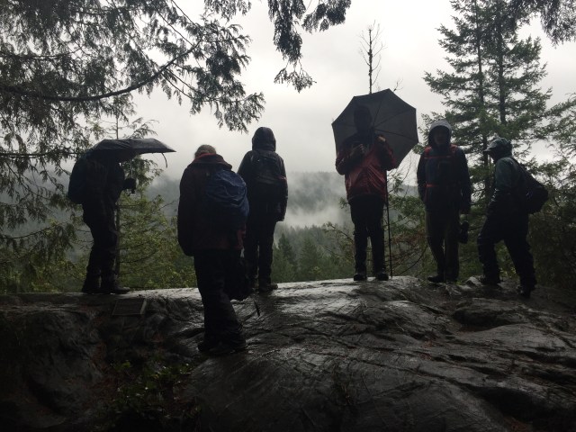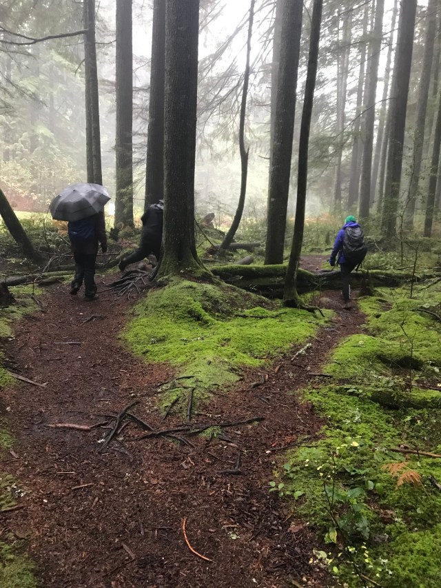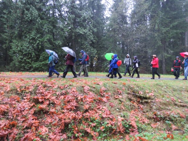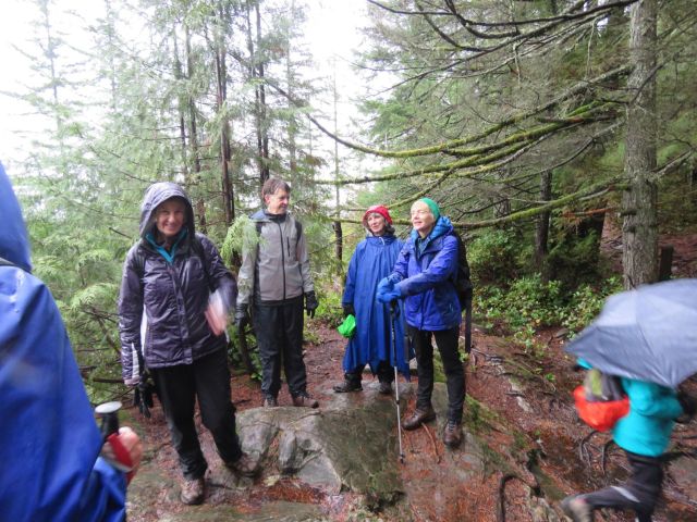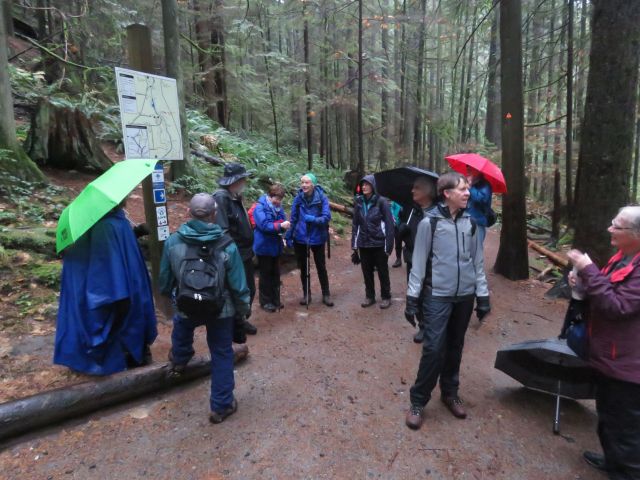 From this high point we headed downhill, still along the Richard Juryn Trail, past culturally-modified(?) cedar trees, through the North Vancouver Cemetery, and back to our starting point where we dispersed, each in search of dry clothes and/or a beverage. All in all it was a splendid day’s outing, and a perfect stress-test for our rain gear.
