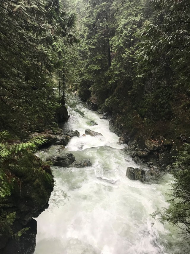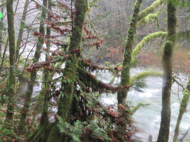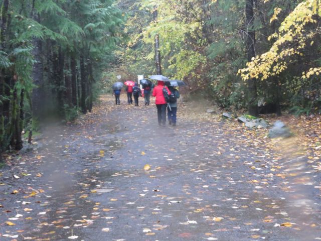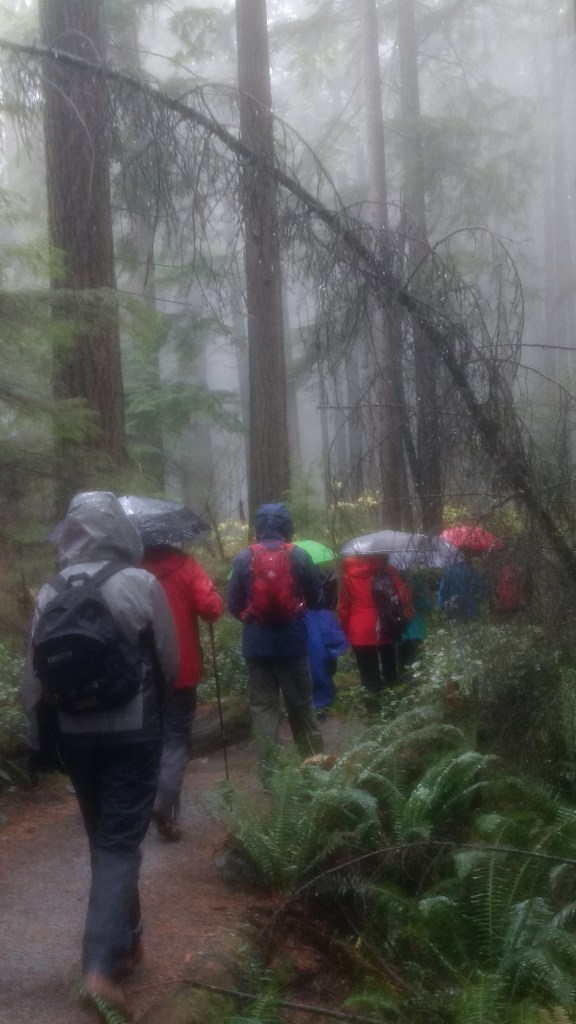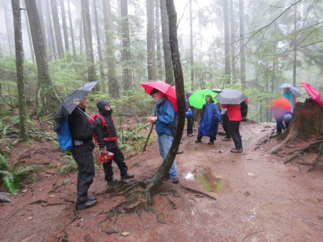 This month’s Looper walk may be the first one to be moved to accommodate the weather. Originally we were to wander through the woods of the Hollyburn plateau, touring the lakes which are scattered there: First, Blue Gentian, West, and Lost. As we approached our deadline, though, snow began to fall at higher elevations. As a result our Organizer decided that prudence might be called for, and proposed an alternate route at lower elevation, resulting in: a soggy stroll through the mystic rainforest east of Lynn Creak.