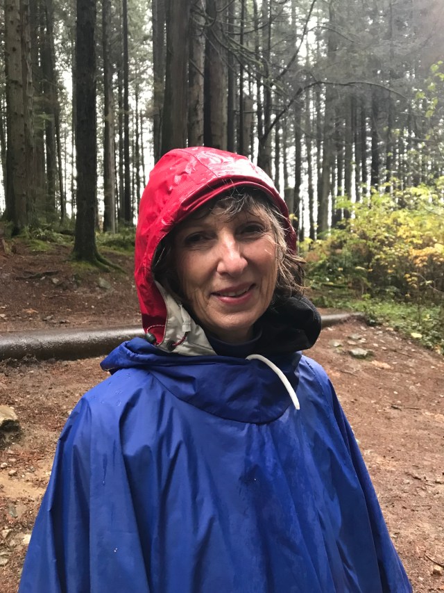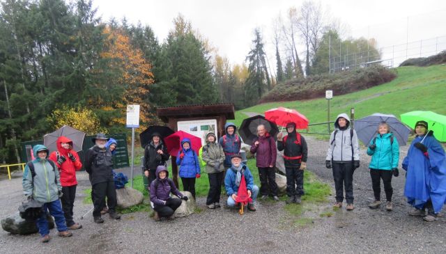 Sixteen Loopers met in the southernmost parking lot of Inter River Park, just east of Lynn Creek, wearing a fine assortment of Goretex of varying vintages and colours. Umbrellas were also popular, and Joette deployed her Famous Blue Poncho for the occasion; it was that kind of day. After the traditional group selfie we headed en masse down to the river, dodging puddles, and then turned right: upstream. As we followed the trail into the rainforest, we encountered a steady stream of sodden dogs and their equally sodden walkers, all heading back downstream. It was that kind of day: aquatic; full immersion; encouraging the development of gills.