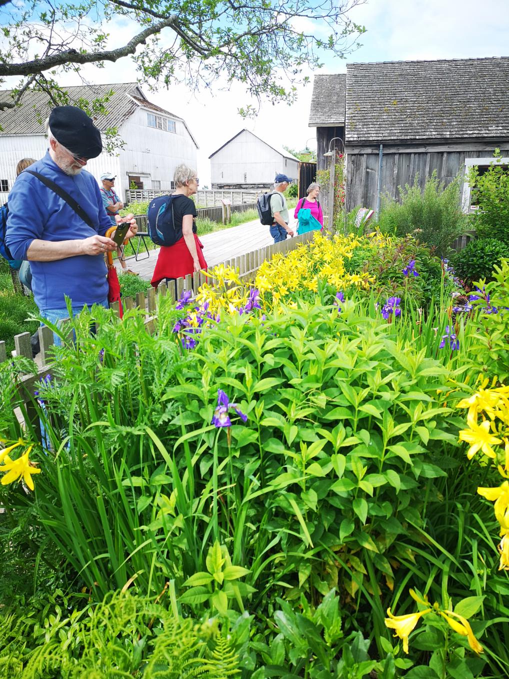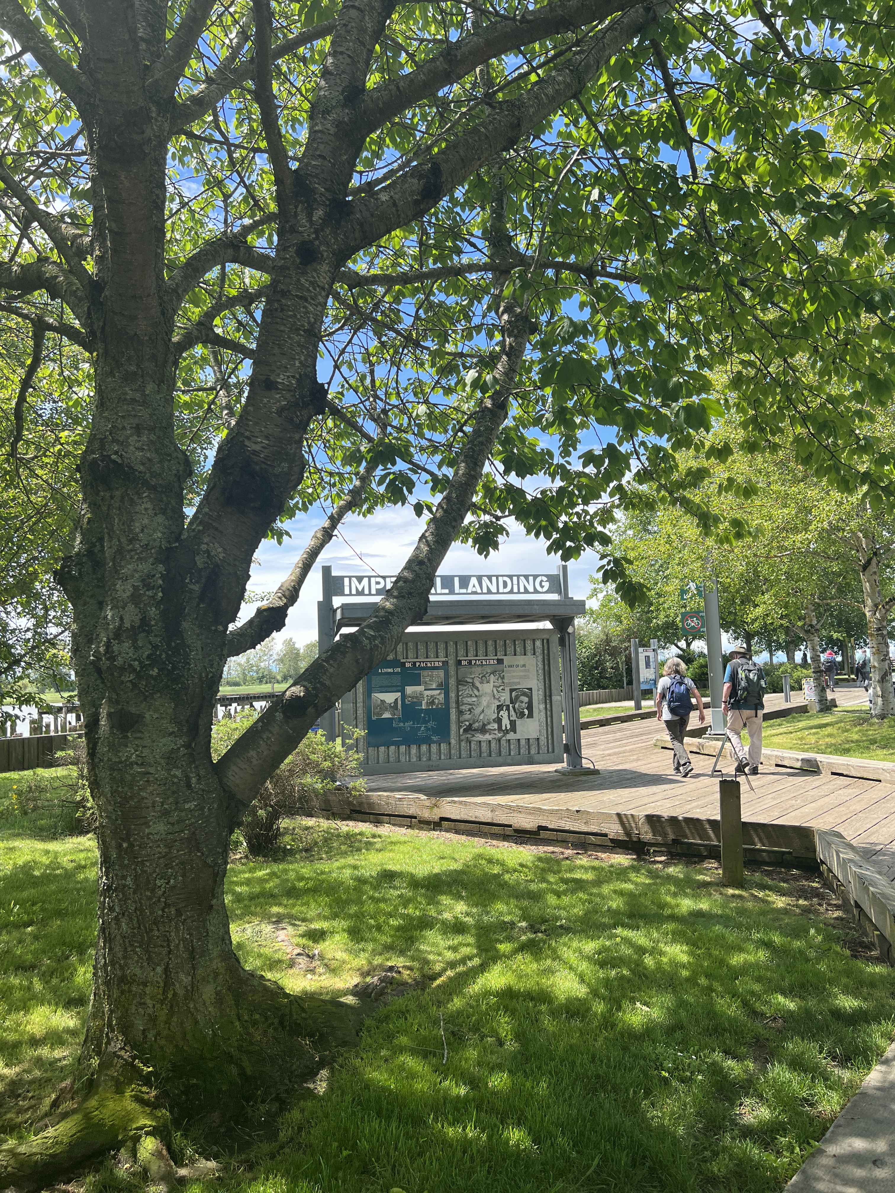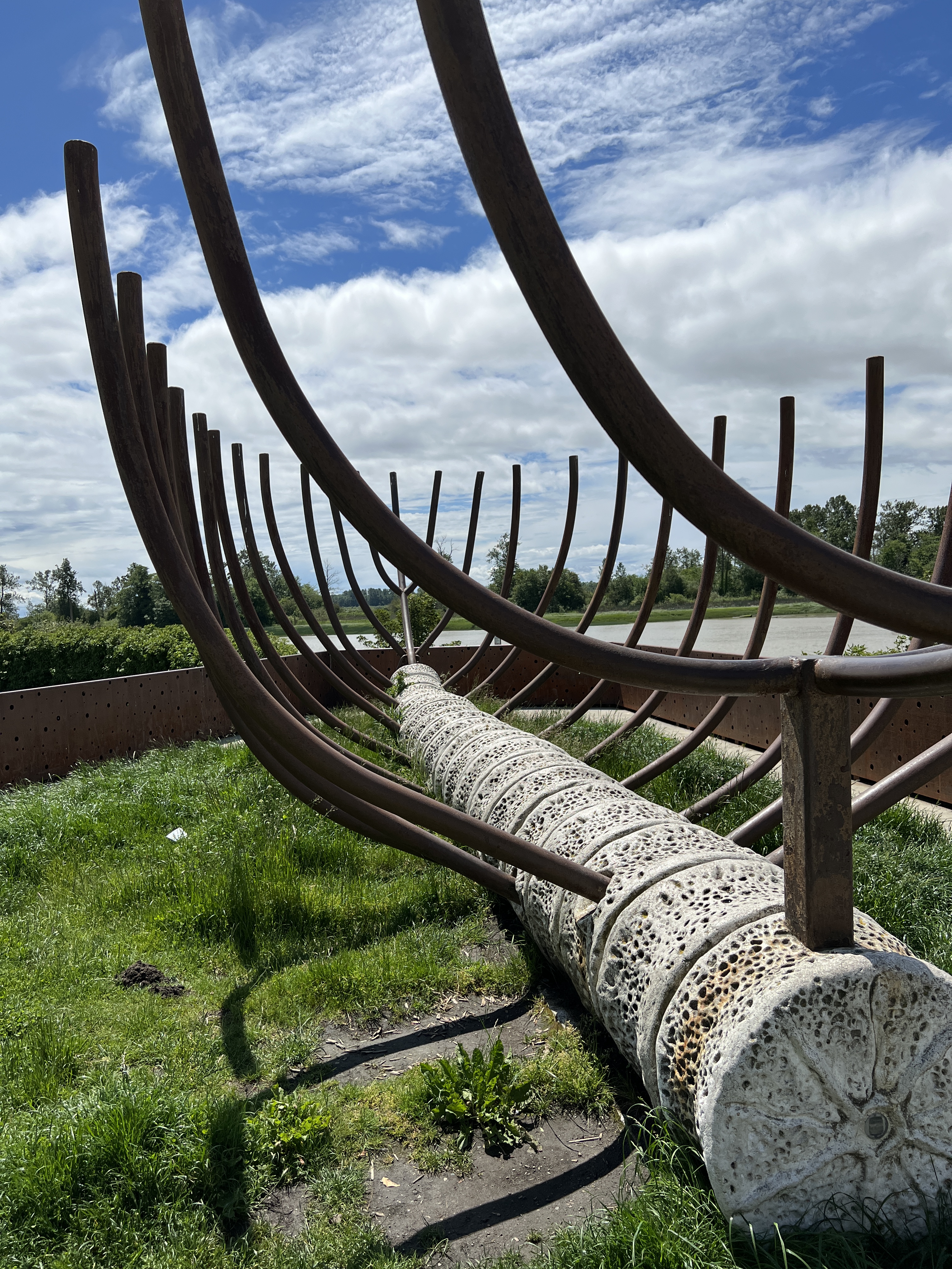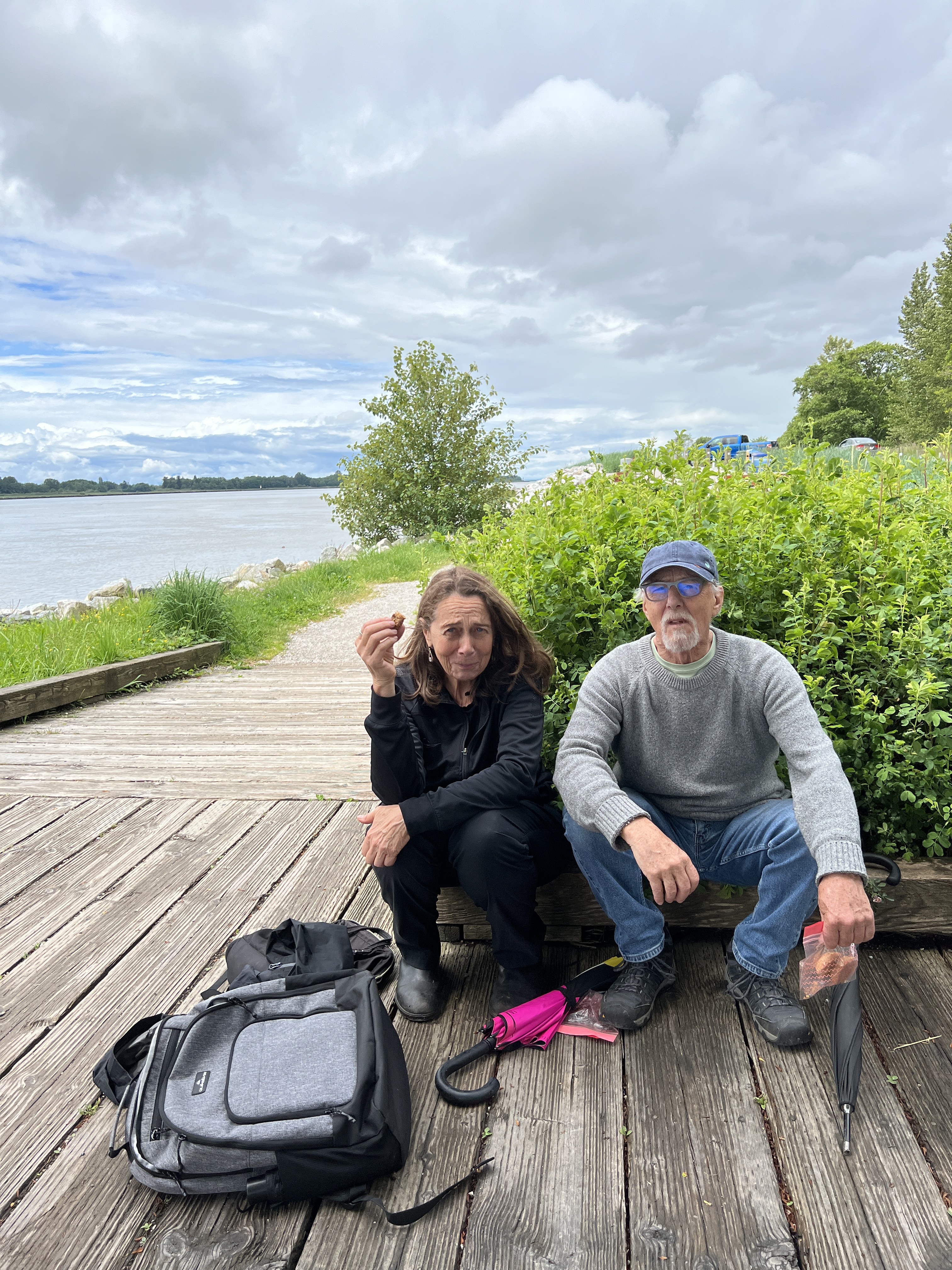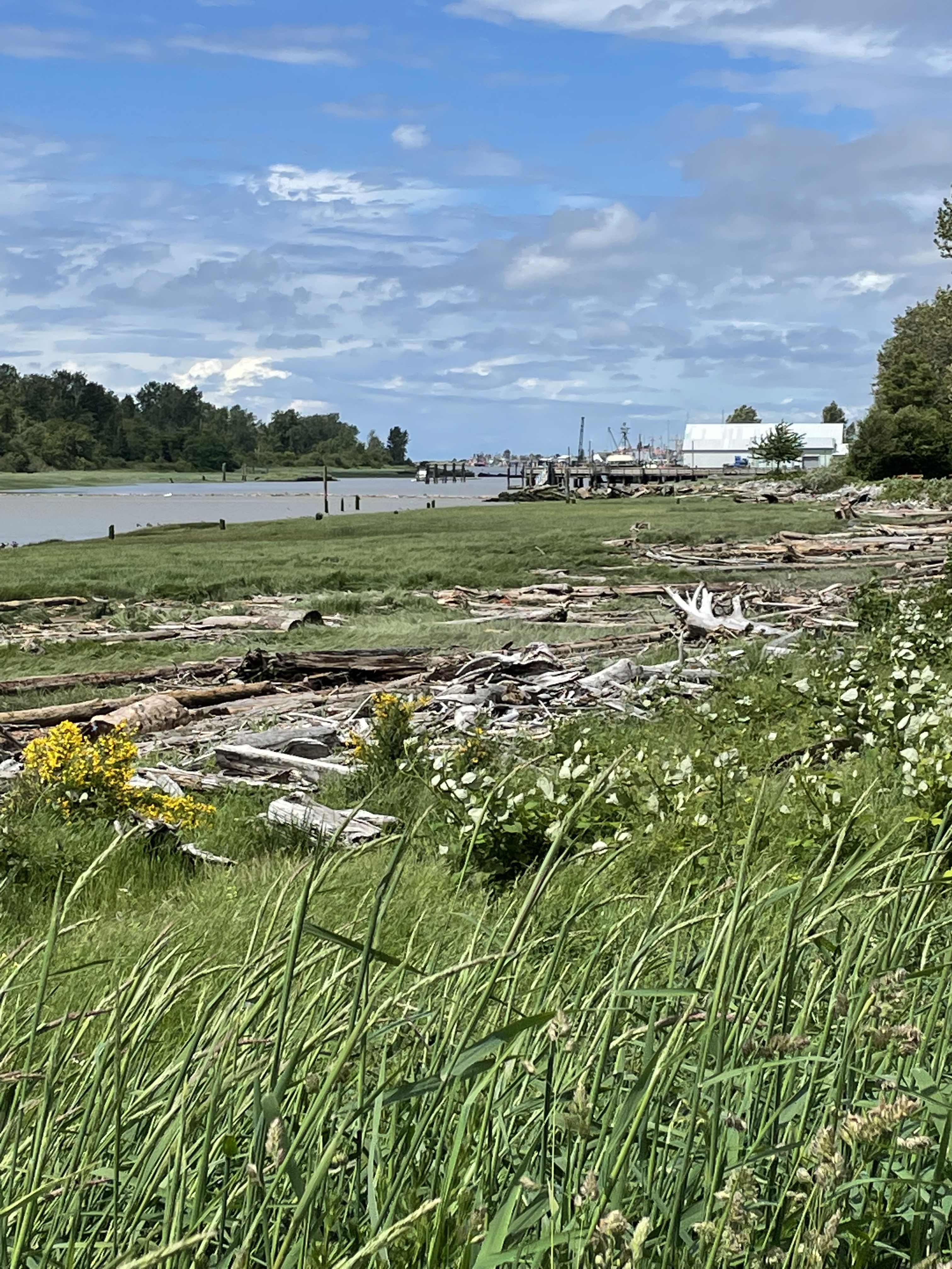 Just west of No. 2 Road we admired the wild rose bushes in bloom, busy with bees, and a bed of purple irises and yellow lilies, planted beside Murakami House, part of the fascinating Britannia Shipyards historic site. Inside Murakami House are displays of items which illustrate the lives of the former inhabitants; next door, examples of wood carving, accompanied by an actual carver, were on display. By this time the sun was out, and the sky was blue, with light wind off the water.