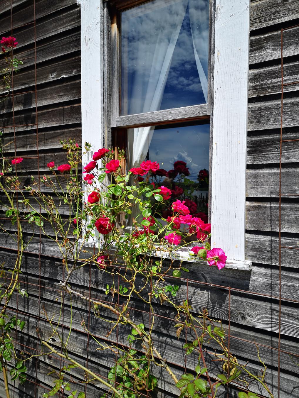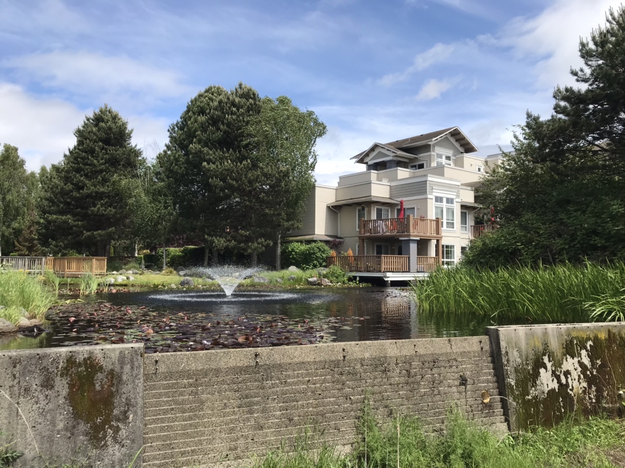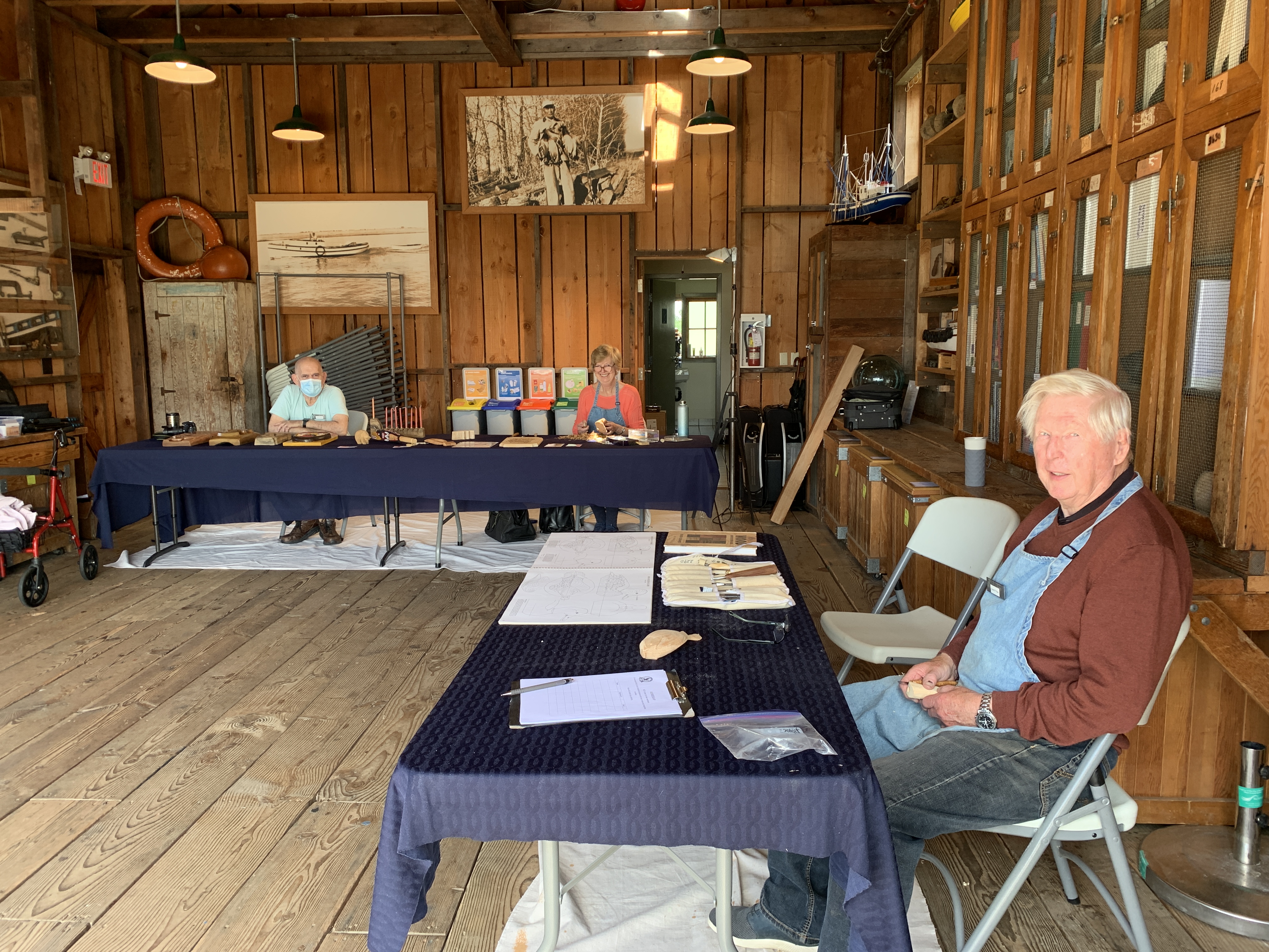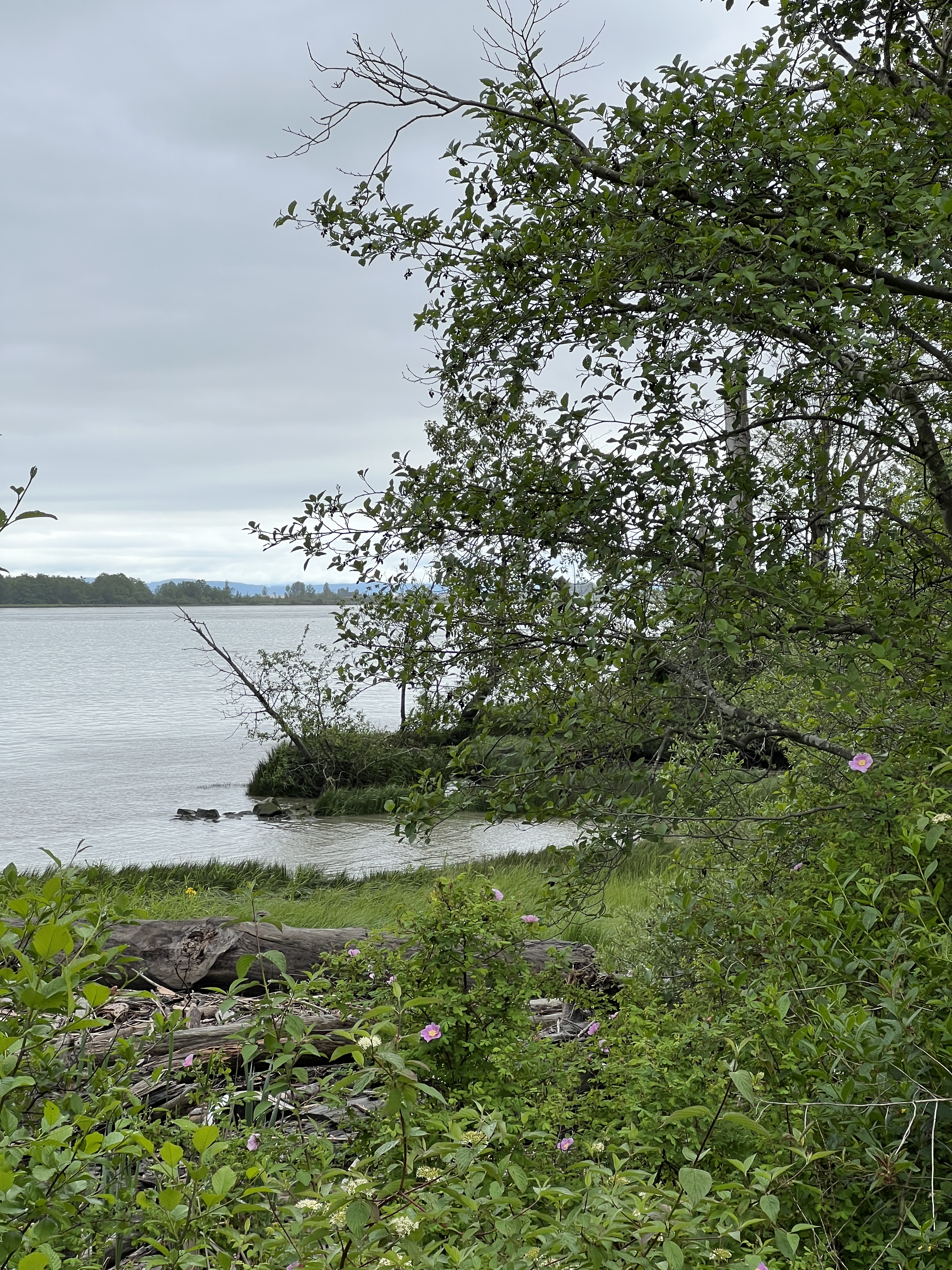 Just west of No. 2 Road we admired the wild rose bushes in bloom, busy with bees, and a bed of purple irises and yellow lilies, planted beside Murakami House, part of the fascinating Britannia Shipyards historic site. Inside Murakami House are displays of items which illustrate the lives of the former inhabitants; next door, examples of wood carving, accompanied by an actual carver, were on display. By this time the sun was out, and the sky was blue, with light wind off the water.