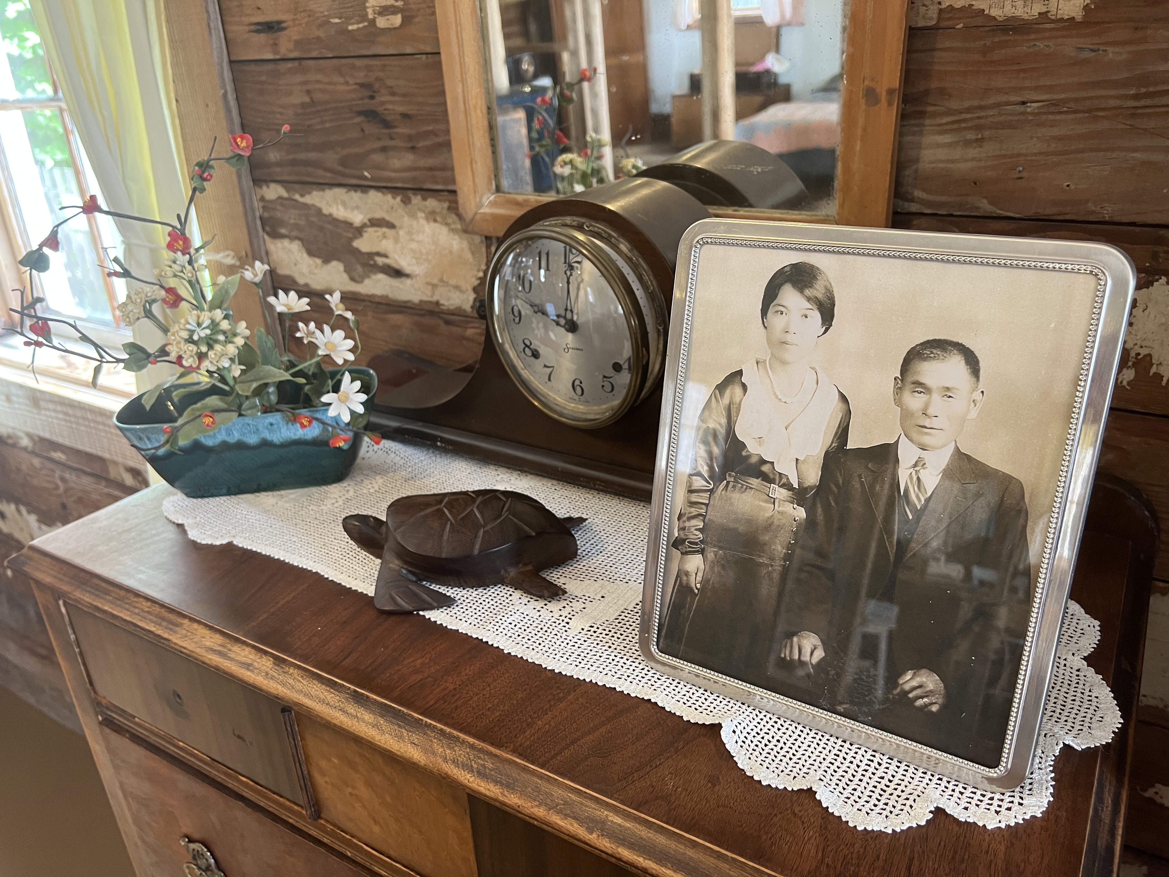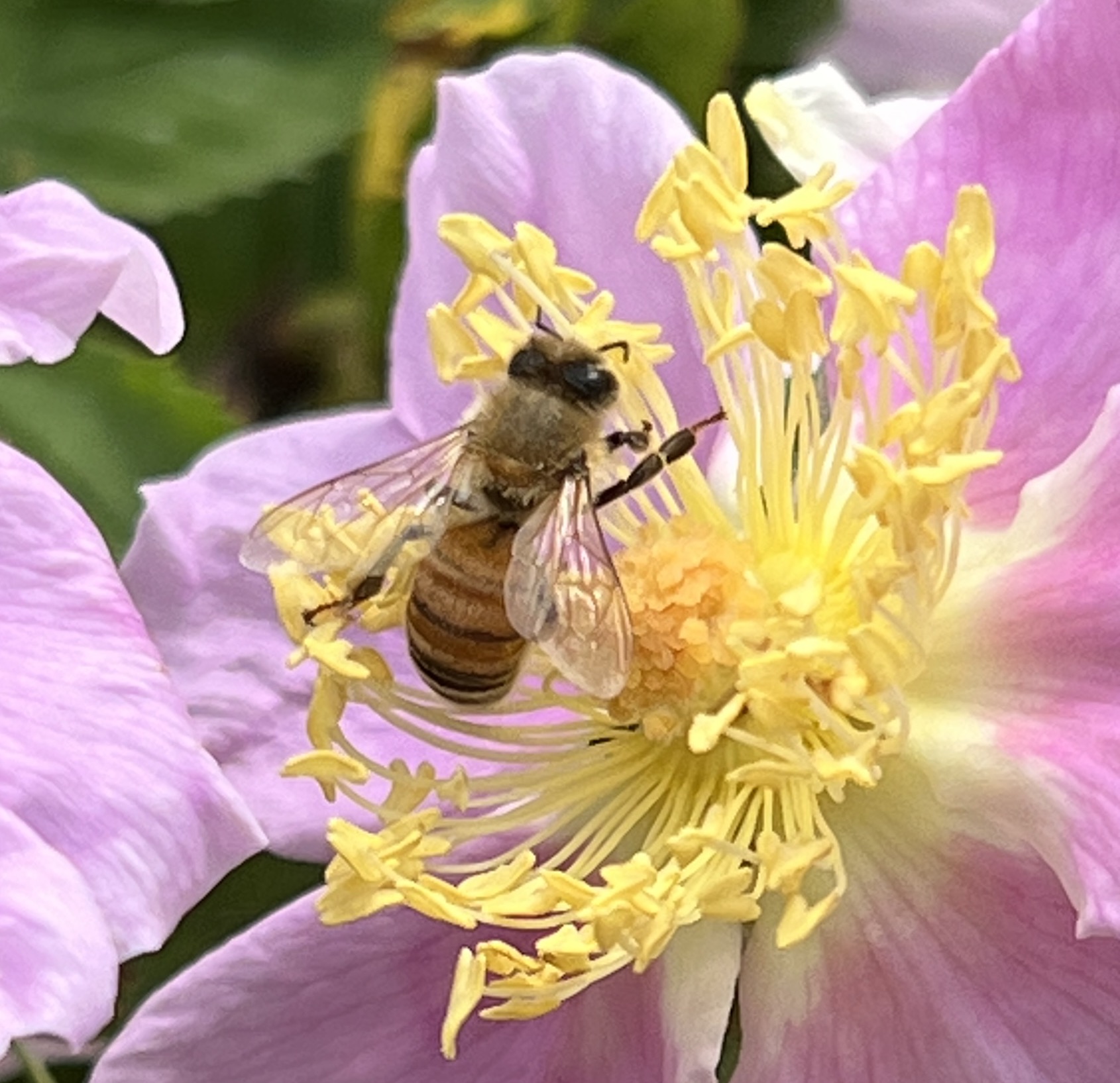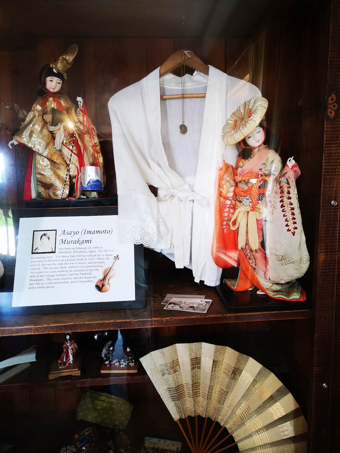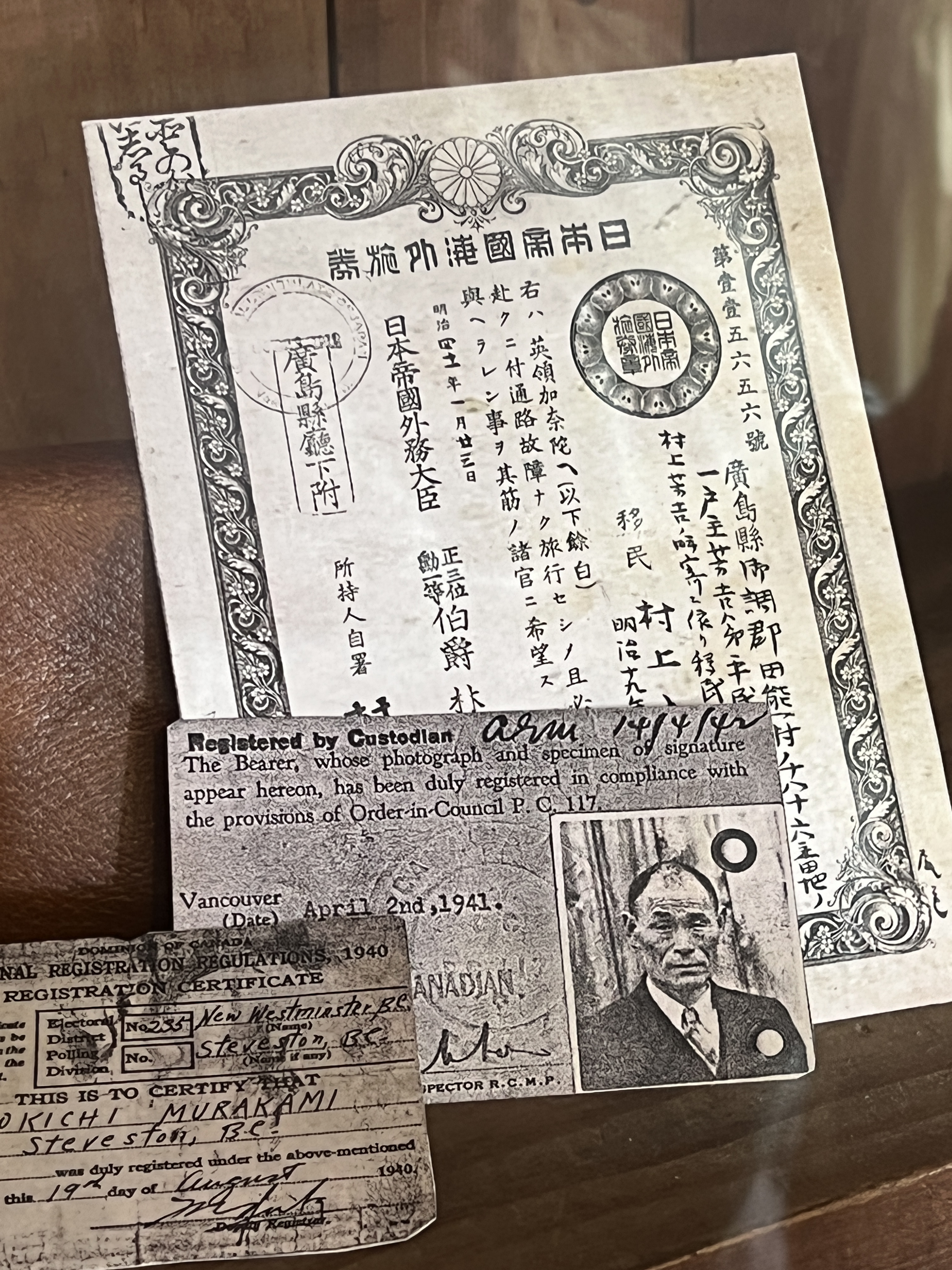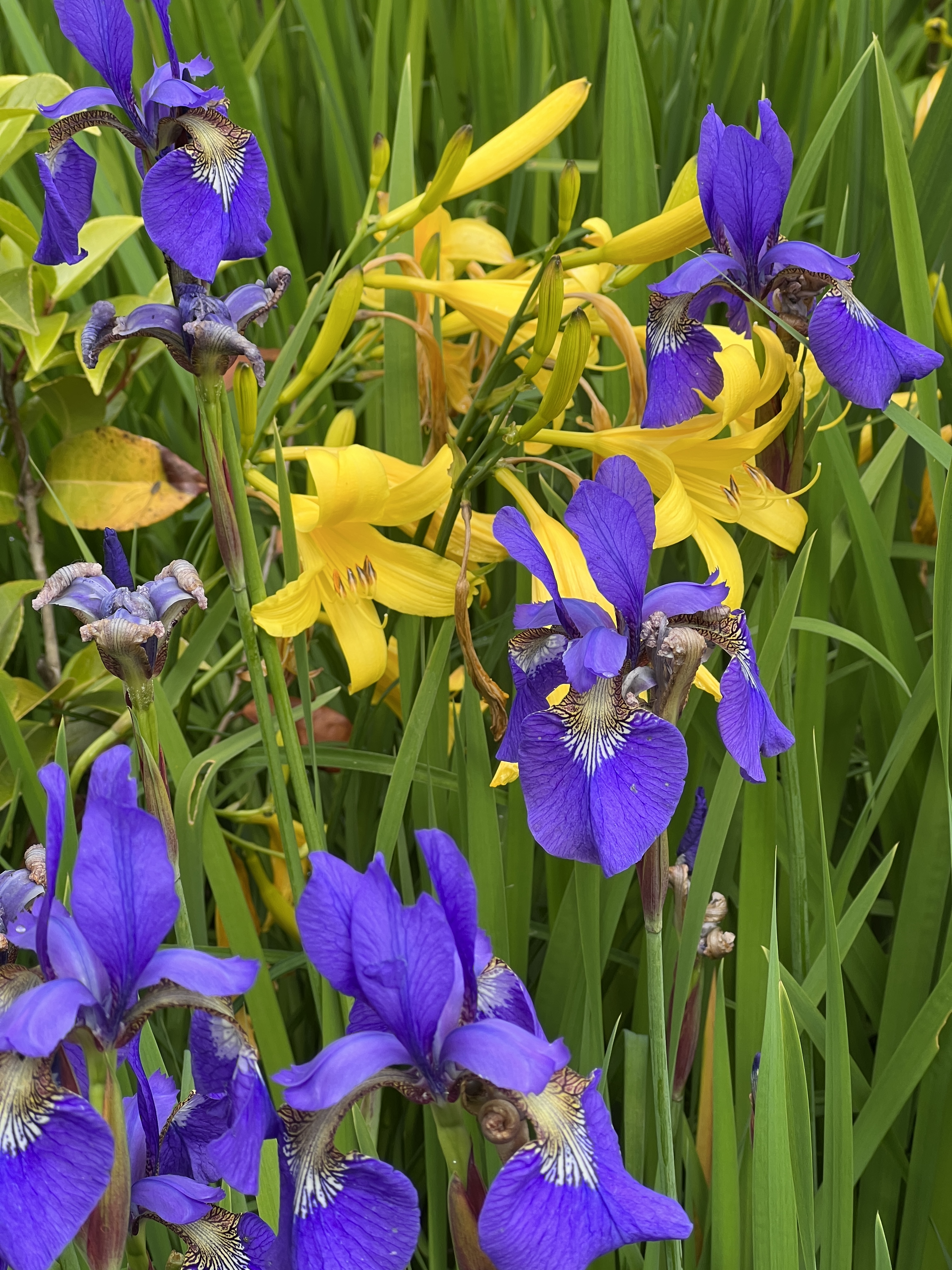 Just west of No. 2 Road we admired the wild rose bushes in bloom, busy with bees, and a bed of purple irises and yellow lilies, planted beside Murakami House, part of the fascinating Britannia Shipyards historic site. Inside Murakami House are displays of items which illustrate the lives of the former inhabitants; next door, examples of wood carving, accompanied by an actual carver, were on display. By this time the sun was out, and the sky was blue, with light wind off the water.
