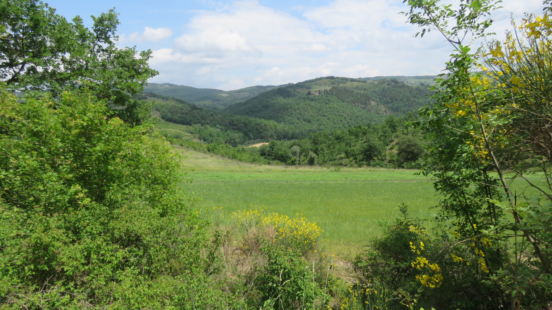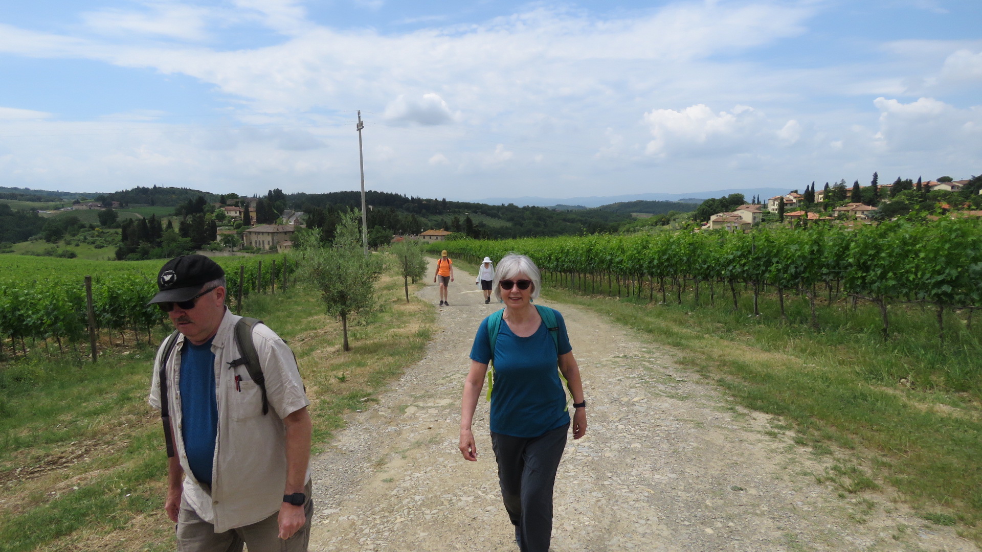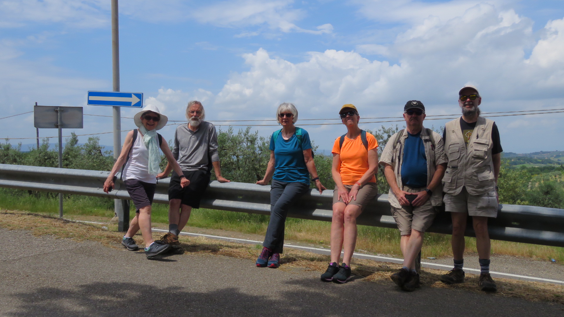 Because we would be all going our separate ways on the official looping Sunday, the Tuscan contingent did our walk early. On May 30, a beautiful sunny day, six Loopers set out from our villa in San Donato. (Two stayed home to mind the fort.) Our route took us uphill past some vineyards and into rolling hills, sometimes along roads and sometimes trails.