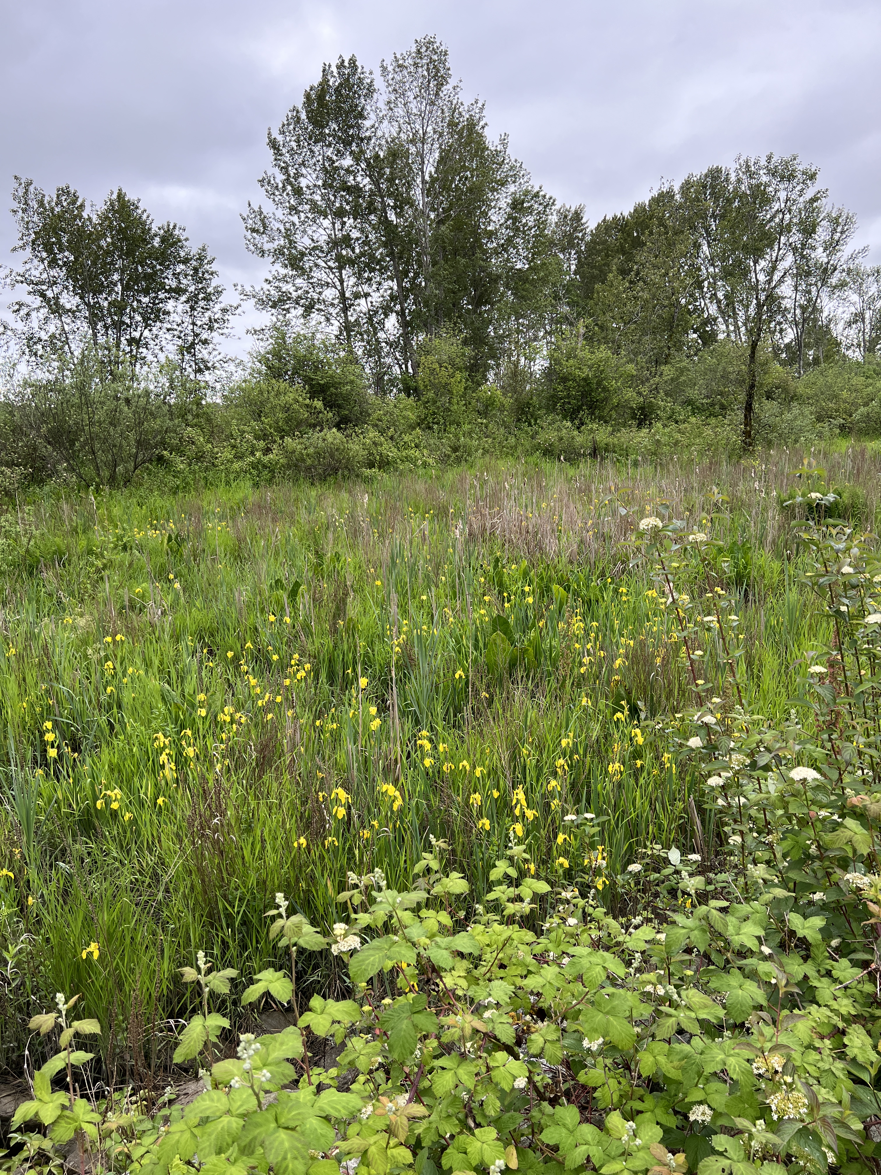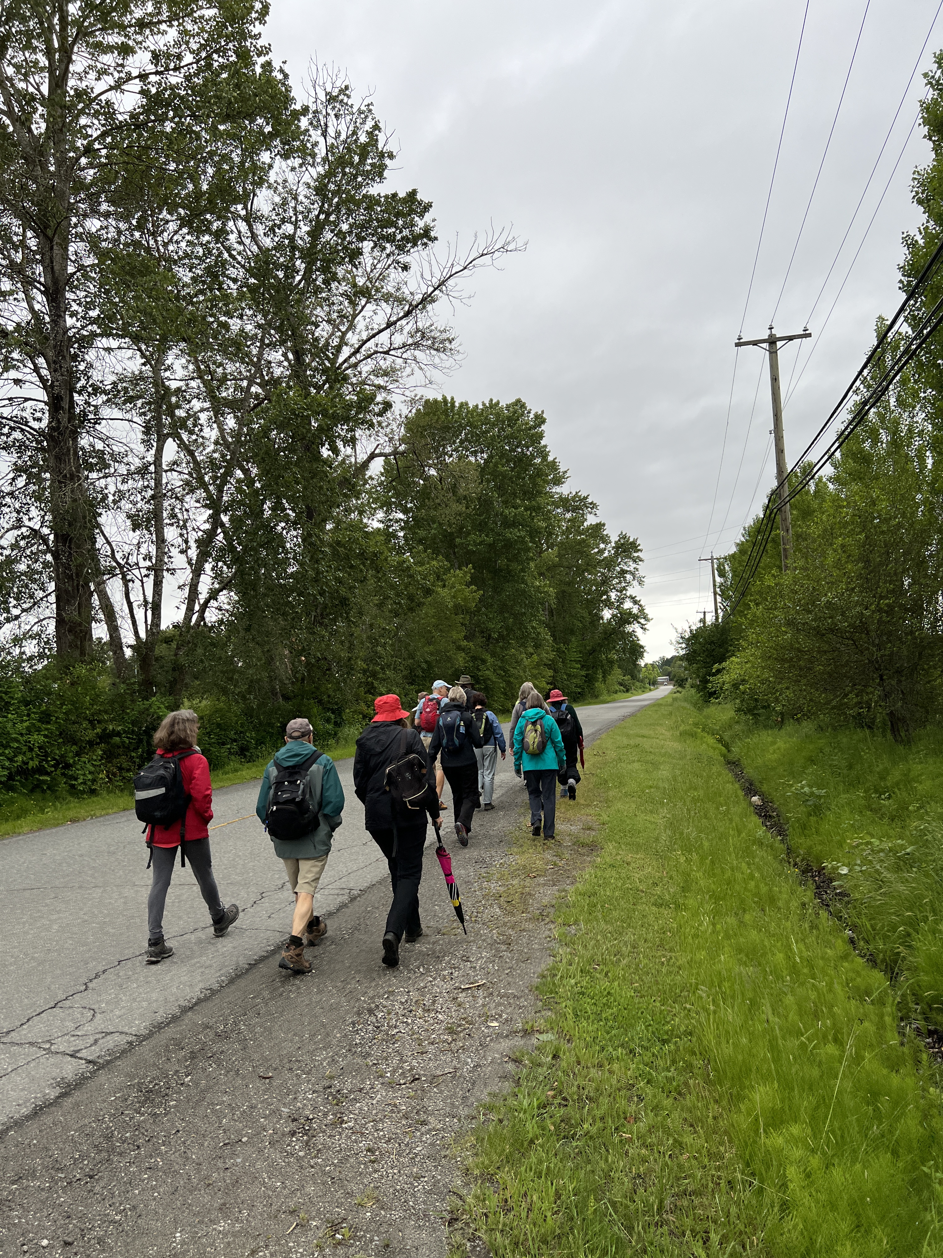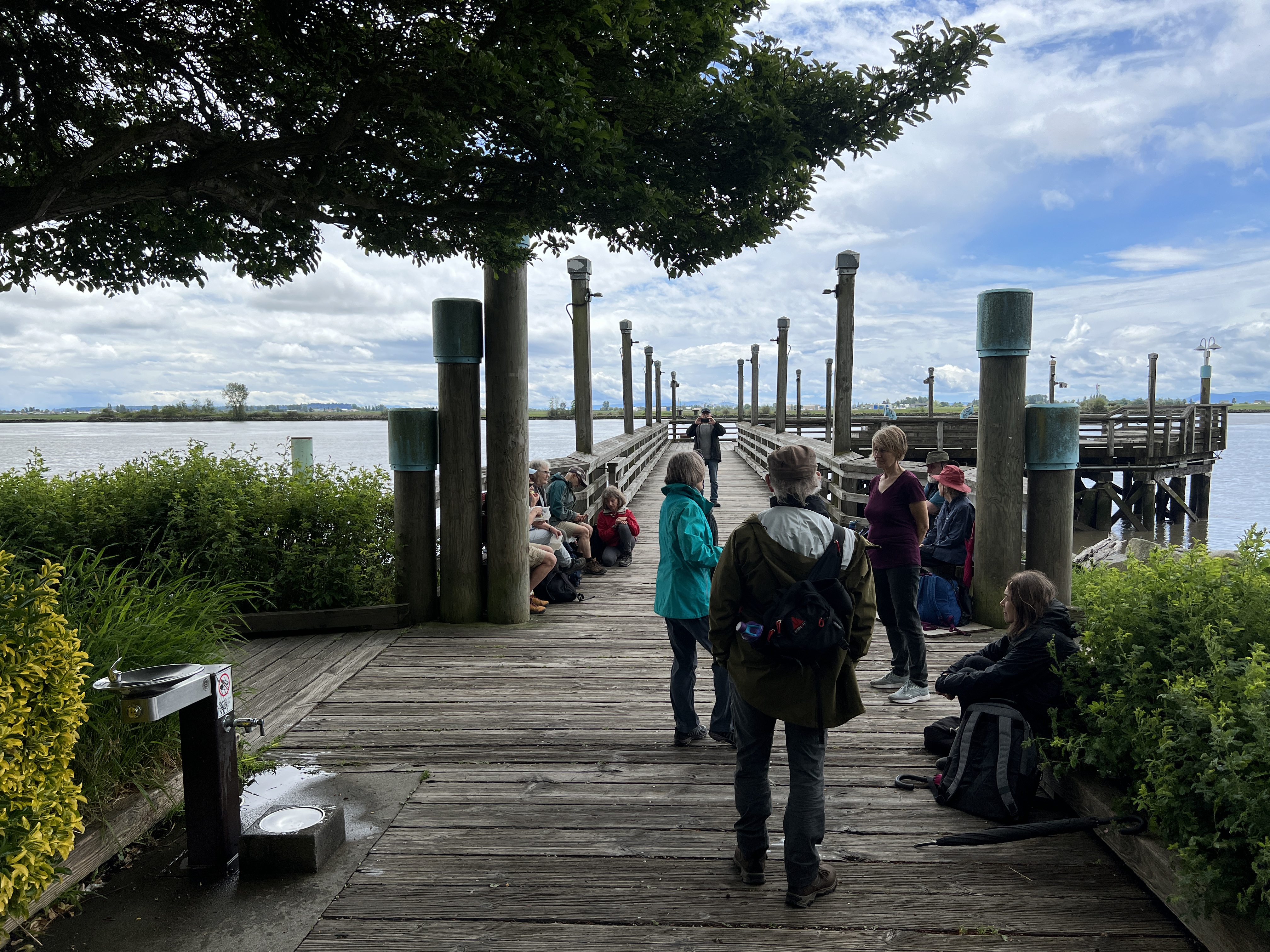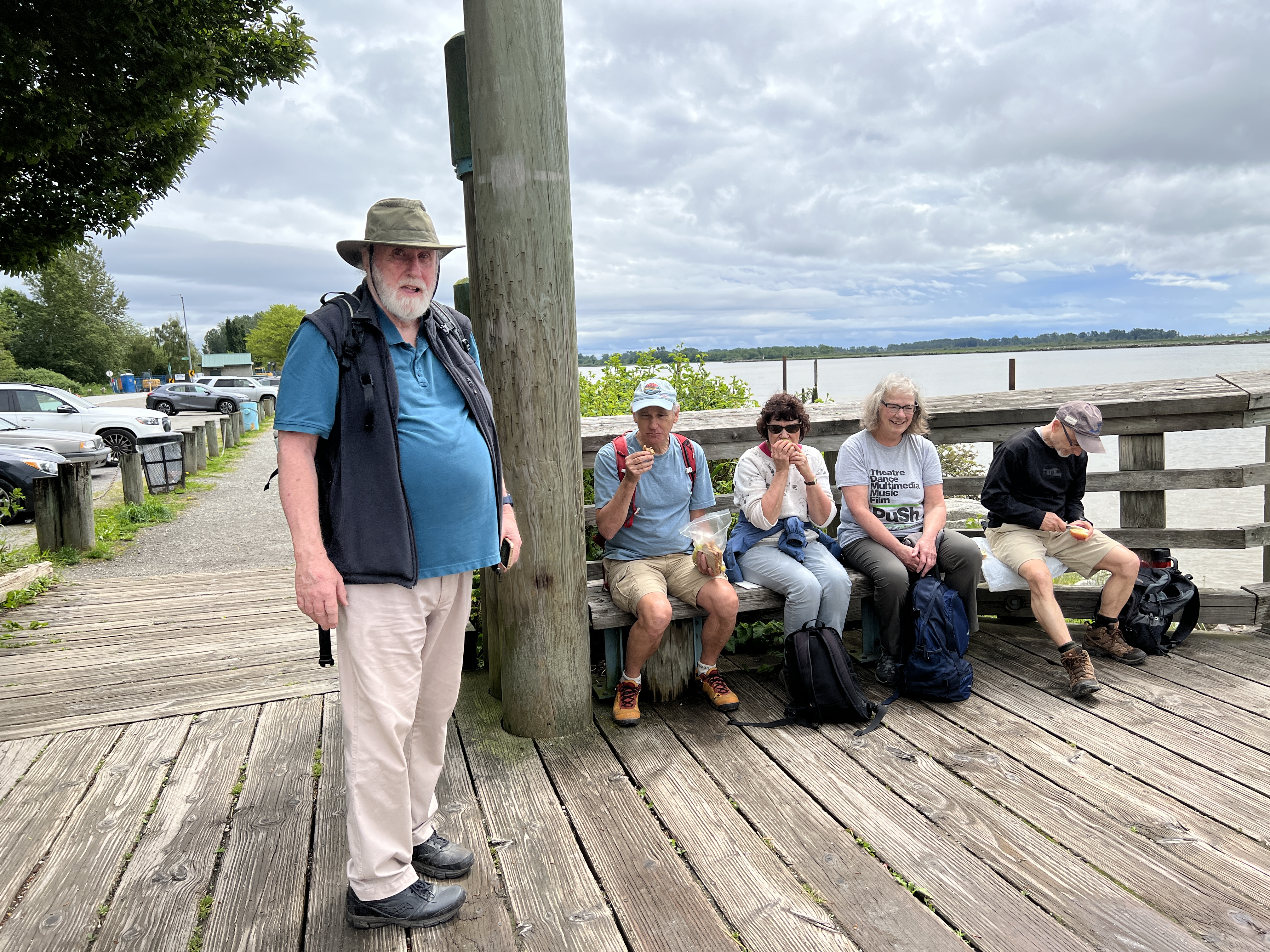 Since this was a “one direction” walk rather than a loop, some car shuffling was required, and three cars ferried the group from our meet-up point at Garry Point Park in Steveston to our starting point: the small parking lot of the Model Airplane Park on Rice Mill Road. After the requisite group photo (above), the group set out beneath cloudy (but not rainy) skies.