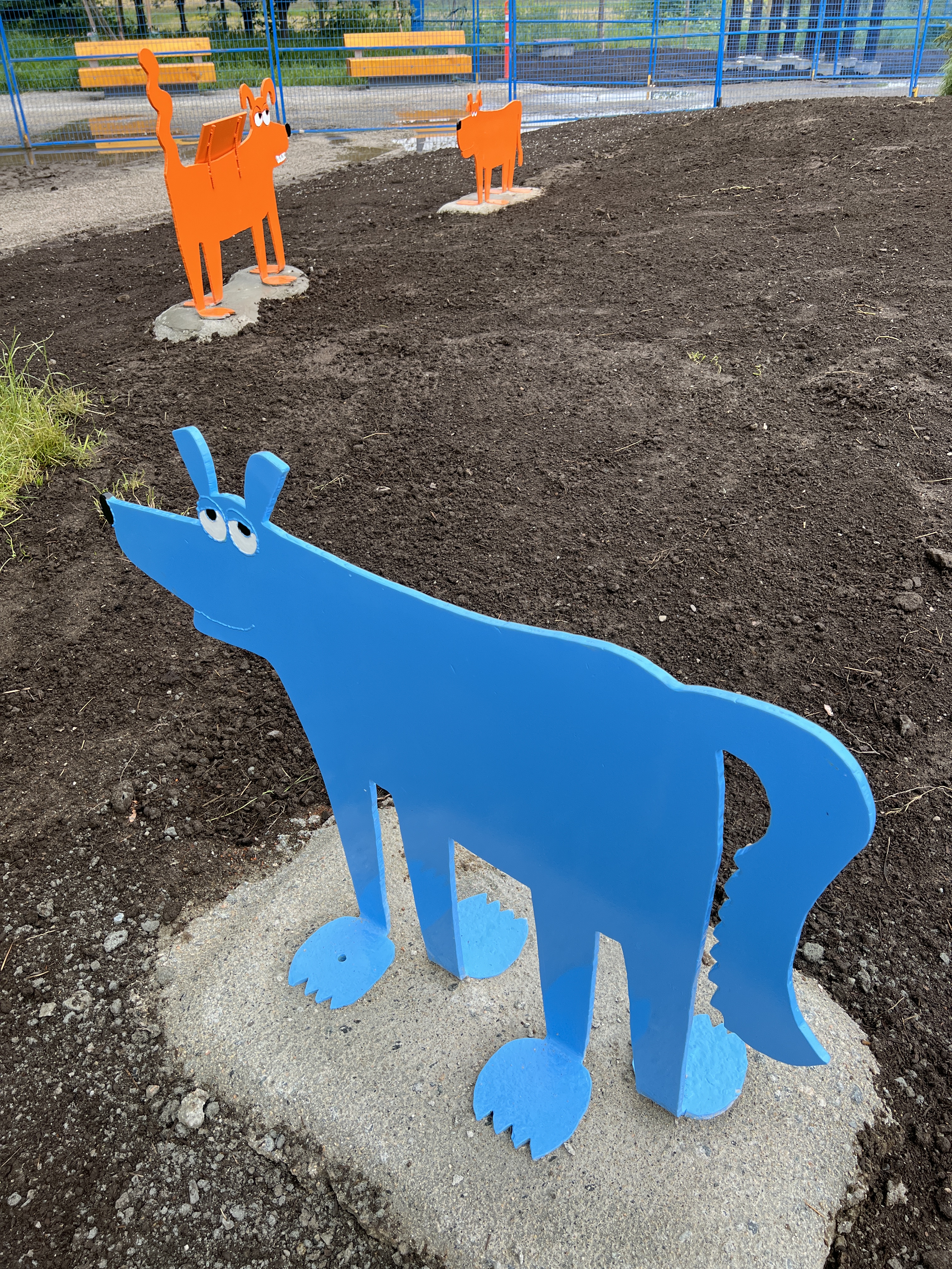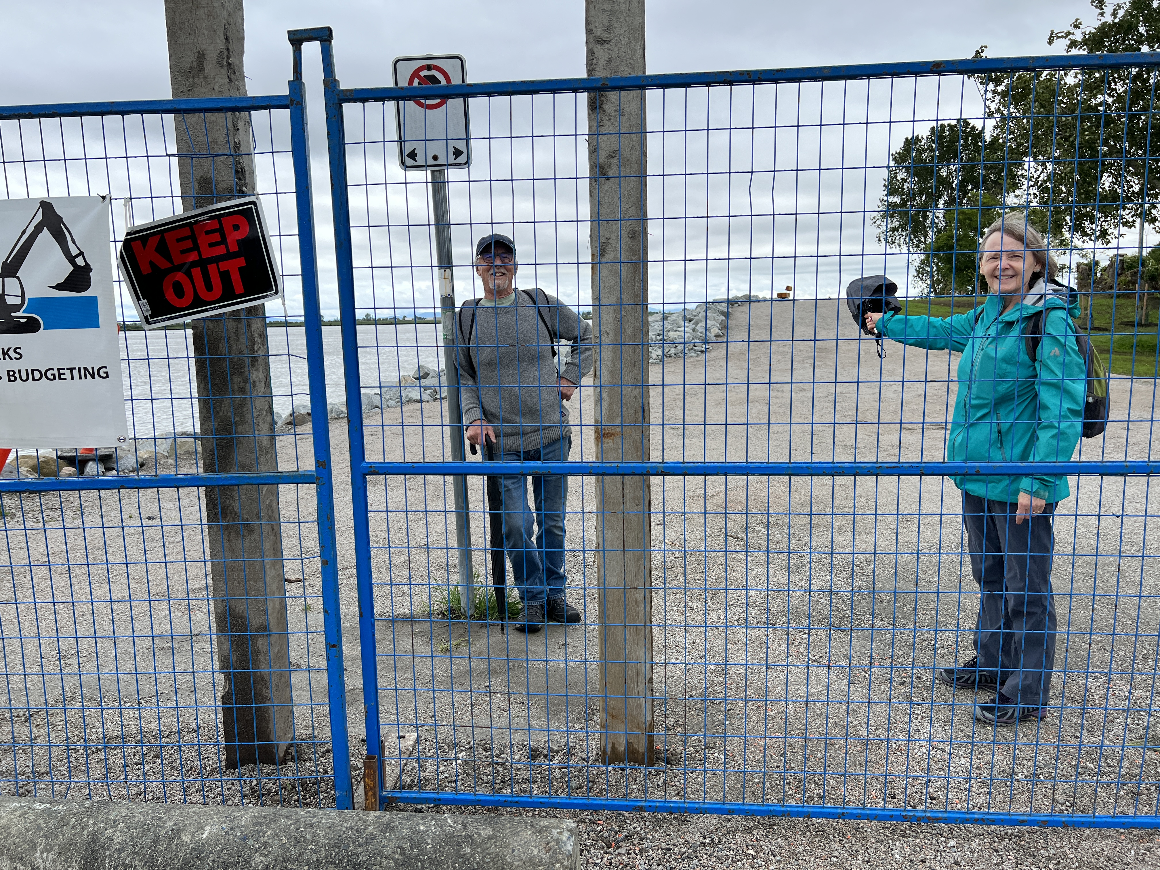 Just beyond Finn Slough, blue fences protect all but the most illiterate of walkers from the hazards of the dike-raising worksite (idle on Sundays). At the (roughly) half-way point of our walk, we paused for snacks on benches beside No. 3 Road Fishing Pier, whose washrooms are guarded by a mysterious white-padded figure wielding some sort of water cannon.