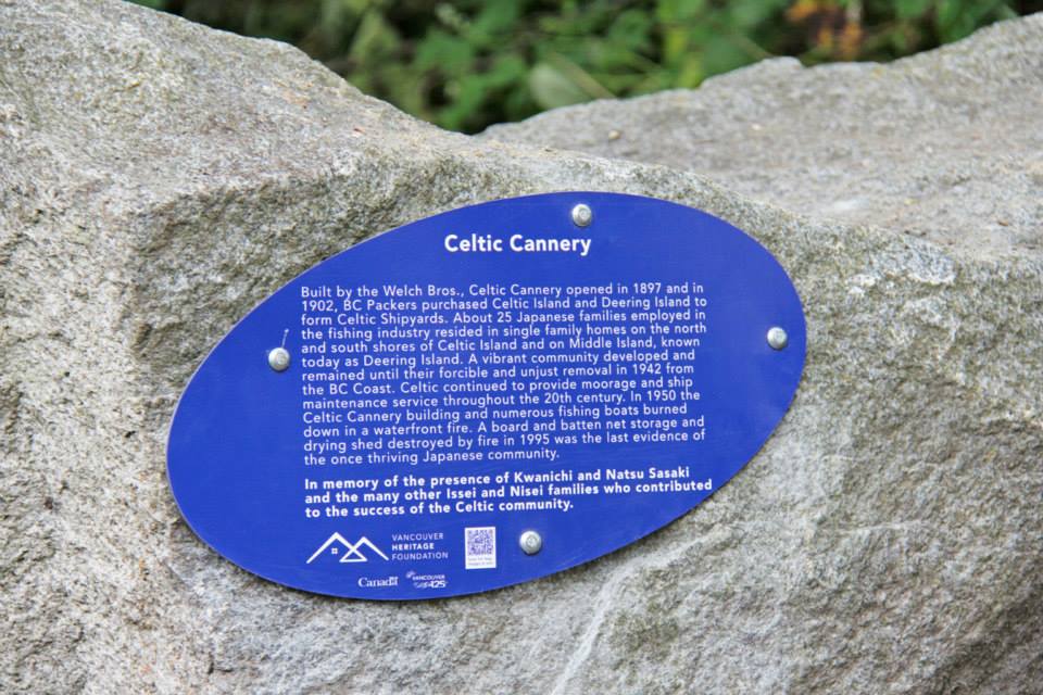 At the foot of Blenheim there used to exist a Japanese Canadian community called Celtic Cannery Located on two islands; Celtic Island (now no longer an island) and Middle Island (now called Deering Island). The cannery was started in the late 1800’s and was subsequently bought by BC Packers and converted into a shipyard. The Japanese were employed as fishermen by BC Packers and the community continued until the Second World War, when they were forcibly removed. A commemorative plaque marks the location. A few of the Celtic Shipyard buildings continue to exist, and are currently used as workshops and artist studios. There have been proposals to redevelop the area, with considerable resistance from some locals, and none have materialized. Deering Island, on the other hand, was bought and redeveloped in the early 1990’s and now contains luxury homes, many with their own boat docks. A small park at the west end of Deering Island proved to be a good spot for a snack break.