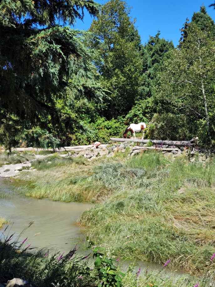We proceeded up Angus Drive and cut across Riverview Park to join up with the Arbutus Greenway. (I am not sure how Riverview Park got its name since you cannot actually see the river from it. I suppose perhaps if you climbed a tree…) We walked up the Greenway past community garden plots as far as 54th Avenue, where we turned west to Maple Grove Park. The park has a very popular wading/swimming pool. From there we headed west on 49th Avenue. After crossing Marine Drive we descended to Southlands and took Balaclava Street back down to the river. Walking through Southlands is like a stroll in the country with its mix of older homes, horse stables, and some rather grandiose estates.