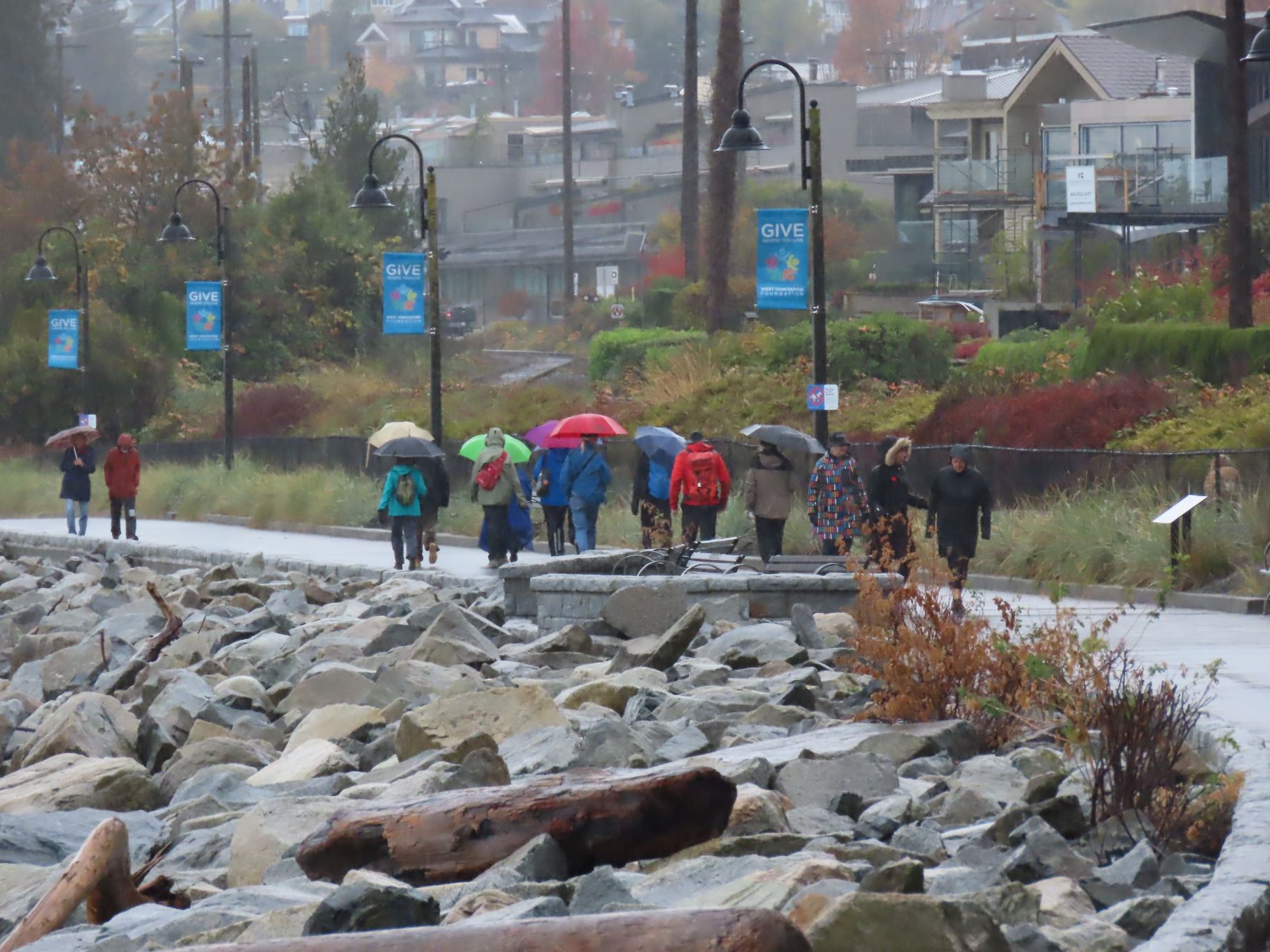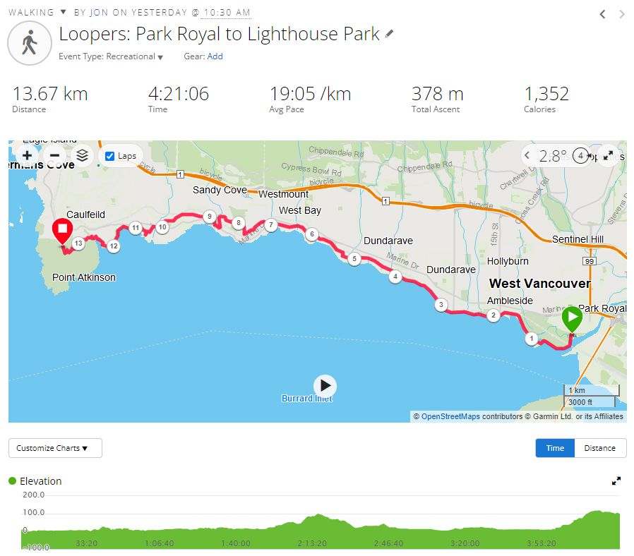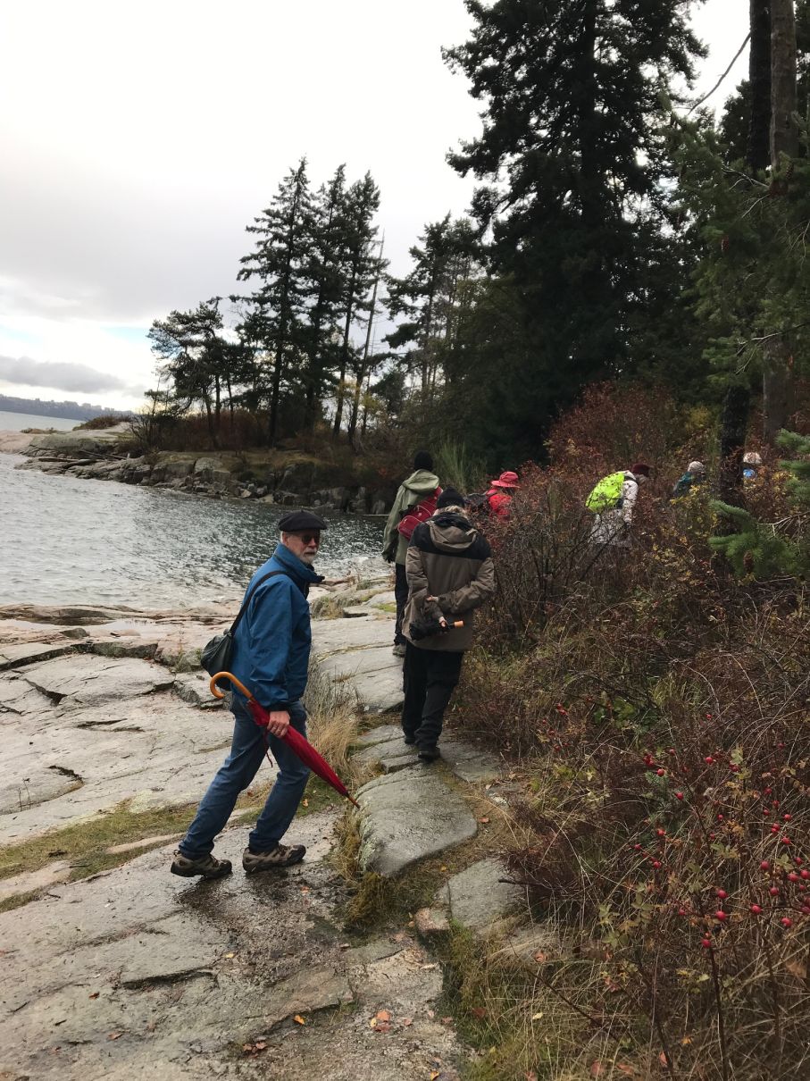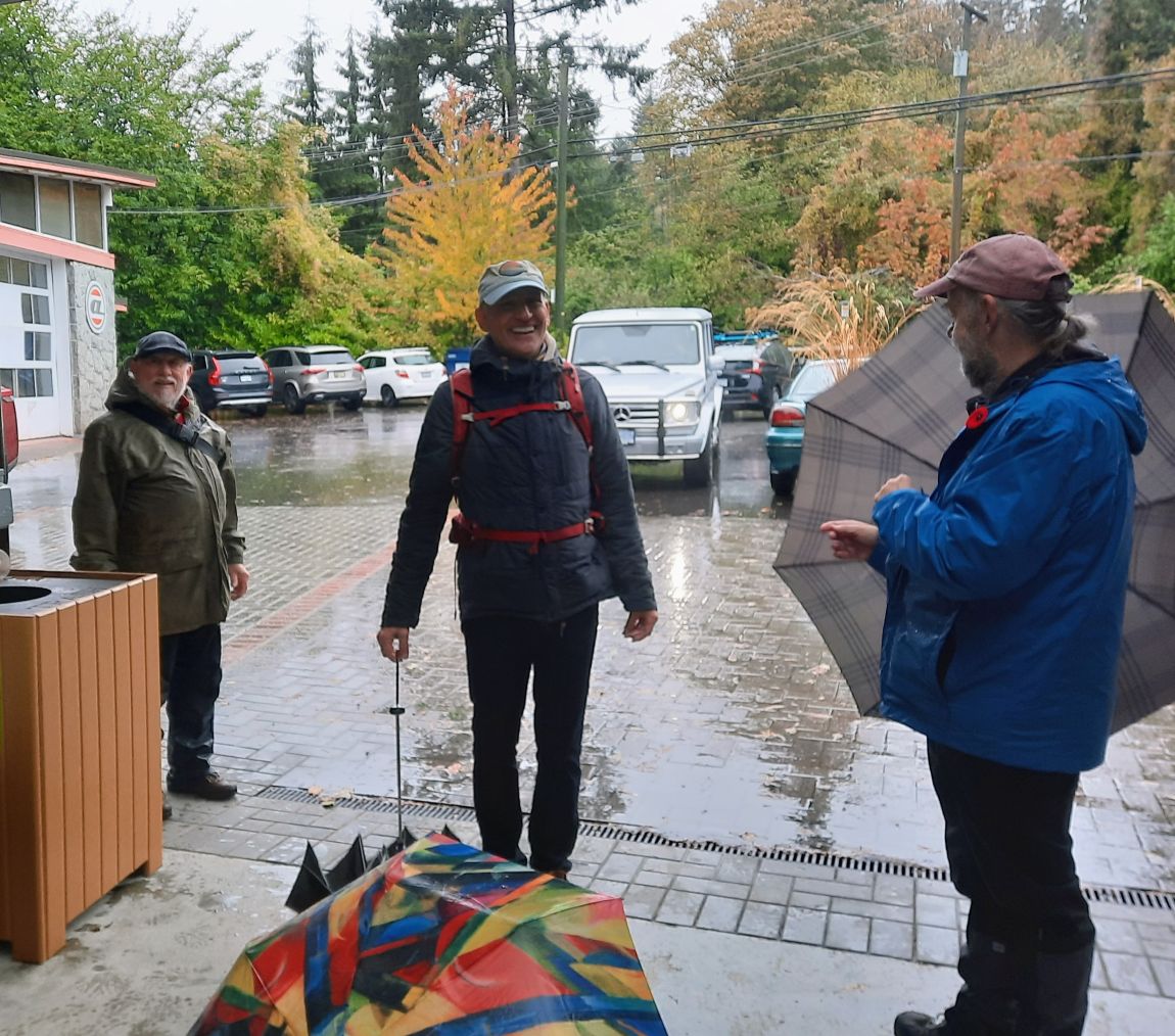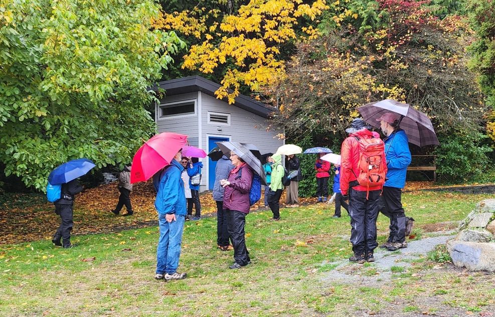 21 Loopers gathered for this month’s walk on the Spirit Trail just south of the Park Royal Mall. With umbrellas deployed, the group headed down to Ambleside Park and westward along the shore of English Bay. We strolled through Ambleside Park, past Ambleside Village, and along the seawall walk to Dundarave. The crew broke into several groups along the way (repeated in variations over the day). We all regrouped upon reaching Dundarave where people took the opportunity for snacks and wardrobe adjustments.