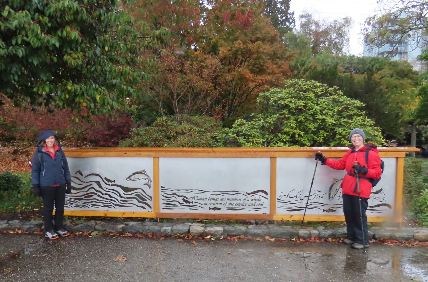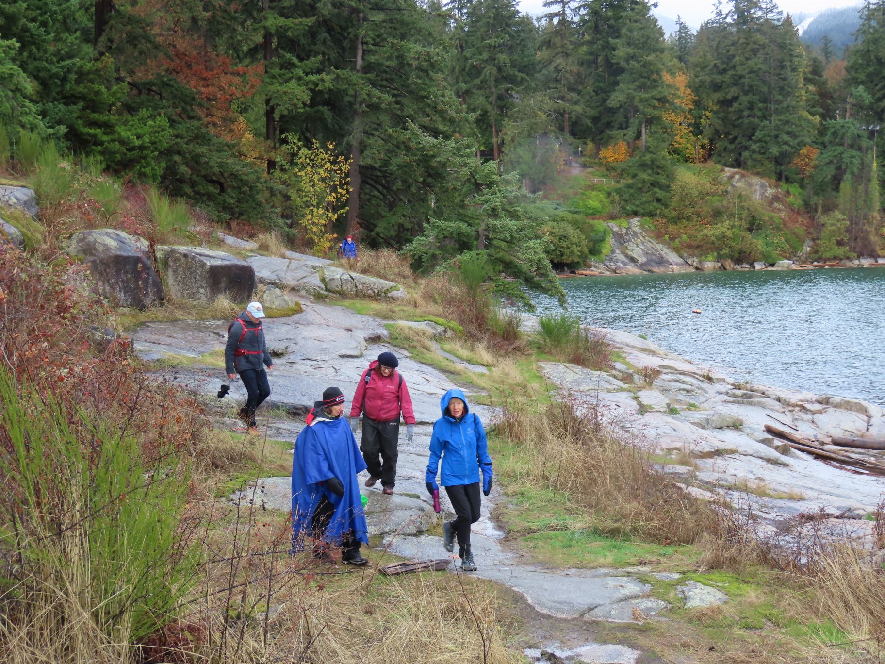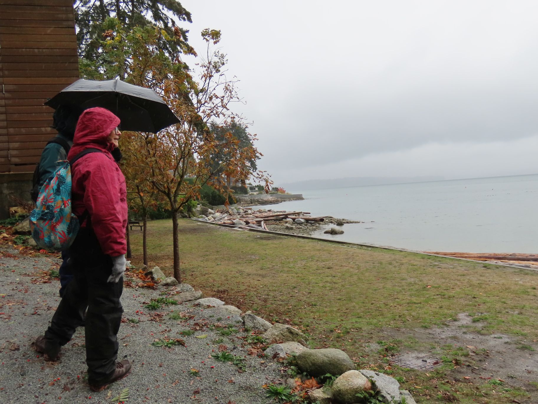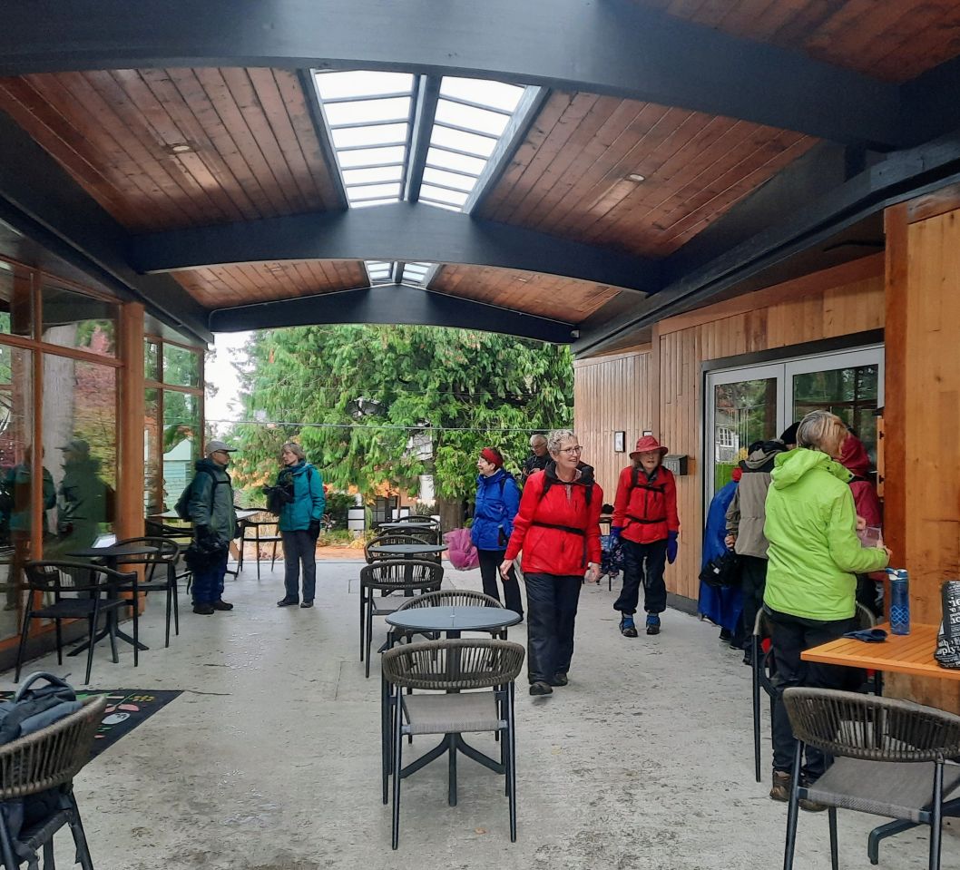 21 Loopers gathered for this month’s walk on the Spirit Trail just south of the Park Royal Mall. With umbrellas deployed, the group headed down to Ambleside Park and westward along the shore of English Bay. We strolled through Ambleside Park, past Ambleside Village, and along the seawall walk to Dundarave. The crew broke into several groups along the way (repeated in variations over the day). We all regrouped upon reaching Dundarave where people took the opportunity for snacks and wardrobe adjustments.