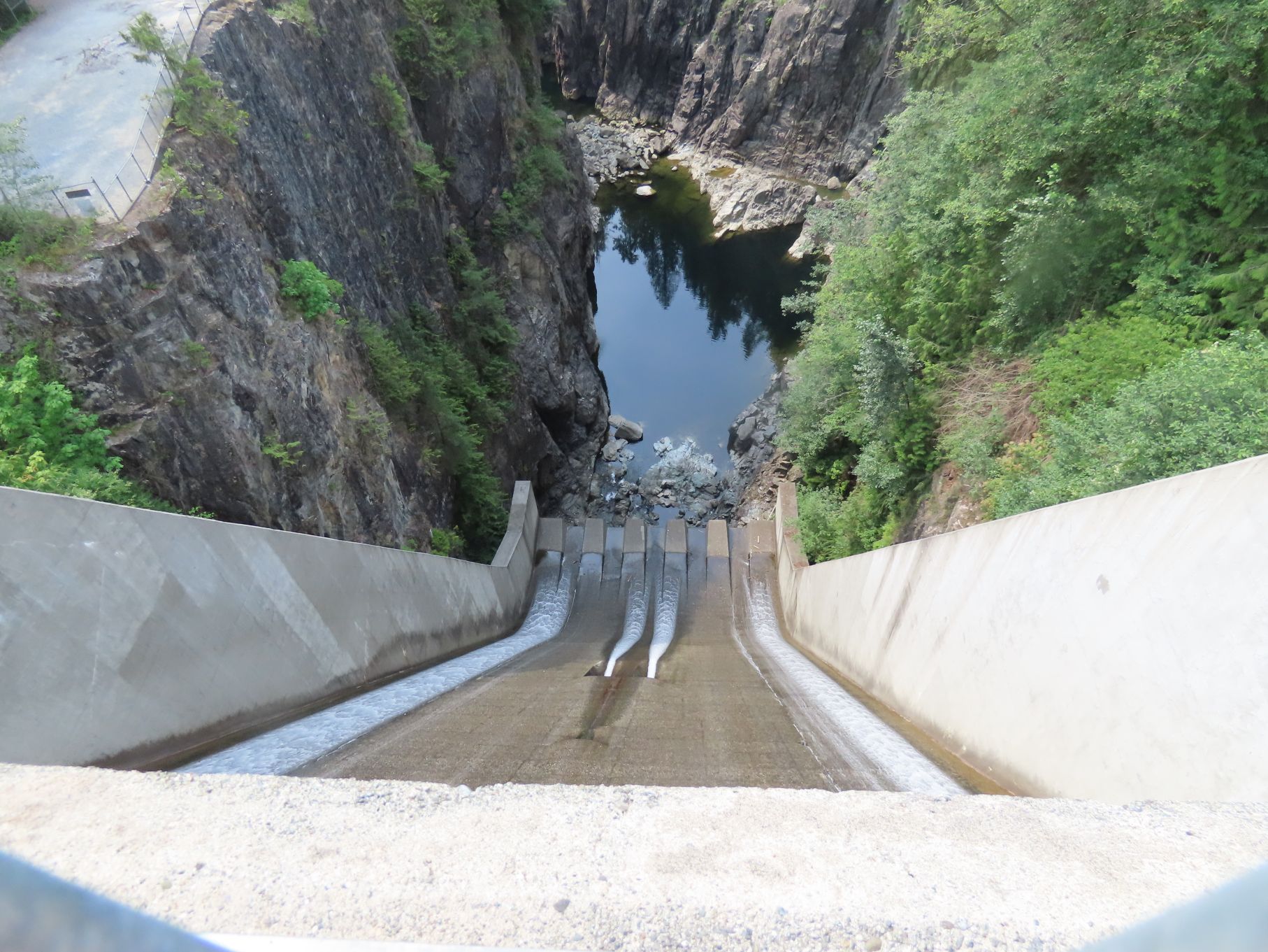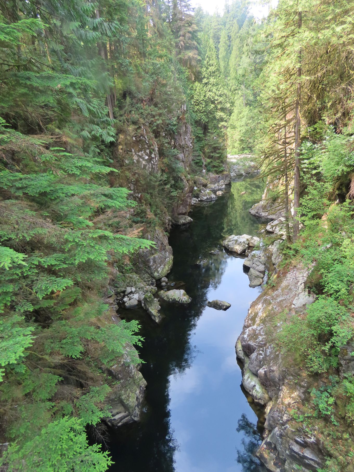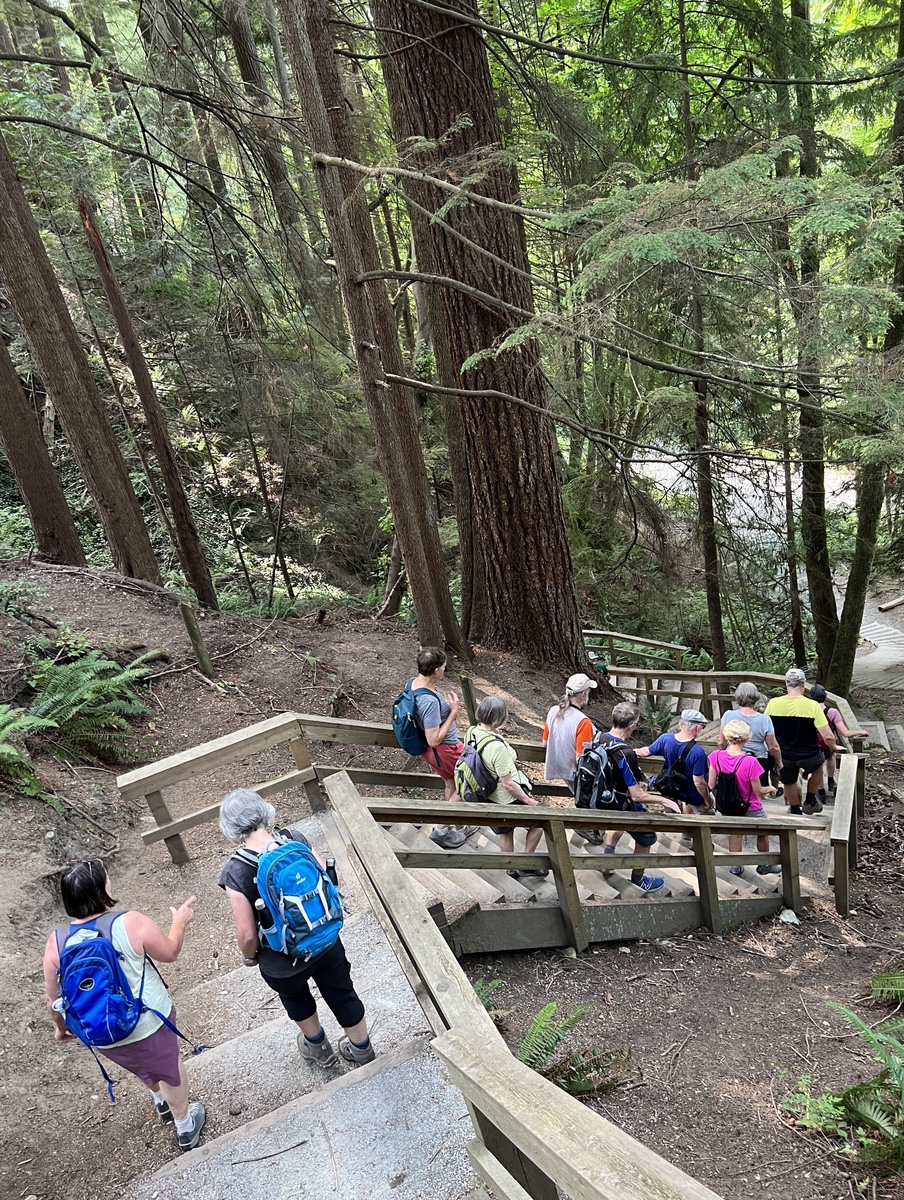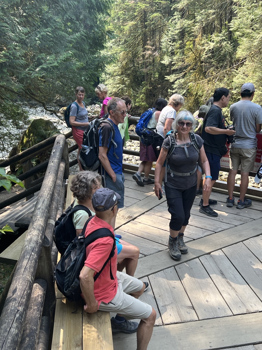 The Capilano Pacific Trail follows the west side of Capilano River uphill through dappled forest to Cleveland Dam, which we crossed to reach the east side of the river, exclaiming at the low level of the river. Snacks were consumed at a picnic table there, before our walk resumed, downhill through the salmon hatchery, passing by various bridges and viewpoints overlooking the river, eventually reaching Capilano Road, which we crossed at Eldon Road.