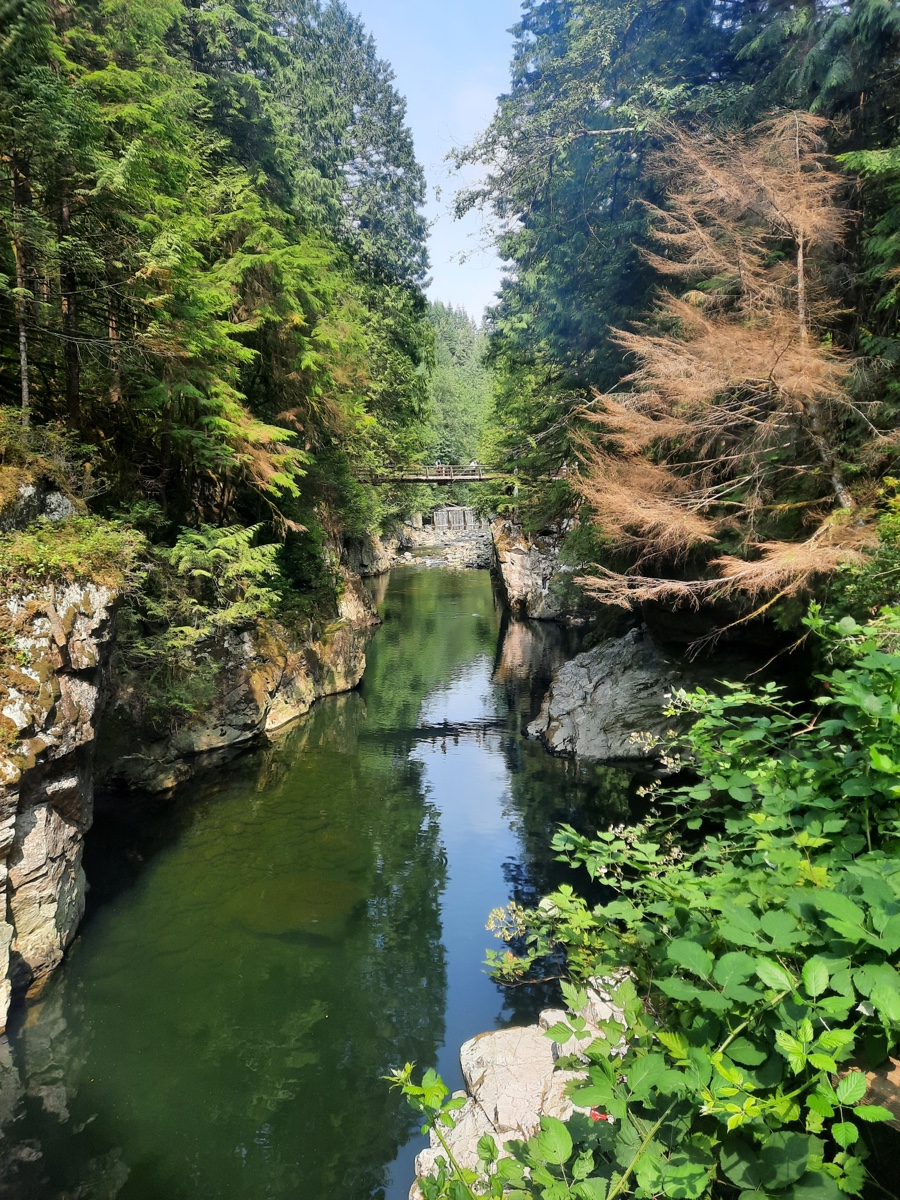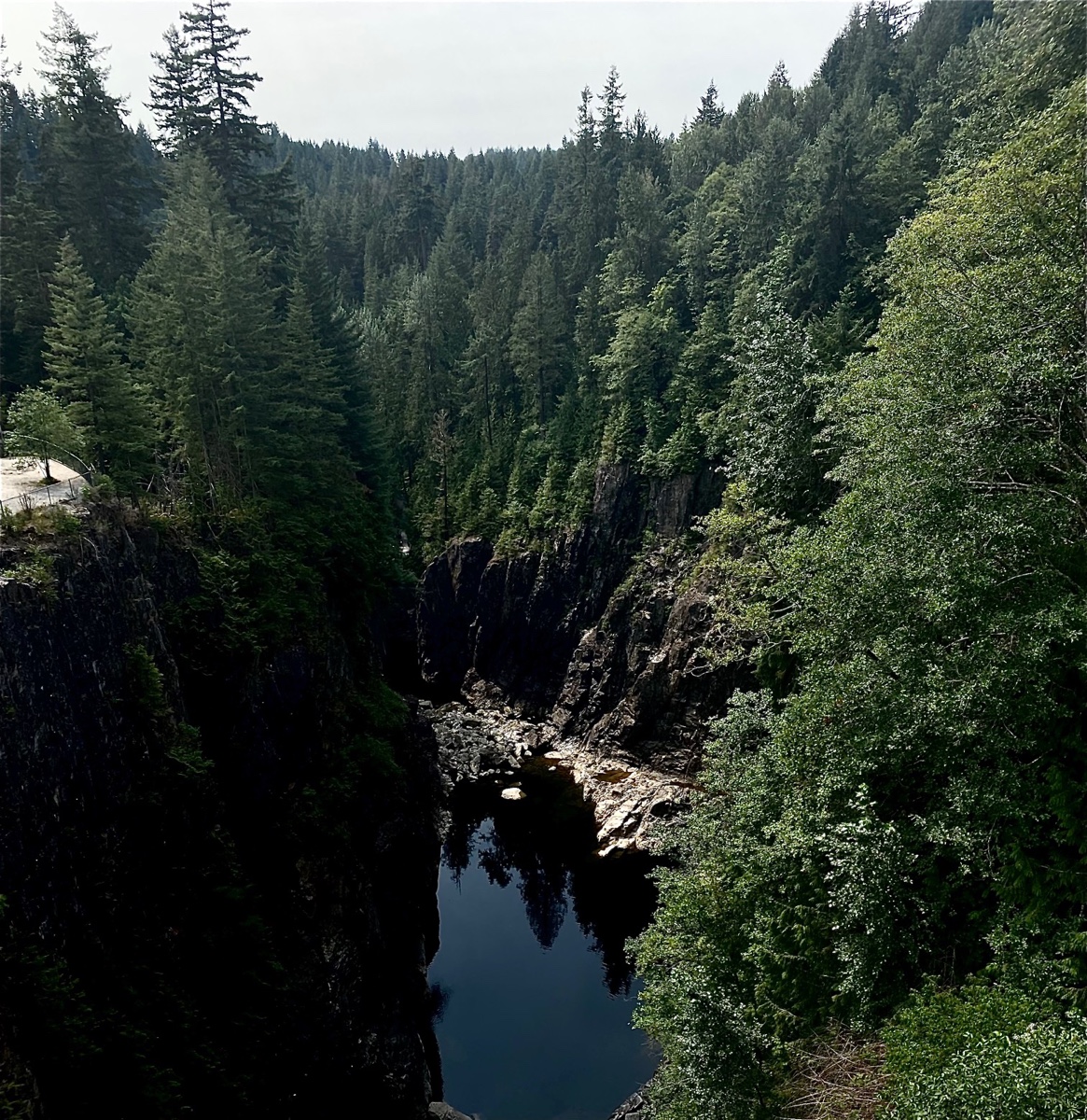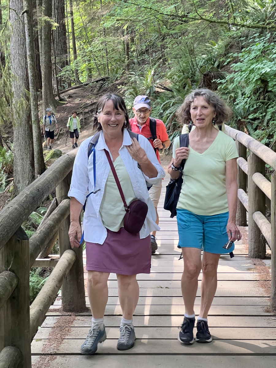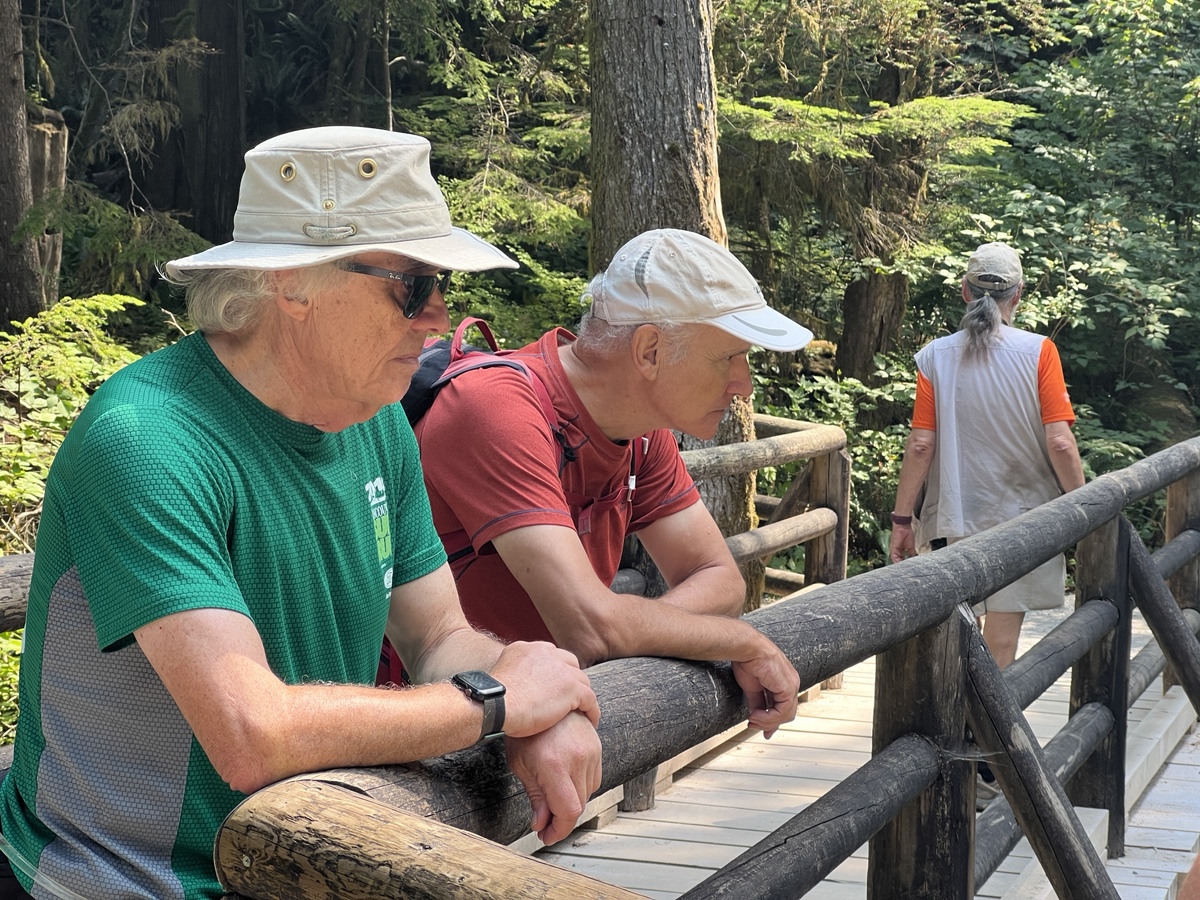 The Capilano Pacific Trail follows the west side of Capilano River uphill through dappled forest to Cleveland Dam, which we crossed to reach the east side of the river, exclaiming at the low level of the river. Snacks were consumed at a picnic table there, before our walk resumed, downhill through the salmon hatchery, passing by various bridges and viewpoints overlooking the river, eventually reaching Capilano Road, which we crossed at Eldon Road.