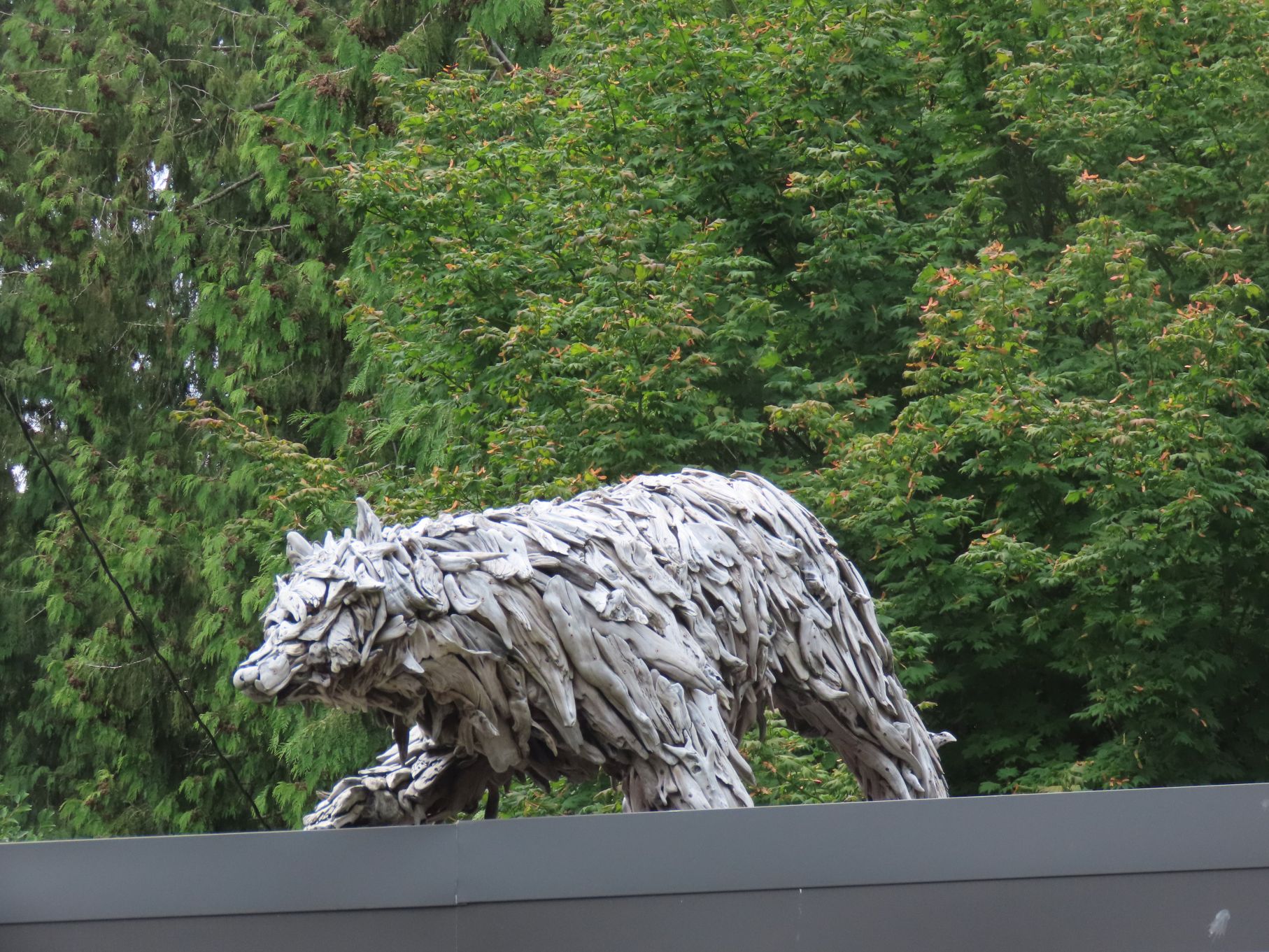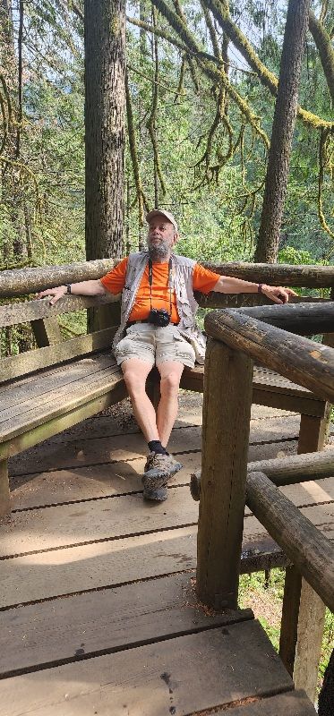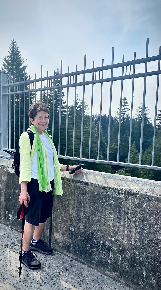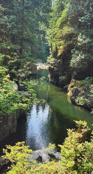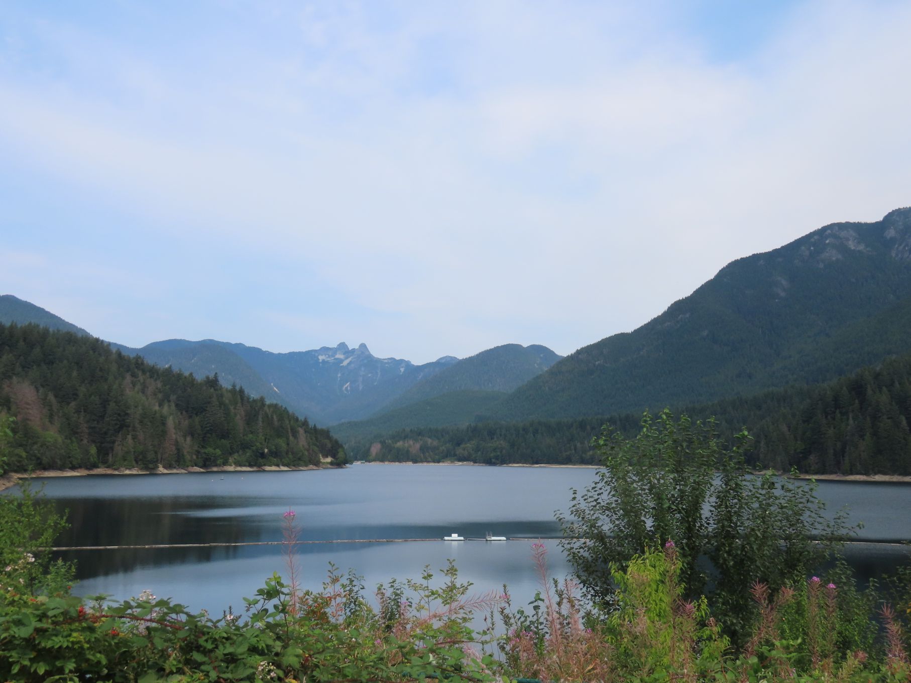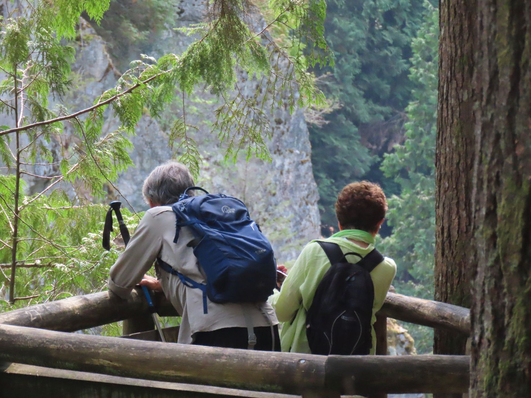 The Capilano Pacific Trail follows the west side of Capilano River uphill through dappled forest to Cleveland Dam, which we crossed to reach the east side of the river, exclaiming at the low level of the river. Snacks were consumed at a picnic table there, before our walk resumed, downhill through the salmon hatchery, passing by various bridges and viewpoints overlooking the river, eventually reaching Capilano Road, which we crossed at Eldon Road.