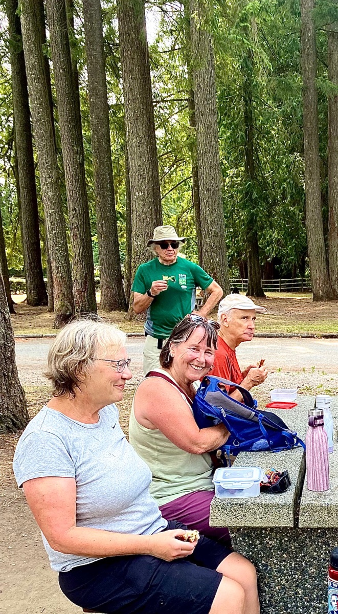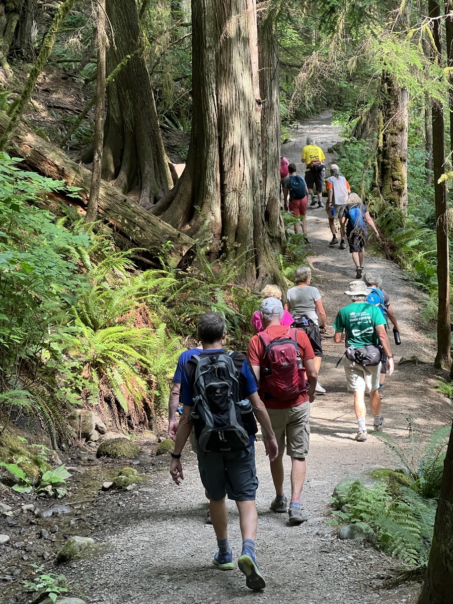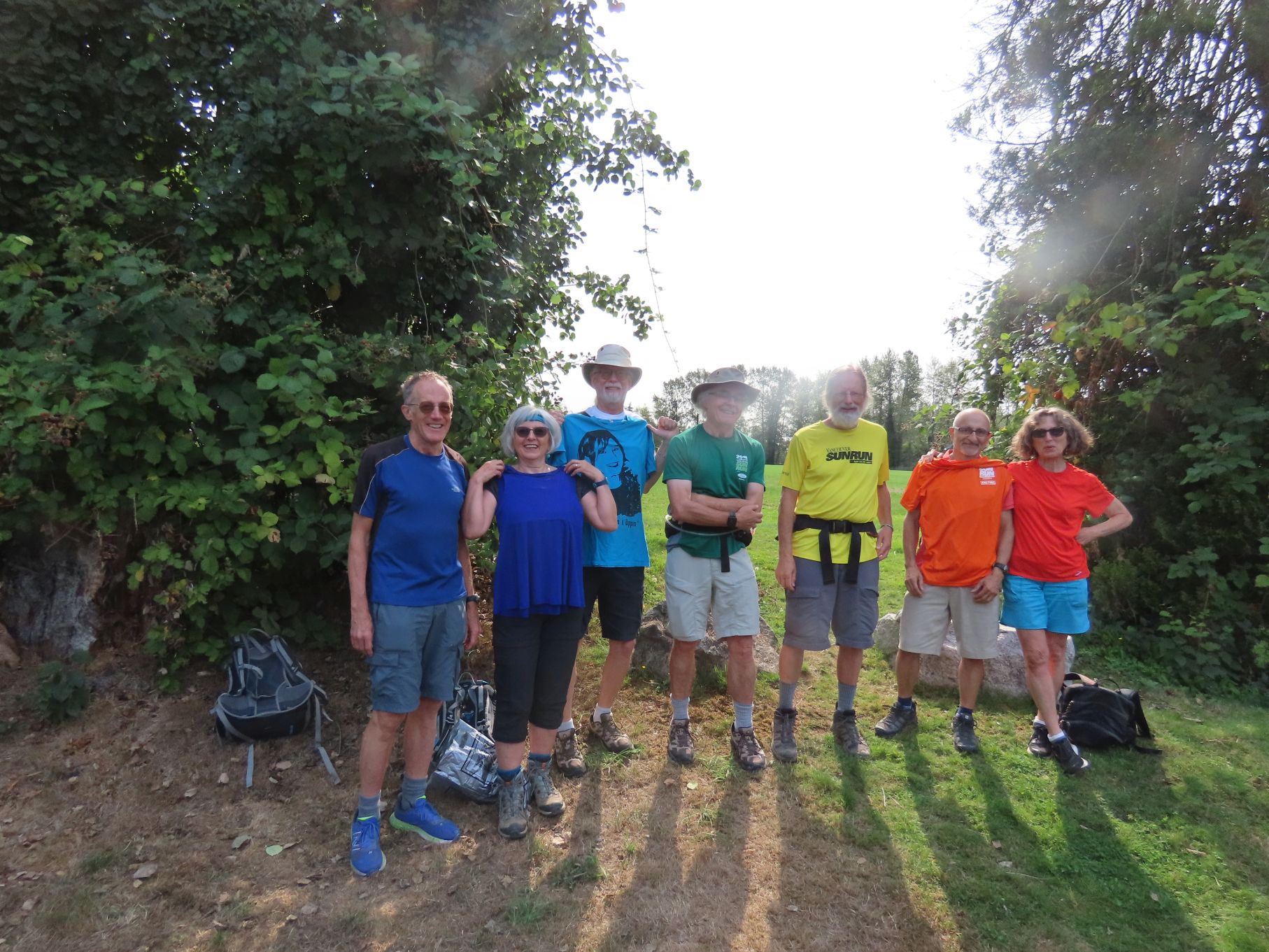 We started at the standard time of 10:30, at Hugo Ray Park in West Vancouver, just below the Capilano View Cemetery. As well as the traditional starting selfie (above), we posed for a Pride Day photo in a rainbow array of t-shirts courtesy of Angela and Dave, whose t-shirt collection is legendary.