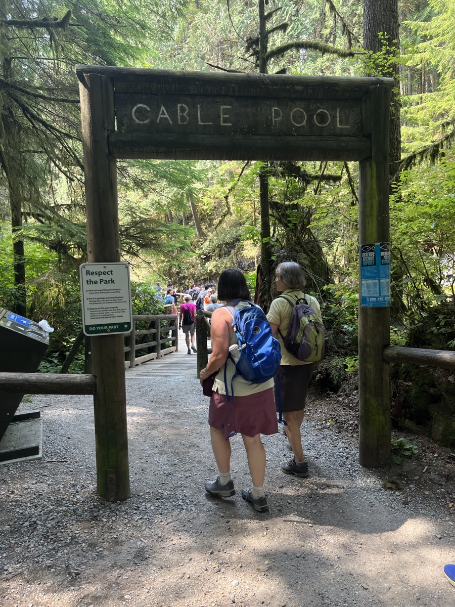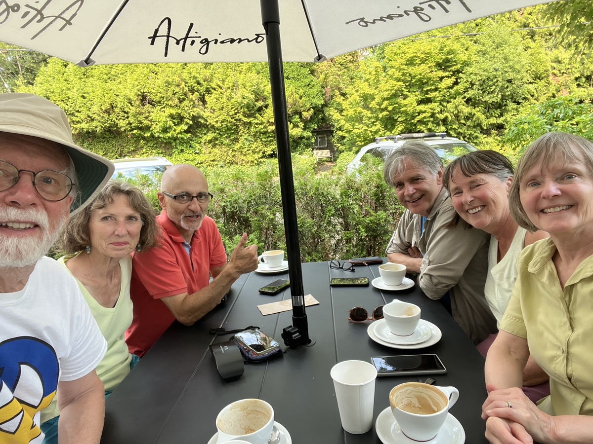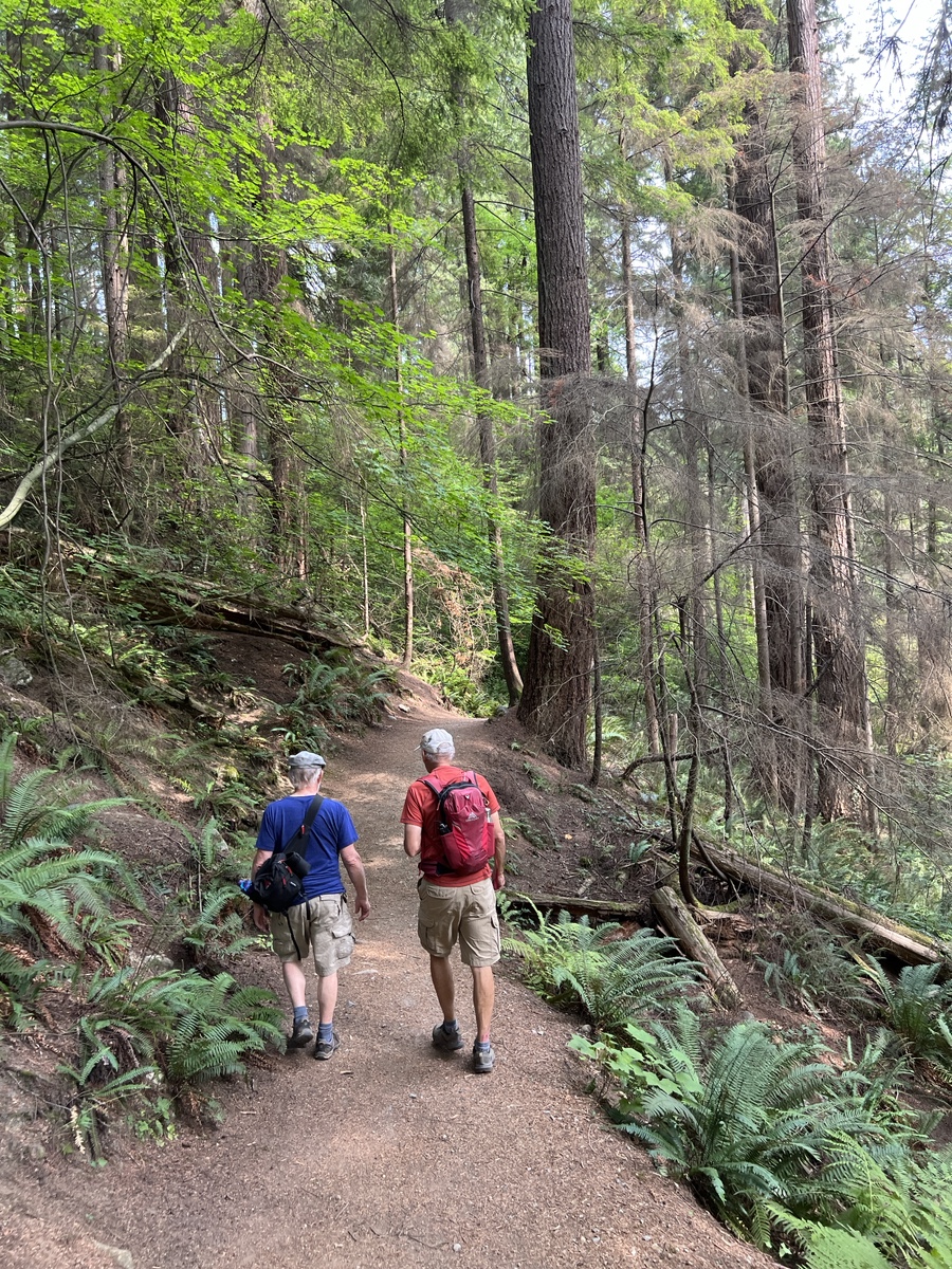 We started at the standard time of 10:30, at Hugo Ray Park in West Vancouver, just below the Capilano View Cemetery. As well as the traditional starting selfie (above), we posed for a Pride Day photo in a rainbow array of t-shirts courtesy of Angela and Dave, whose t-shirt collection is legendary.