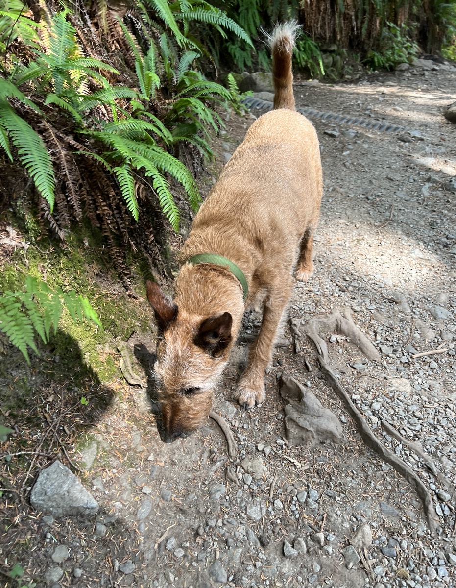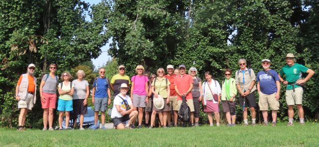 There are lurkers in the back row of the starting selfie (above), which makes it difficult to obtain an accurate head-count. My recollection, though, is that we were twenty heads (and therefor forty feet, equally divided between lefts and rights), including one first-time guest walker, and an occasional Looper, visiting from Ontario. I must also mention that we were accompanied on this occasion by Brogan the Magnificent, our official guard dog, who behaved very properly throughout (NB: the author has no way of determining if he has spelled Brogan’s name correctly, since Brogan refused to show his papers when asked, claiming to have “left them in the car”. A further NB: to anticipate our resident pedants—who undoubtedly know who they are—I should point out that, if we are to include Brogan the Magnificent as one of us, then the above numbers would need to be revised to: twenty-one heads, and forty-four feet).