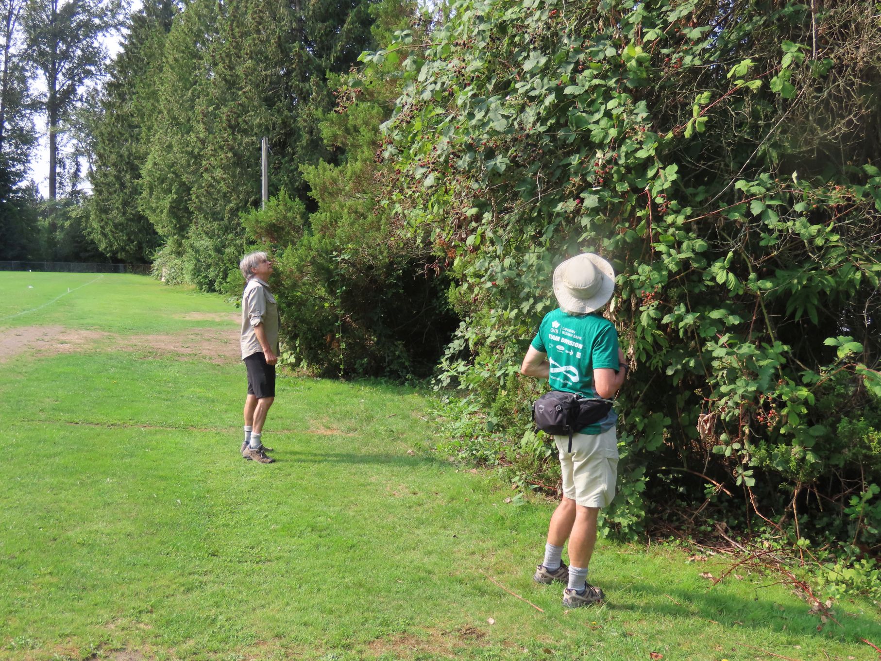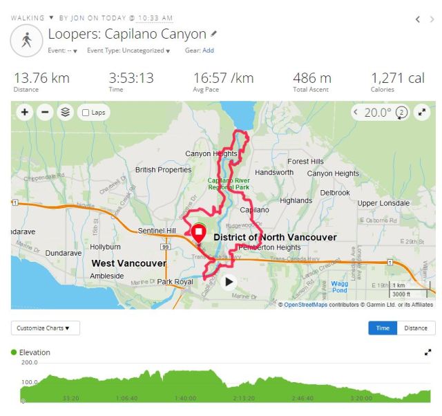 To close our loop we crossed Capilano Road to a staircase which led (through wasps! Two Loopers—and Brogan the Magnificent—were stung) to a path along the river bank. We crossed the river via the private bridge at Fullerton Ave, which serves several apartment towers on the West Vancouver side. Thanks to the kindness of the resident security guards, we were allowed to cross this sacred land to reach Keith Road, which we followed north, beneath the highway bridge, back to our starting point.