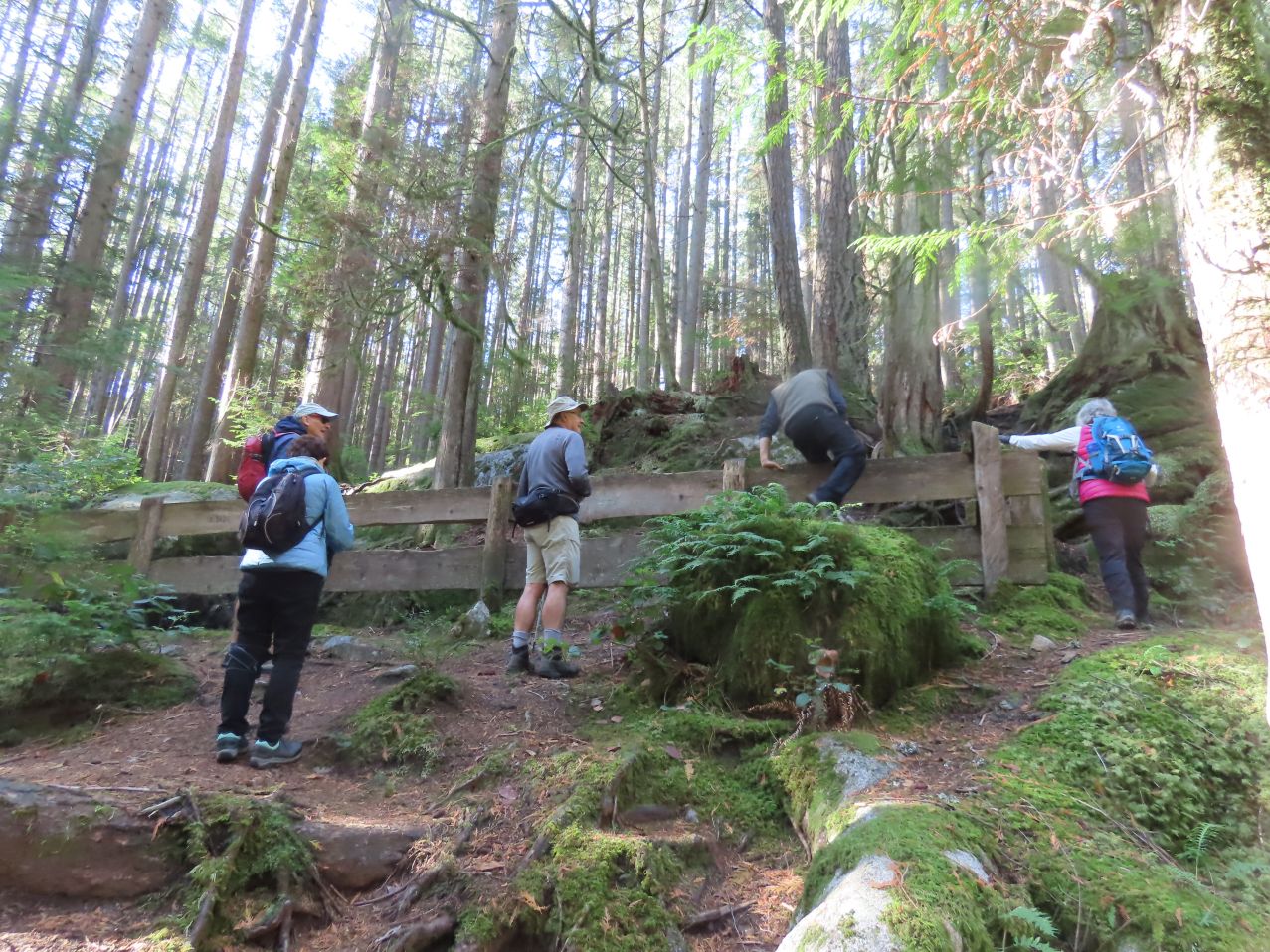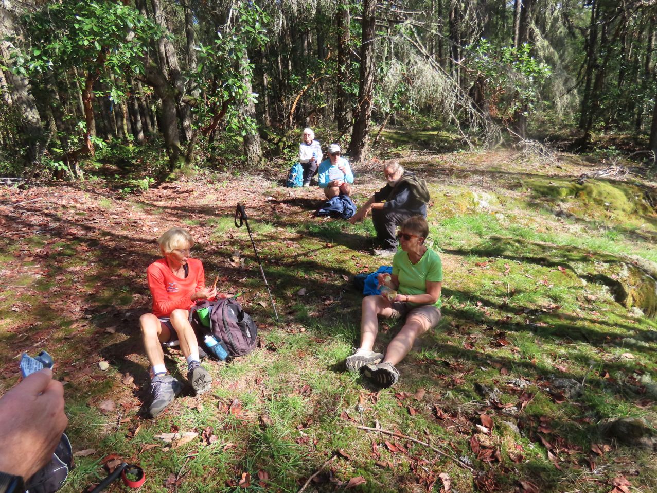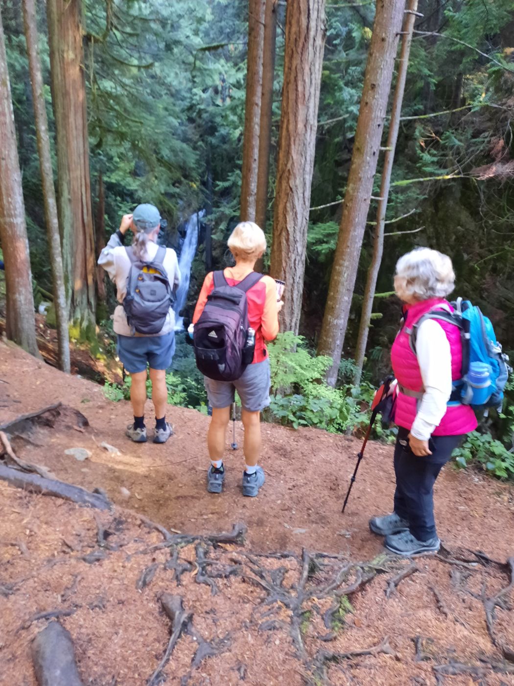 A somewhat smaller than usual group of eight Loopers met at the Cypress Falls parking lot on what was a fine Fall morning. After posing for the starting selfie, we plunged into the woods. A short way along we could see the first waterfall ahead. As we approached, there was a fence with dire warnings posted about not crossing it. This was the first of many warning signs observed during the day. Some were on protective fences, while others warned of steep drops and risks of injury. The trail runs back and forth between the park and the British Properties and at every boundary point was a large sign warning that we entered at our own risk and that any attempt to build a temporary or permanent structure would have serious consequences. Finally, there were more signs warning us to stay out of the Eagle Lake watershed. We took particular offence at an official looking sign on a road barrier stating that “Google is Wrong”. The sign claimed that the route did not provide access to Eagle Bluffs, which experienced hikers in the group knew was not true. Here endeth the rant about signs.