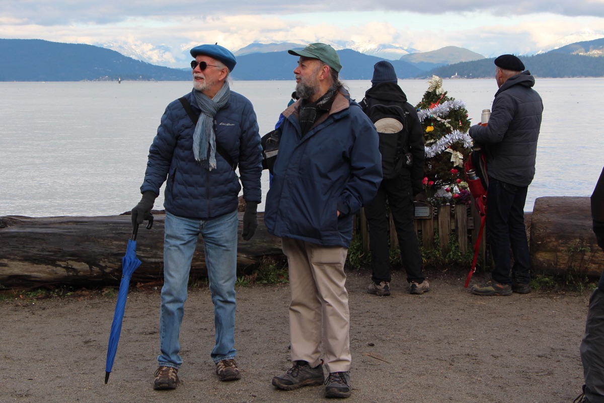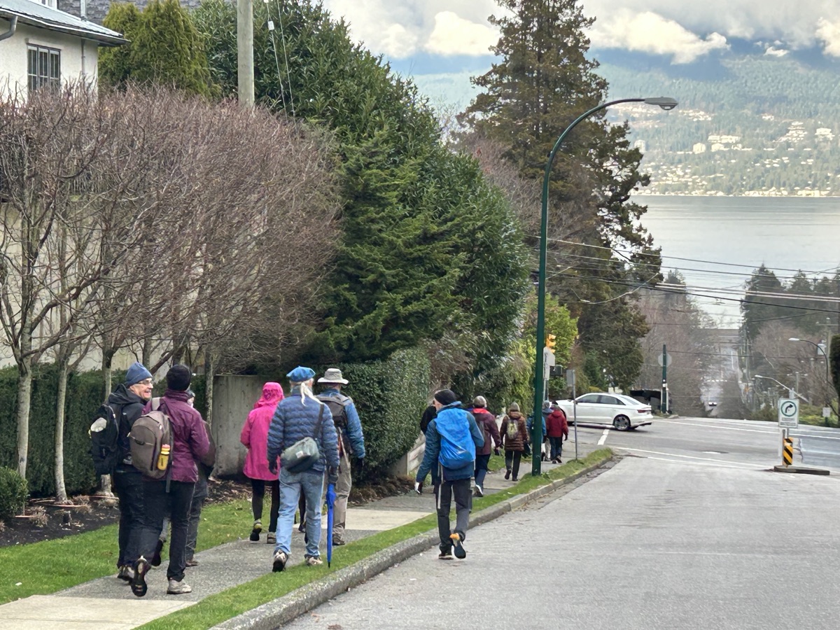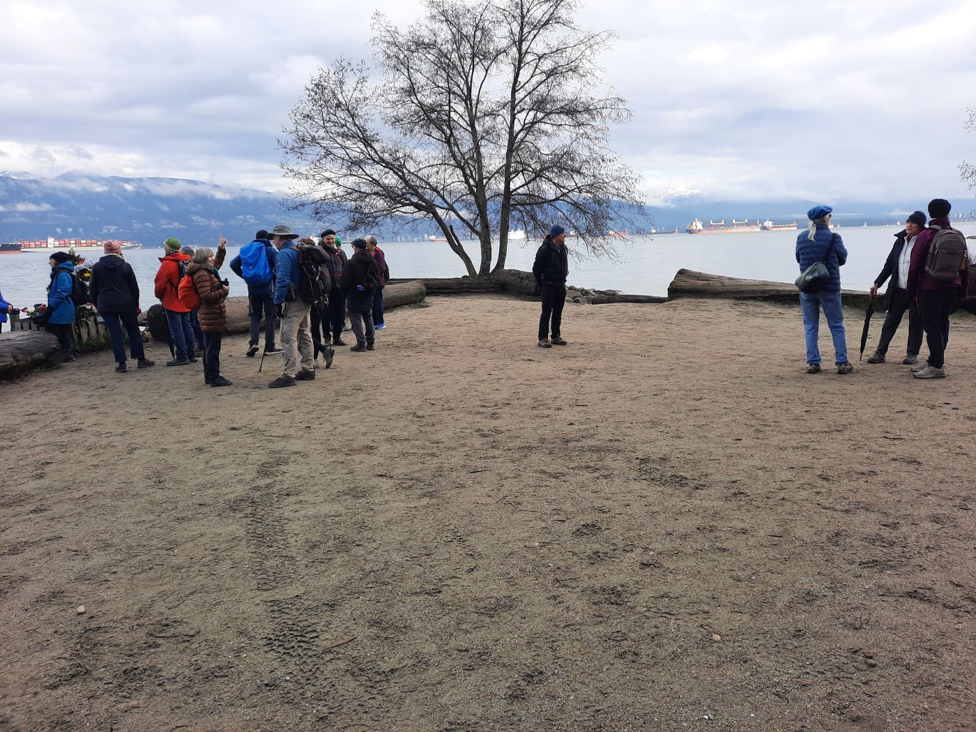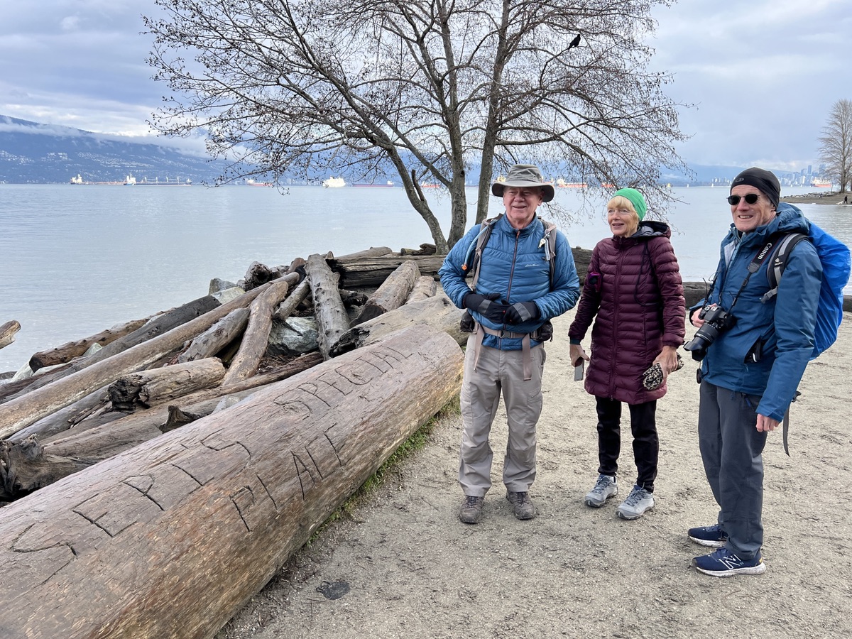 The meeting point was very familiar to those of us who’d spent time at the Vancouver Folk Music Festival at some point during its 46-year run, and the ghosts of Folk Festivals past were everywhere as we walked north from 4th Avenue towards the bridge for our starting selfie (above). The Festival’s main gate has always been at that south-east corner of the park; it was the starting point for each morning’s legendary “Birkenstock 500 Blanket Run” towards the Festival’s Main Stage; and Stage 3 was always in that grove of trees to our left. Post-selfie, Folk Fest regulars tried to visualize where they’d place their blankets for Folk Fest 2024, upcoming in mid-July: we imagined ourselves in warmer weather on our blankets somewhere in front of Main Stage, with our backs towards the glorious mountains of Vancouver’s North Shore and stars twinkling overhead. In the meantime, though, we had a walk to walk, a loop to Loop.