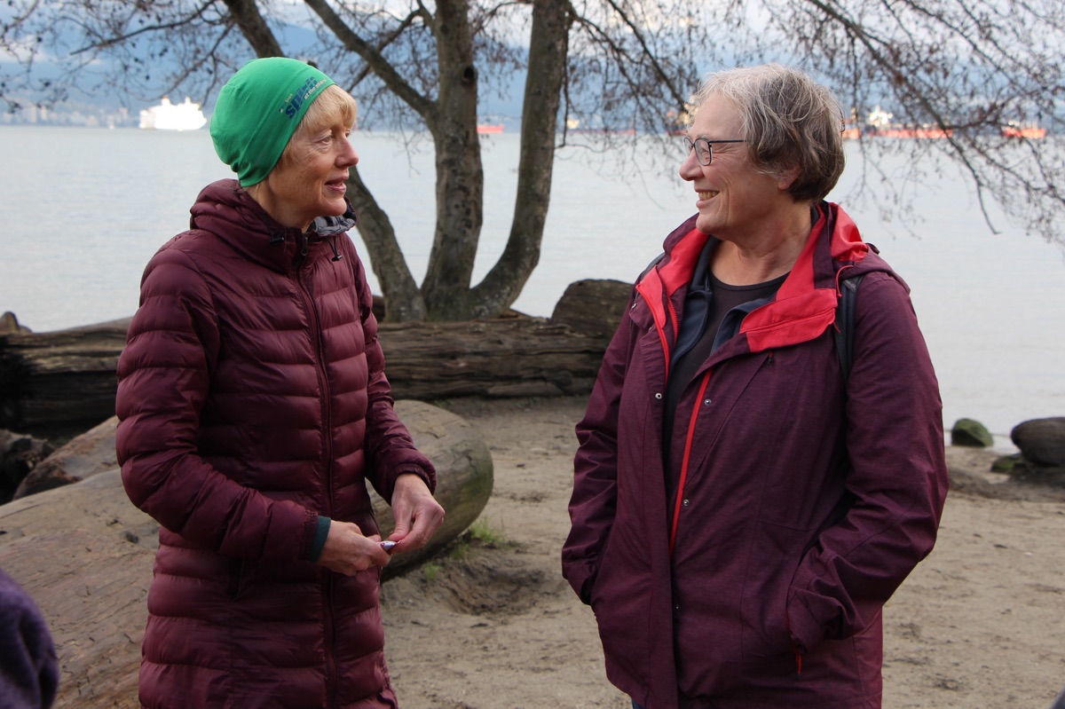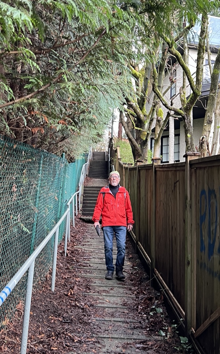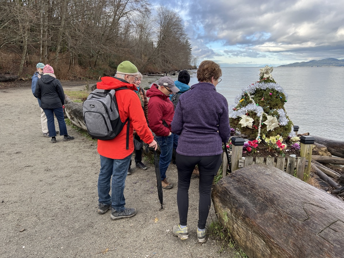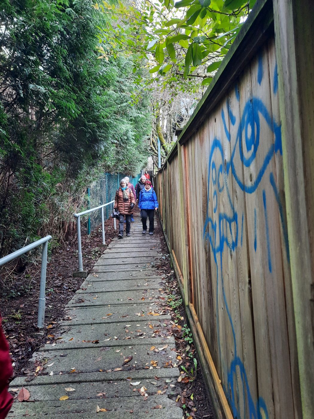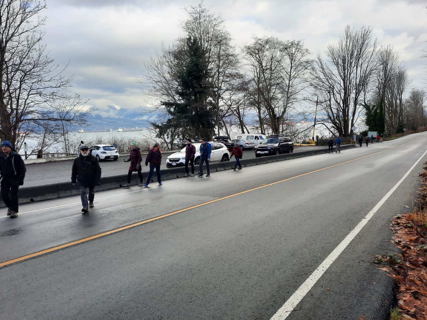 The meeting point was very familiar to those of us who’d spent time at the Vancouver Folk Music Festival at some point during its 46-year run, and the ghosts of Folk Festivals past were everywhere as we walked north from 4th Avenue towards the bridge for our starting selfie (above). The Festival’s main gate has always been at that south-east corner of the park; it was the starting point for each morning’s legendary “Birkenstock 500 Blanket Run” towards the Festival’s Main Stage; and Stage 3 was always in that grove of trees to our left. Post-selfie, Folk Fest regulars tried to visualize where they’d place their blankets for Folk Fest 2024, upcoming in mid-July: we imagined ourselves in warmer weather on our blankets somewhere in front of Main Stage, with our backs towards the glorious mountains of Vancouver’s North Shore and stars twinkling overhead. In the meantime, though, we had a walk to walk, a loop to Loop.