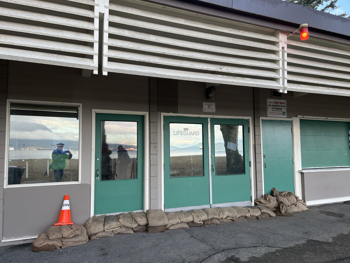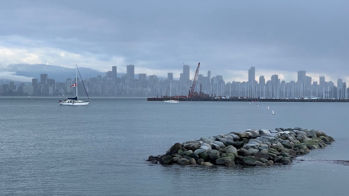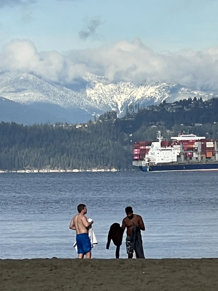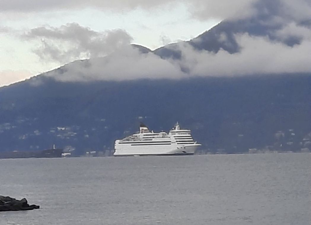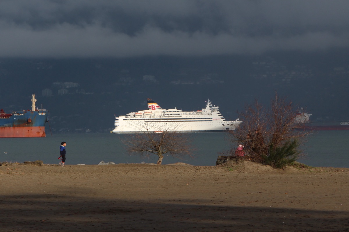 Next up on our route was the Jericho Sailing Centre, followed closely by Jericho Pier, damaged in a winter storm but now slated for repair. Then through Locarno Beach Park to Spanish Banks, the first of a long stretch of beach-front parks which lead one inexorably to Wreck Beach and optional nudity (not, I imagine, all that popular at this time of year). Spotlit by the sun, a small white cruise ship lay at anchor offshore. This month’s leader and tour guide notes that this mysterious cruise ship is intended to serve as a floating hotel for pipeline construction workers (see here for more info).