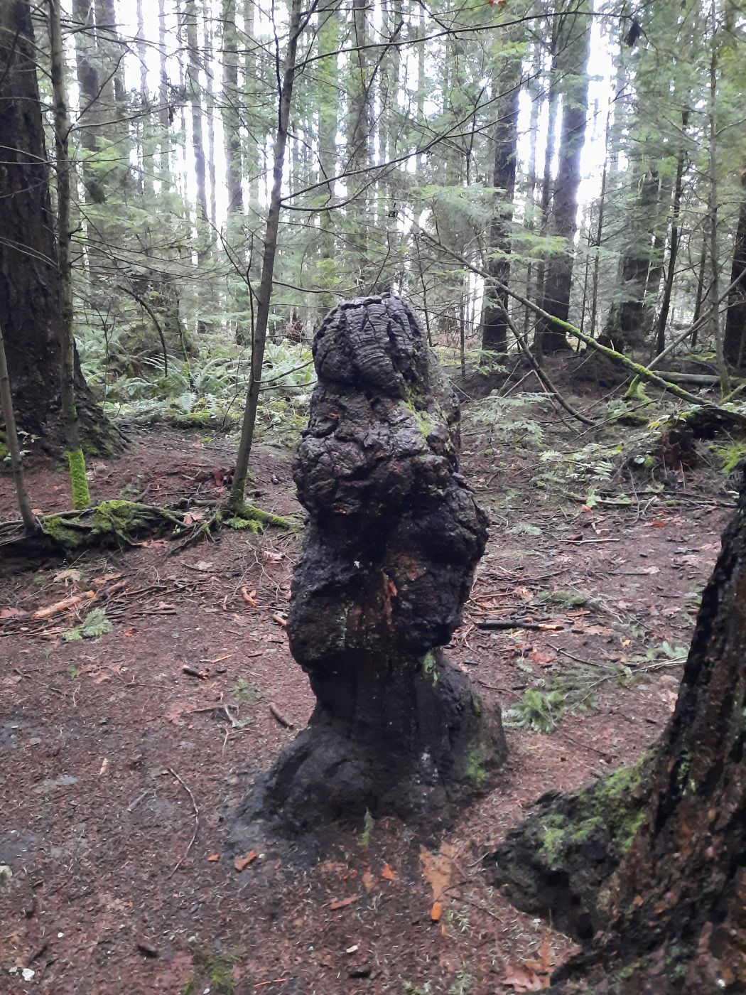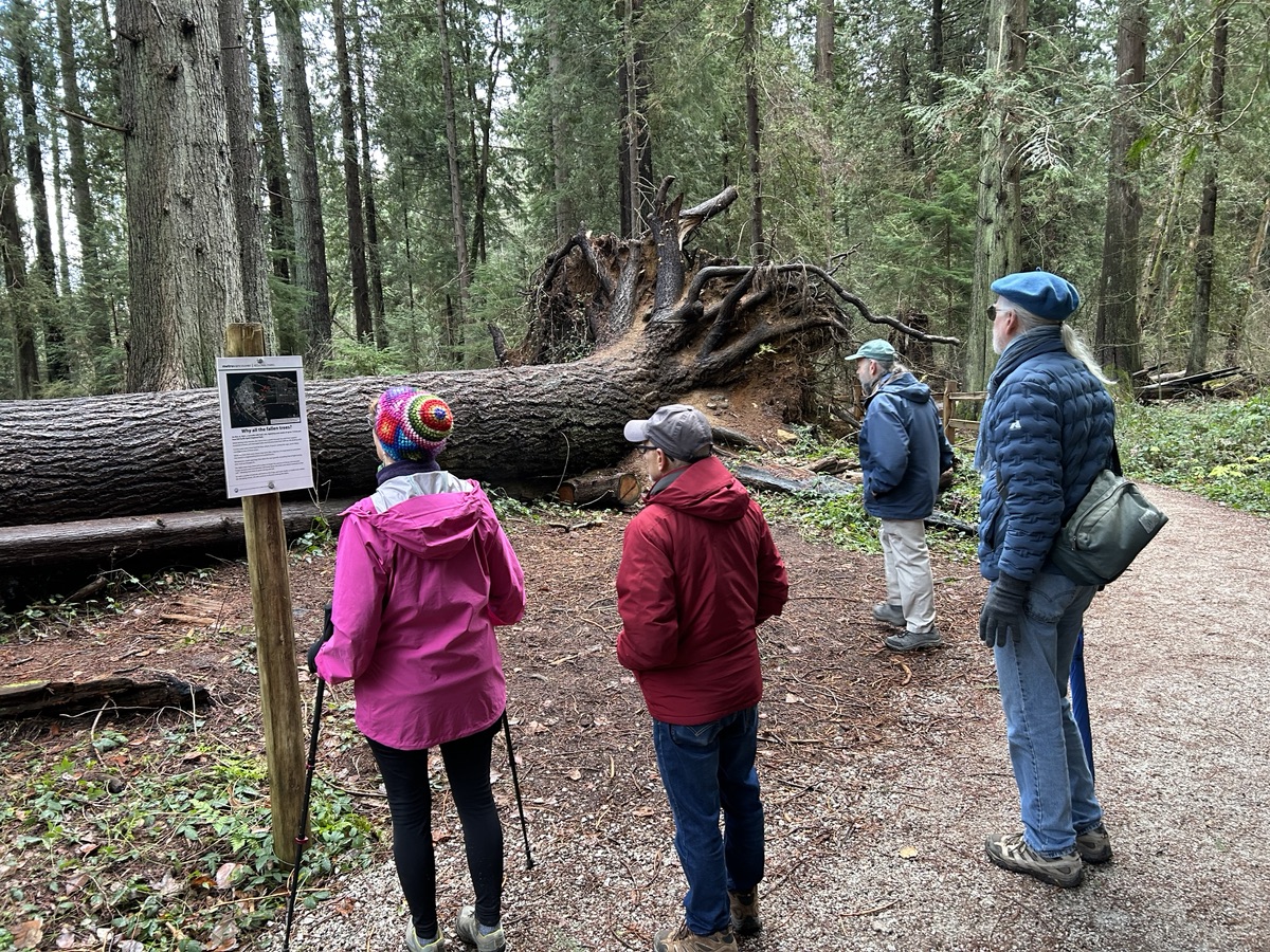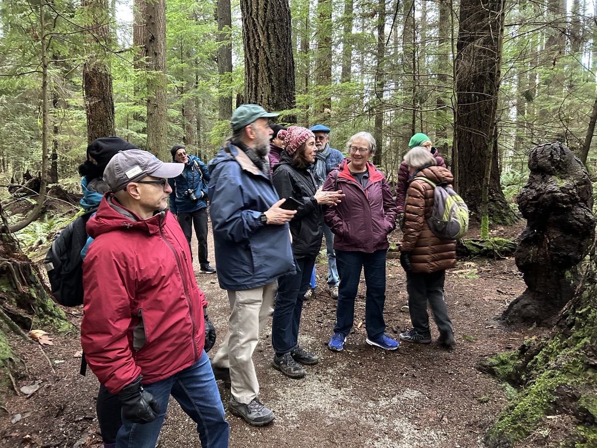 South of University Boulevard we re-entered Pacific Spirit Park, following trails which skirted the perimeter of the golf course of the University Golf Club. Along the way we paused to consider a forest giant, felled by a windstorm, and to pay homage to a decorative stamp known to many (well: to our leader, at the very least) as Mr. Grumpy Stump. As a measure of his fame, a rap song has recently been composed in honour of Mr. Grumpy Stump; you are encouraged to boogaloo along to it here.