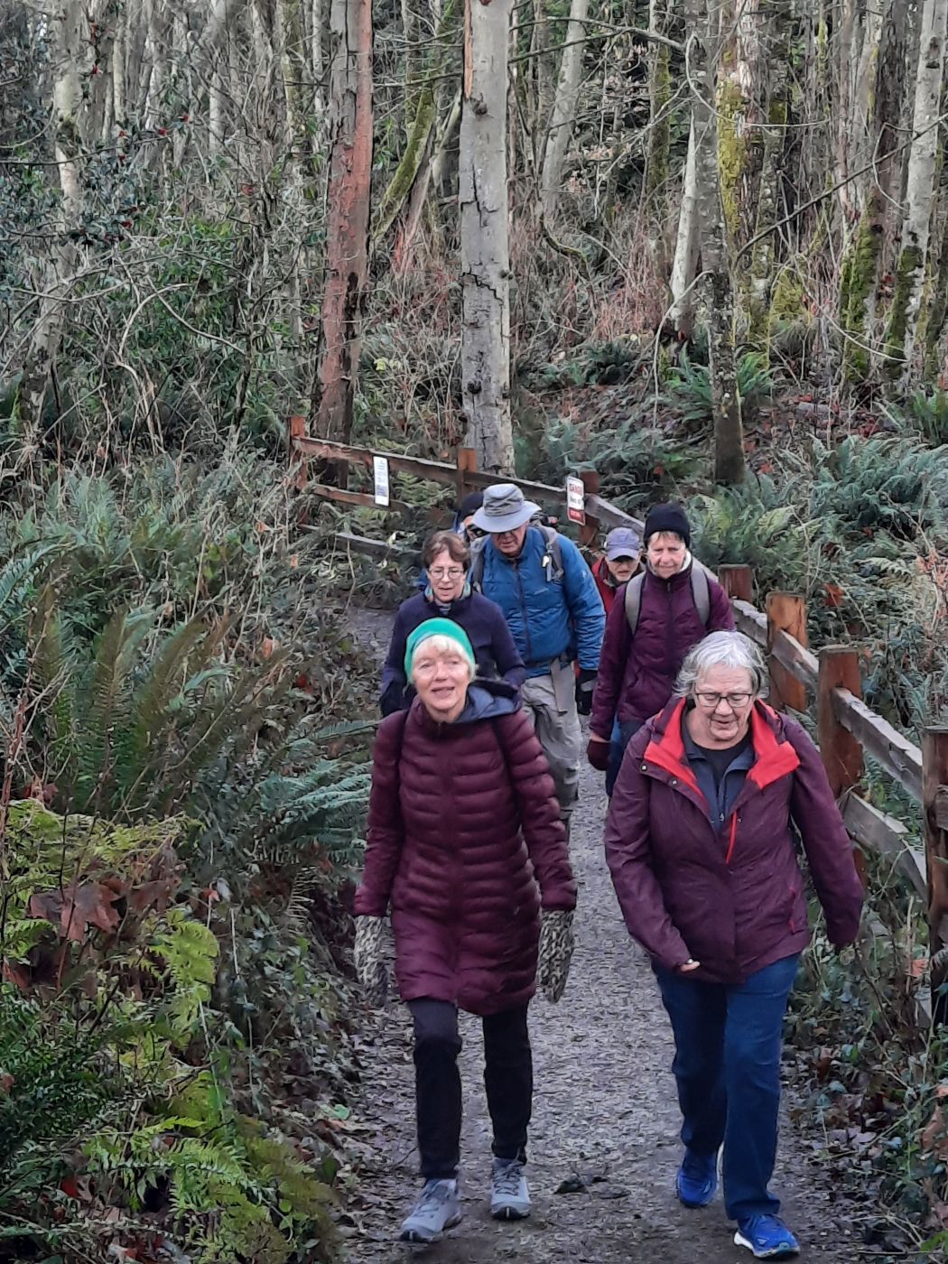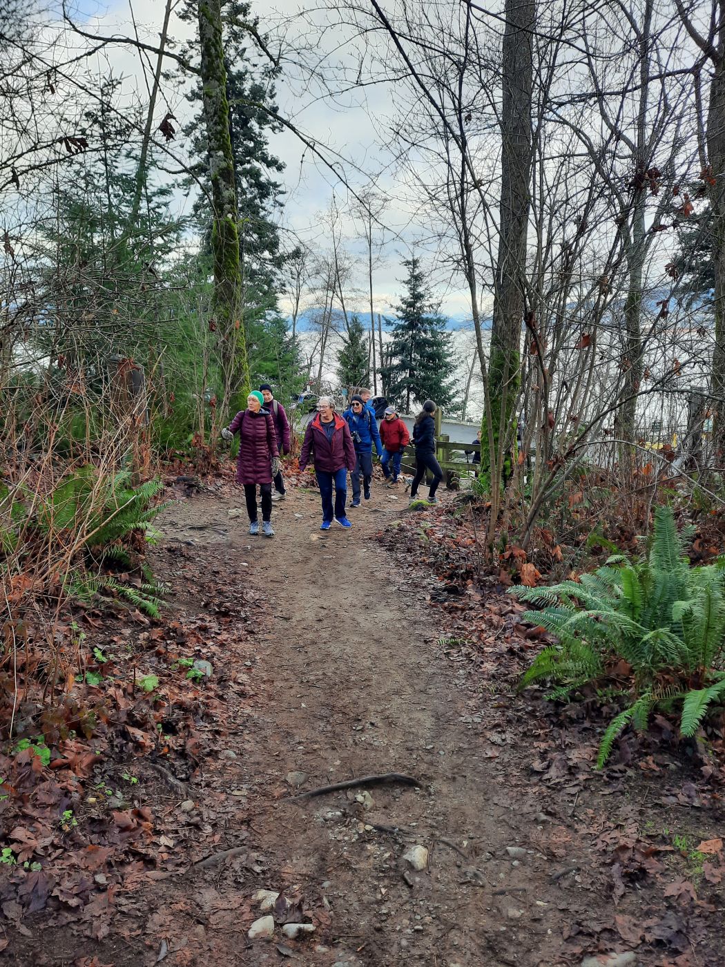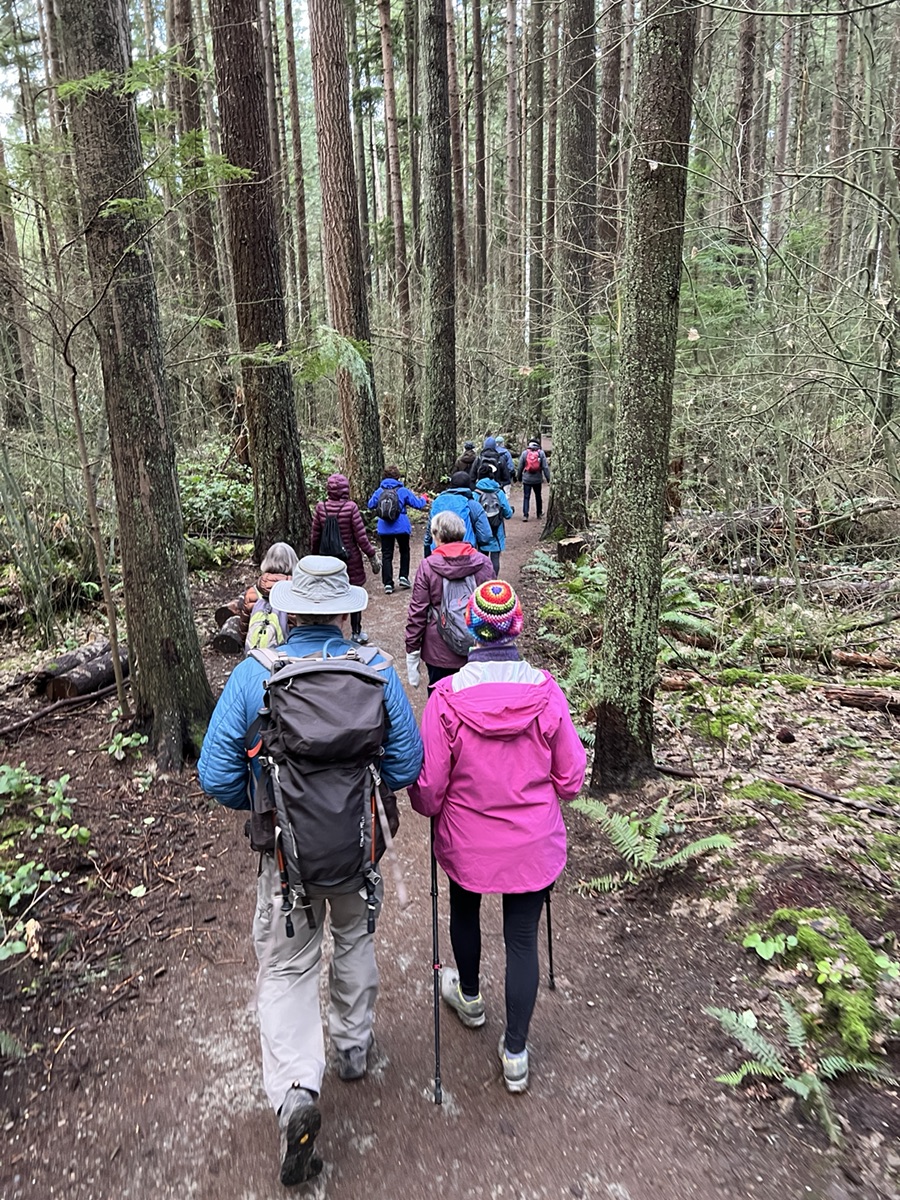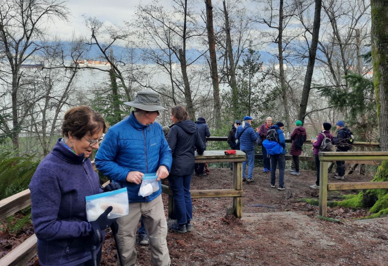After pausing briefly at a seaside memorial known to some as Sepi’s Special Place, we crossed N W Marine Drive and entered the woods of Pacific Spirit Park, following a trail which led us towards the top of the escarpment, where we paused for a snack break with views to the north.