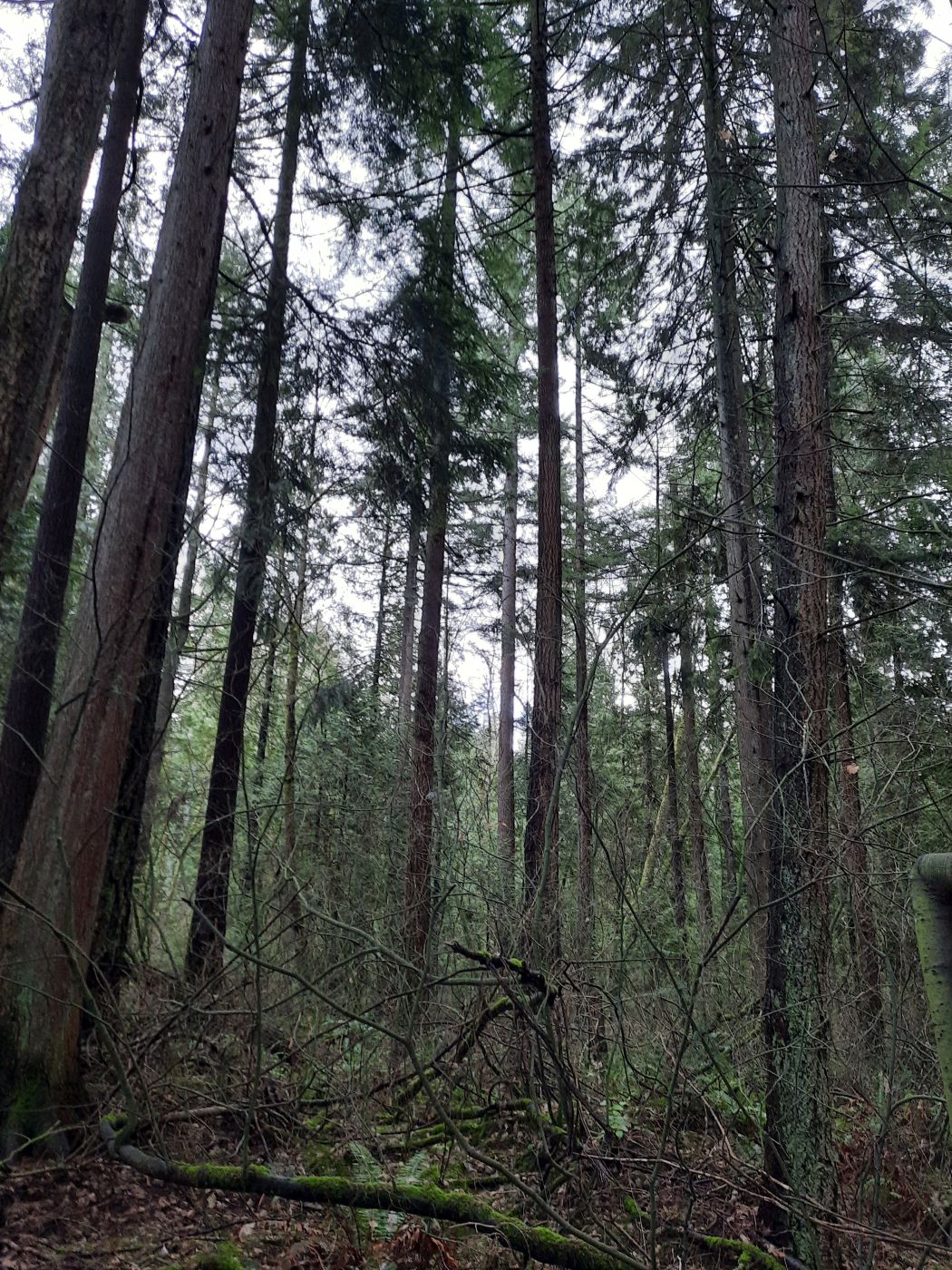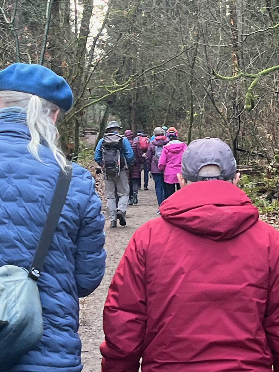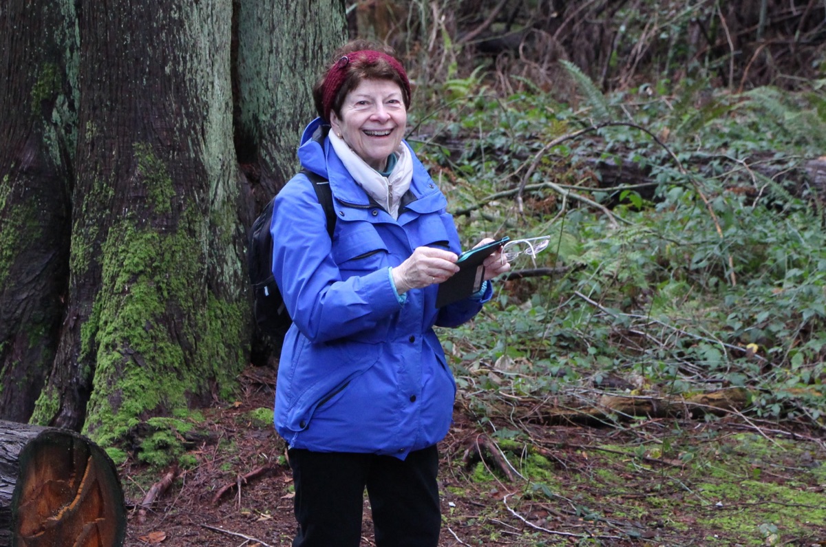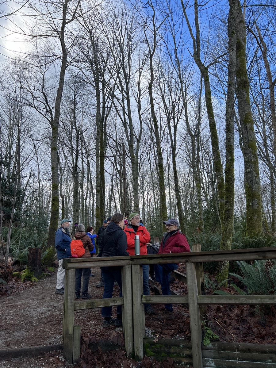 After pausing briefly at a seaside memorial known to some as Sepi’s Special Place, we crossed N W Marine Drive and entered the woods of Pacific Spirit Park, following a trail which led us towards the top of the escarpment, where we paused for a snack break with views to the north.