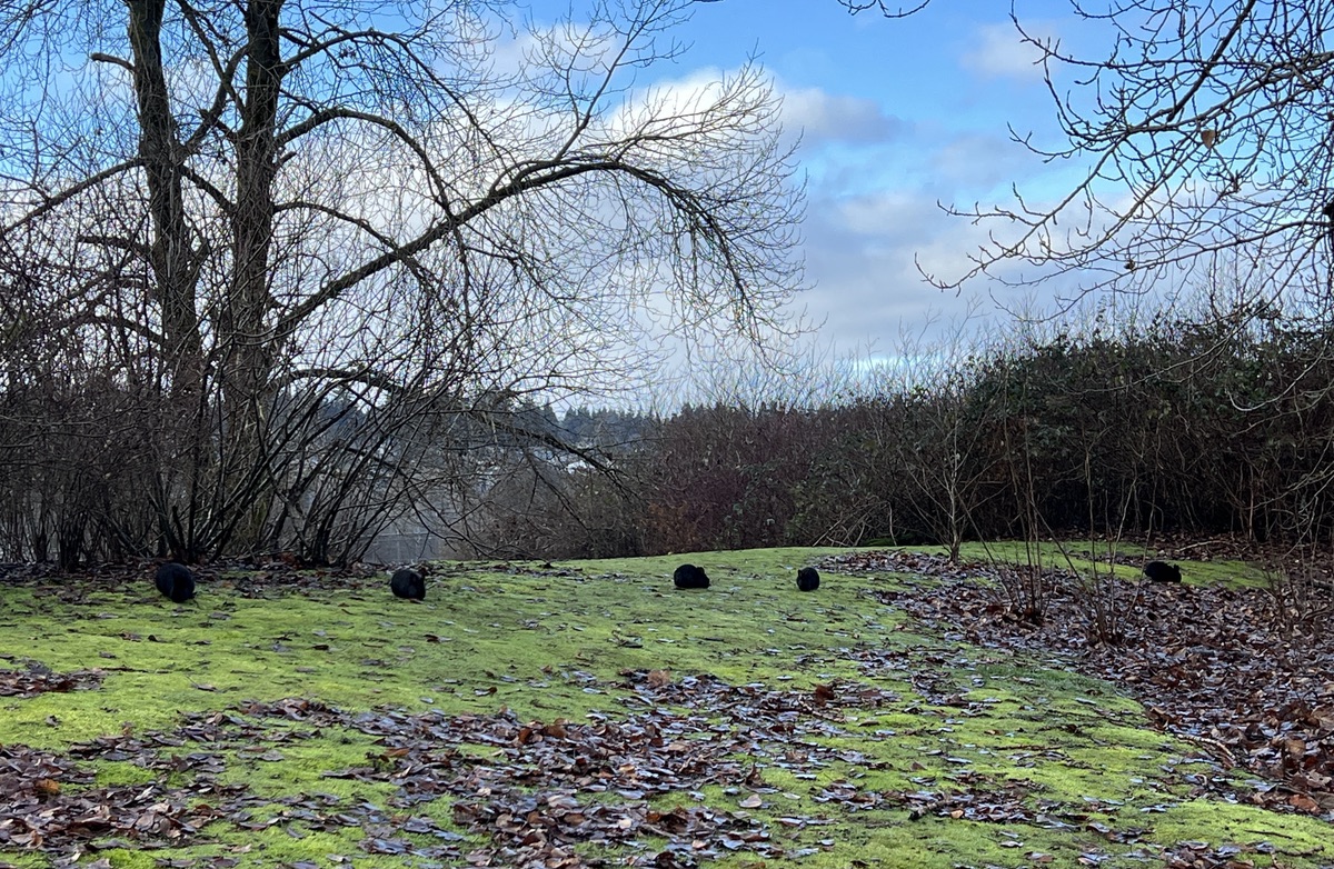 As explained elsewhere, this year’s Looper theme is “Follow the Leader”, with each month’s walk being planned and led by an individual Looper, sometimes two. For January’s walk, Looper Jon had planned a route through Pacific Spirit Park, the route continuing west from our starting point, through Jericho Park, taking us at great personal risk near an ominous colony of black bunnies, who no doubt spend their days nibbling on grass and plotting to take over the world.