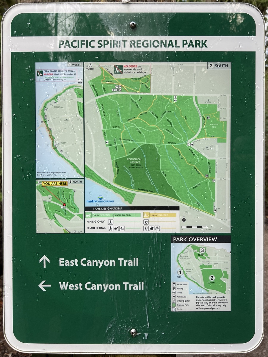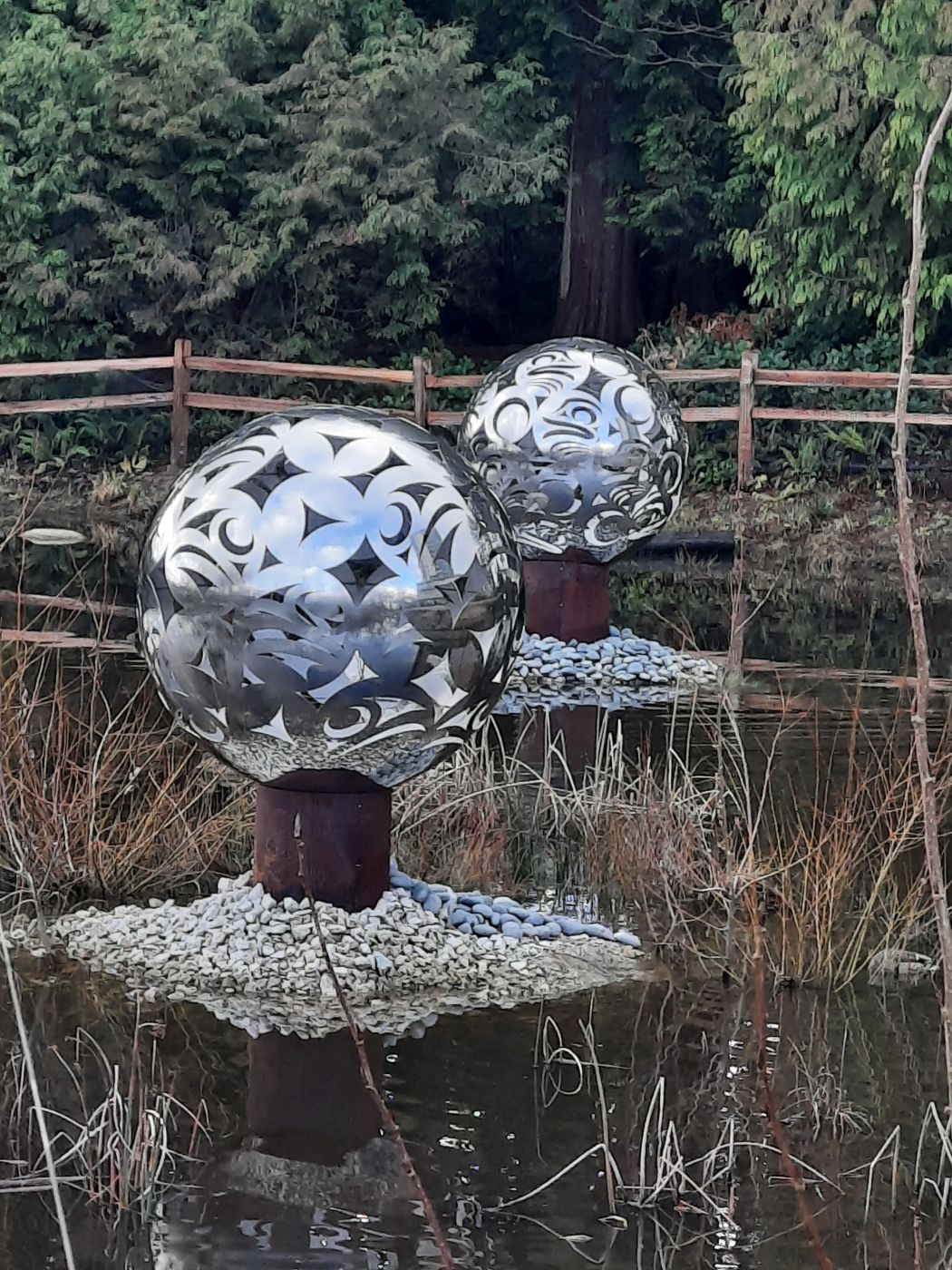 After our snack break, we continued along the trails through Pacific Spirit Park, crossing Chancellor Boulevard, and—eventually—University Boulevard, where we admired a new development featuring stainless steel spheres decorated with an indigenous motif (one can never have enough stainless steel spheres decorated with indigenous motifs).